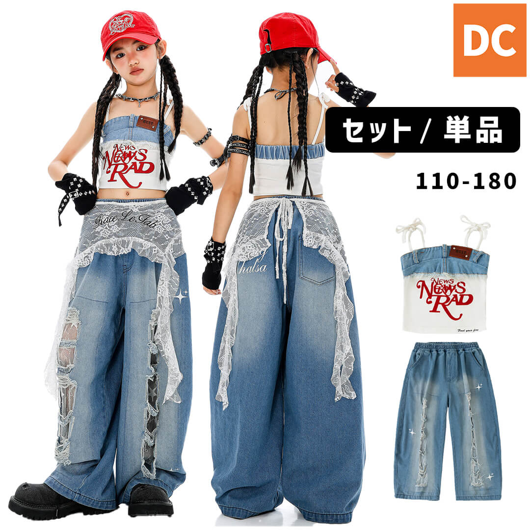 【クリアランスセール】すぐ届く!HIPHOP衣装 キッズダンス ユニセックス サロペット デニム オーバーオール ブラック ホワイト セットアップ 即納【sale-181】