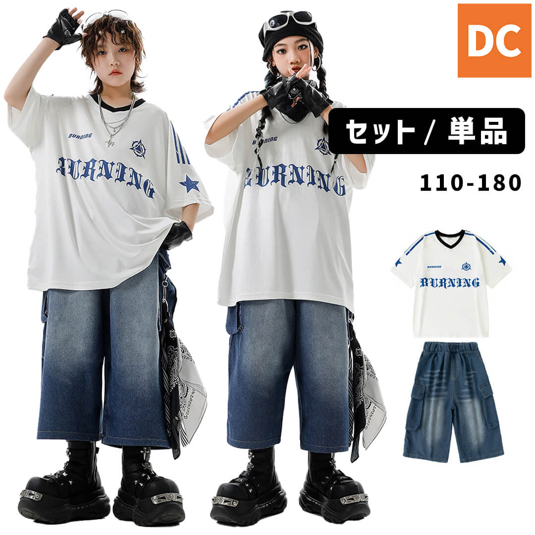 ユニセックス ストリート デニム 派手 Tシャツ 半袖 ロングパンツ オレンジ ブルー ロゴトップス オーバーサイズ【dc-2078】