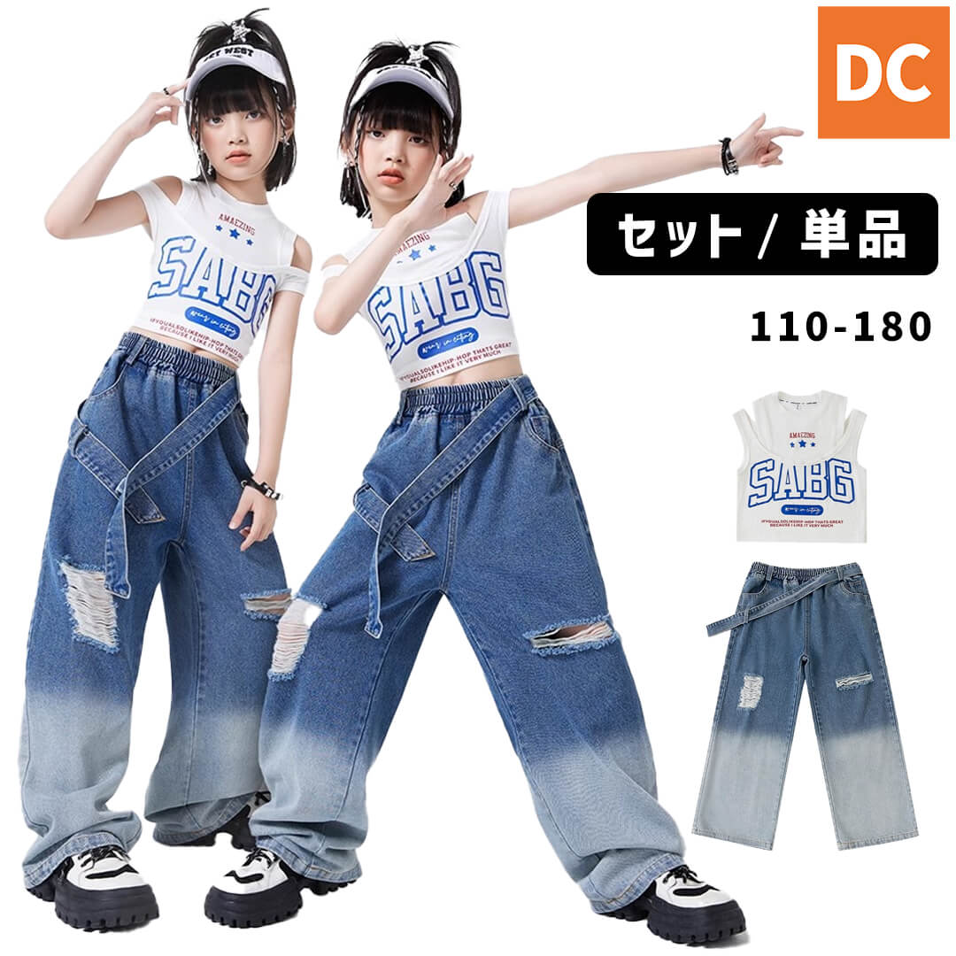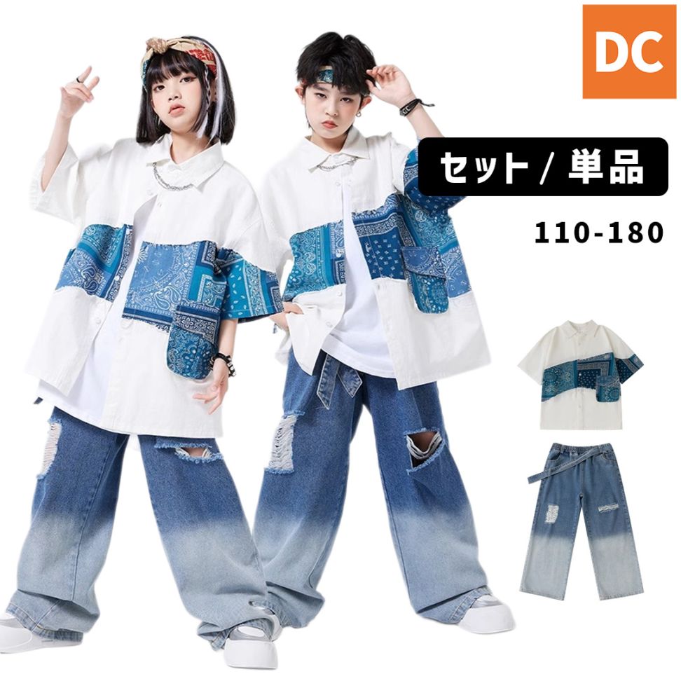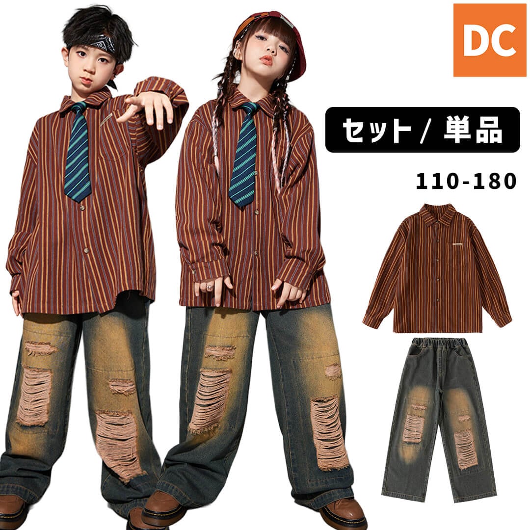 ユニセックス ストリート ダボダボ ストライプ デニム 長袖シャツ 長袖 ロングパンツ 前開きシャツ HIPHOP衣装 キッズダンス衣装 110~180【dc-1831】