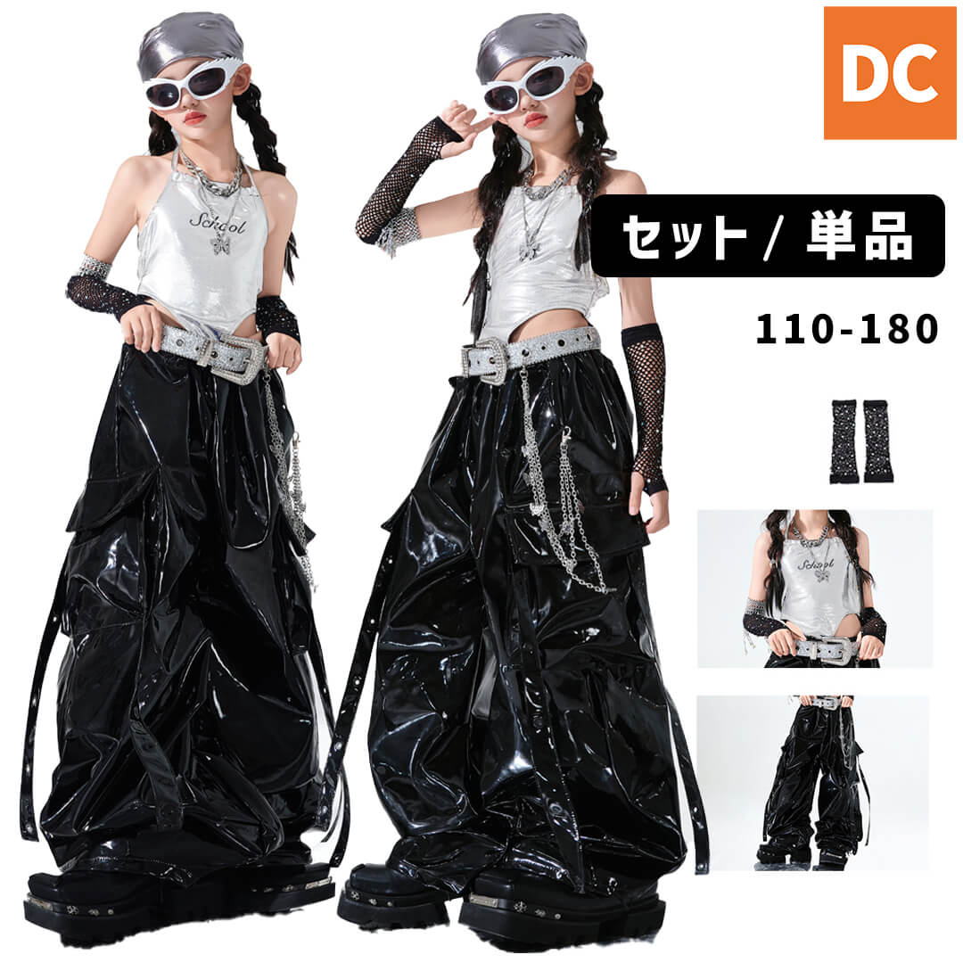 ガールズ 韓国 kpop ブラック シルバー へそ出し ロングパンツ 肩出しトップス アームカバー【dc-2185】