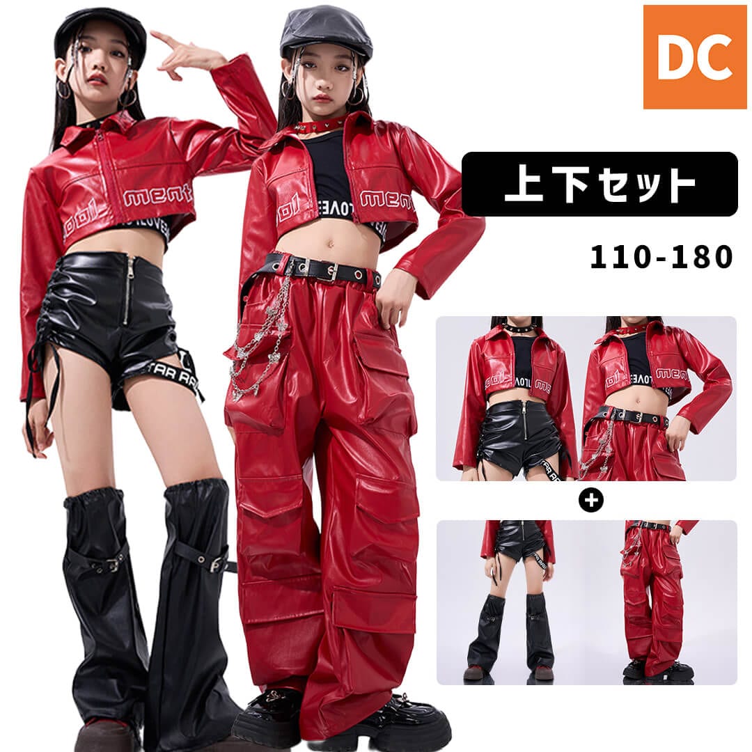 ガールズ 韓国 kpop ブラック レッド ジッパー 半袖 ロングパンツ へそ出し クロップド丈 【dc-2198】