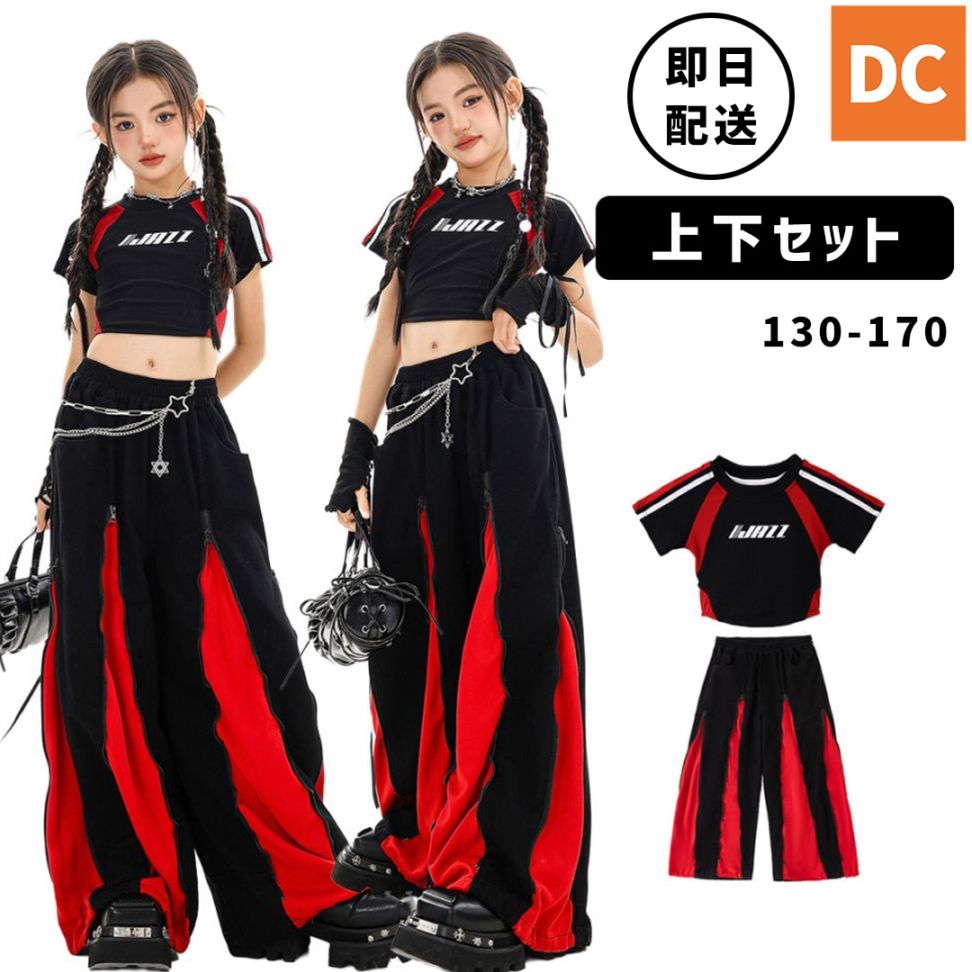 【即日配送】すぐ届く!ガールズ 韓国 kpop ブラック レッド ジッパー 半袖 ロングパンツ へそ出し クロップド丈 【dc-2198s】