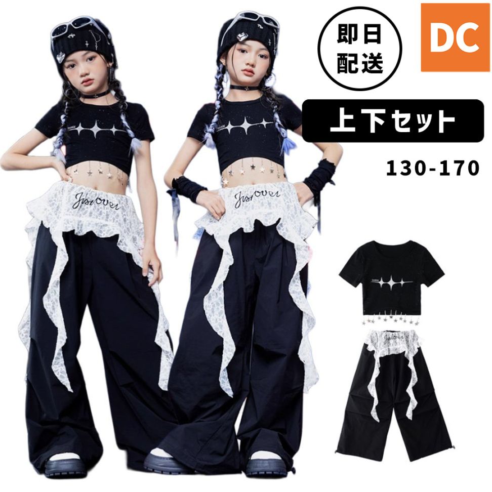 【即日配送】すぐ届く!ガールズ kpop 韓国 ホワイト ブラック モノトーン 半袖トップス アイドル フリルレイヤード ロゴパンツ チーム衣装 【dc-1983s】