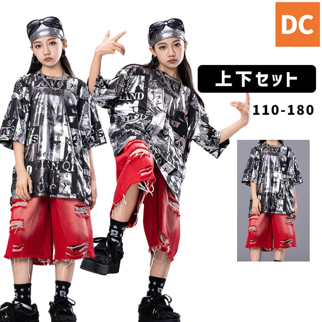 ユニセックス 柄トップス 半袖 デニム レッド 短パン ハーフパンツ ダメージ HIPHOP衣装 キッズダンス衣装 110~180【dc-1755】