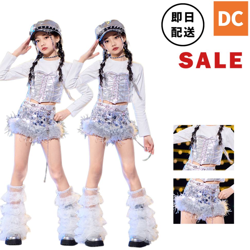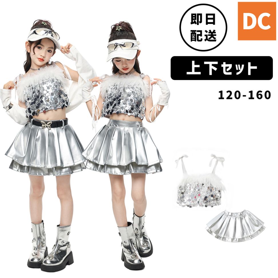 ガールズJAZZ キッズダンス HIPHOP K-POP キッズ衣装 モノトーン シルバー ブラック フリル スパンコール 110~180【dc-1646】