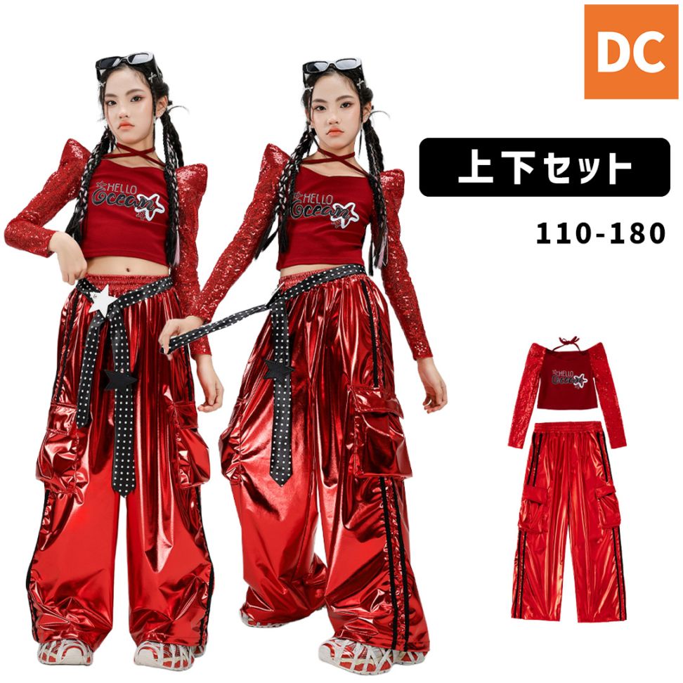 ガールズ K-POP 韓国 ブラック レッド ロングパンツ スパンコール シアー フェイクレザー へそ出し 長袖 キッズダンス キッズ衣装 110~180【dc-1895】