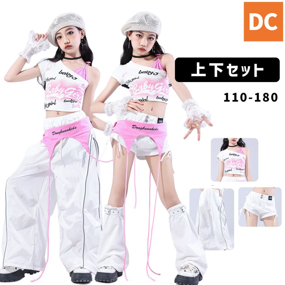韓国 kpop ホワイト ピンク ロングパンツ 腰ベルト レッグウォーマー ショーパン 半袖 肩だし【dc-2182】