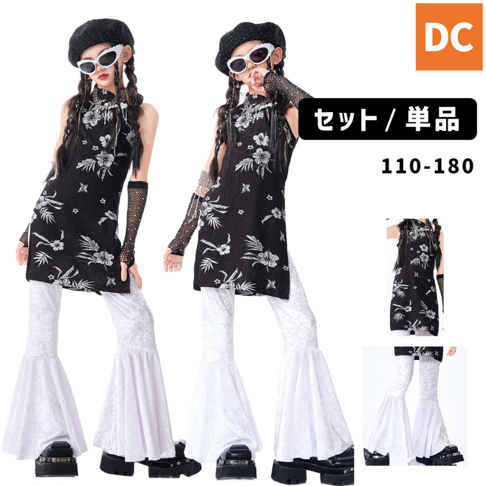 ガールズ 和柄チャイナ 中華 ブラック ホワイト ベロア タンクトップ フレアパンツ ロングパンツ チャイナ【dc-2193】