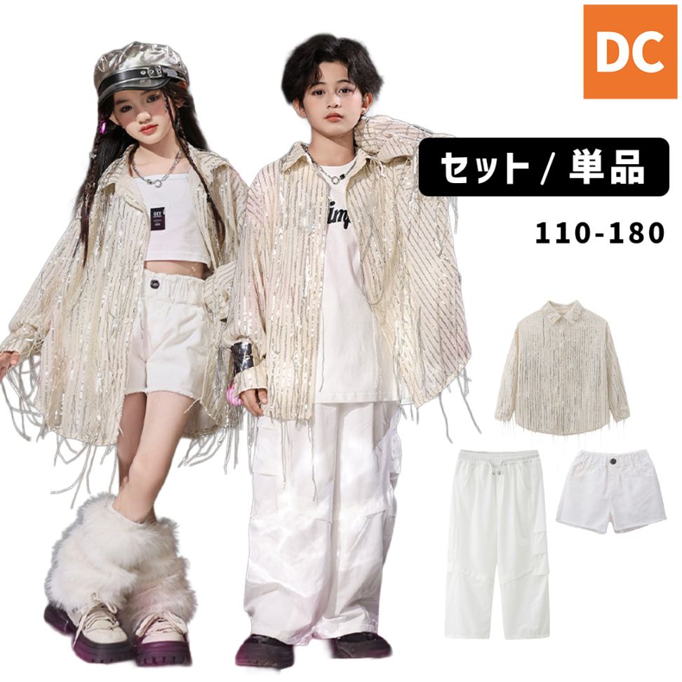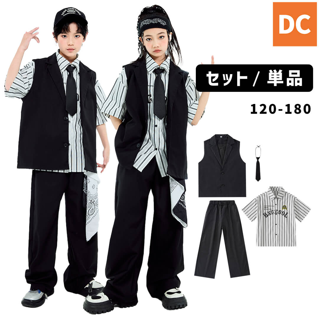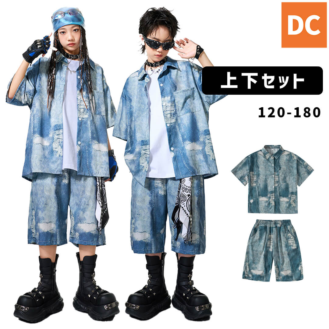 【即日配送】すぐ届く!ユニセックス ストリート ダボダボ ストライプ デニム 長袖シャツ 長袖 ロングパンツ 前開きシャツ HIPHOP衣装 キッズダンス衣装【dc-1831s】