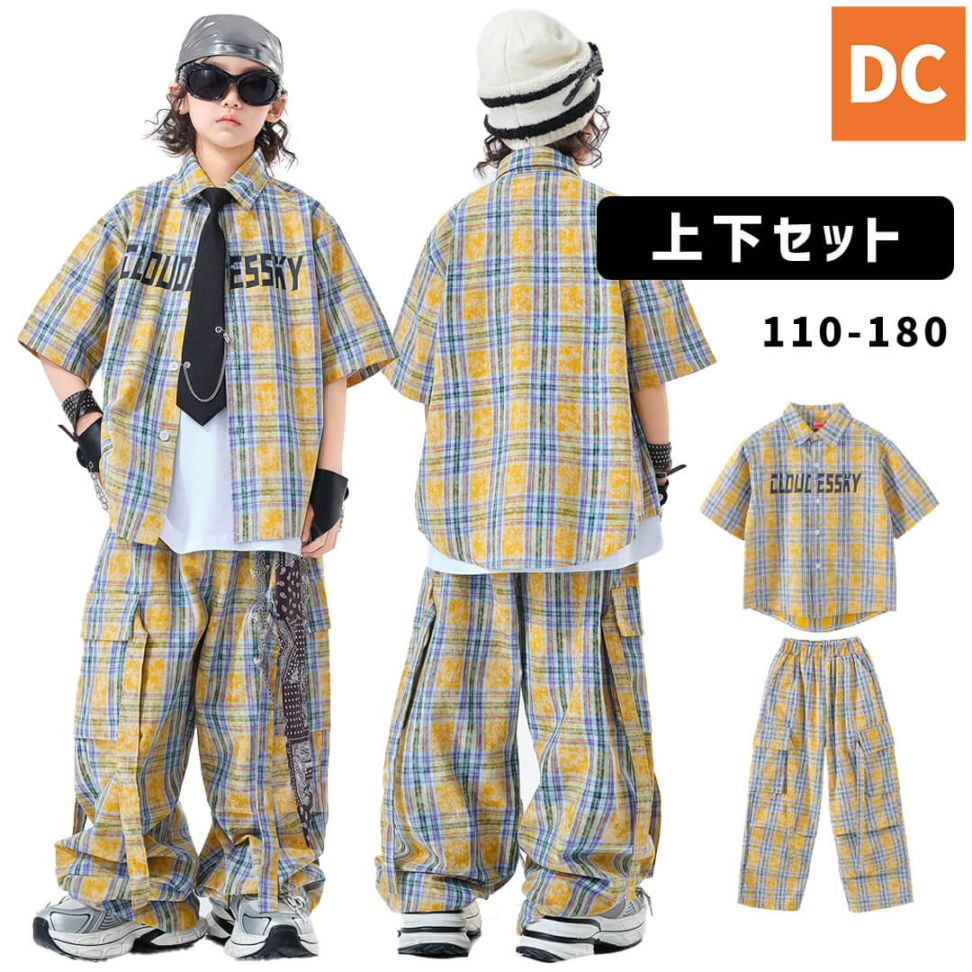 ユニセックス チェック柄 ストリート ダボダボ チェックシャツ カーゴパンツ 柄パンツ 長袖シャツ 長袖 ロングパンツ 前開きシャツ HIPHOP衣装 キッズダンス衣装 110~180【dc-1827】