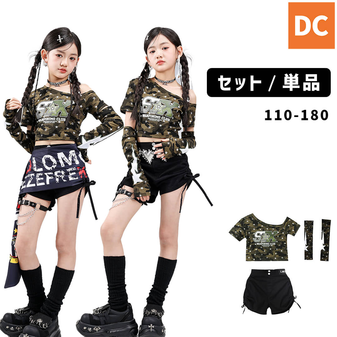 ガールズ K-POP 韓国 ブラック 迷彩 スカート 肩だし ロングパンツ ショートパンツ ファー レッグウォーマー へそ出し タイダイ 長袖 キッズダンス キッズ衣装 110~180【dc-1830】