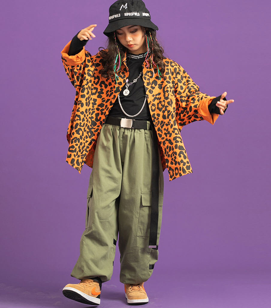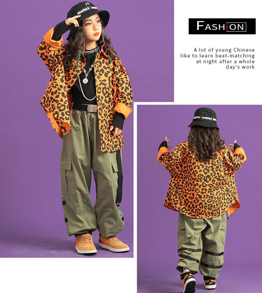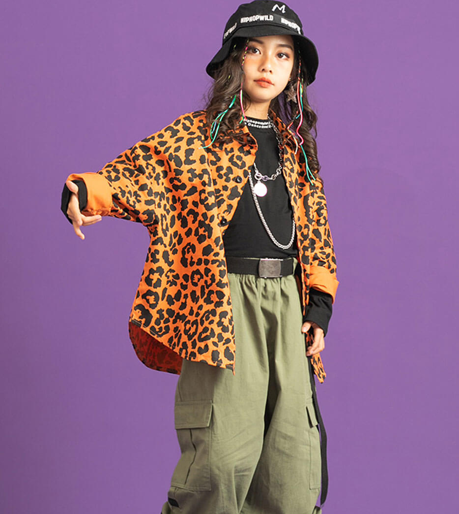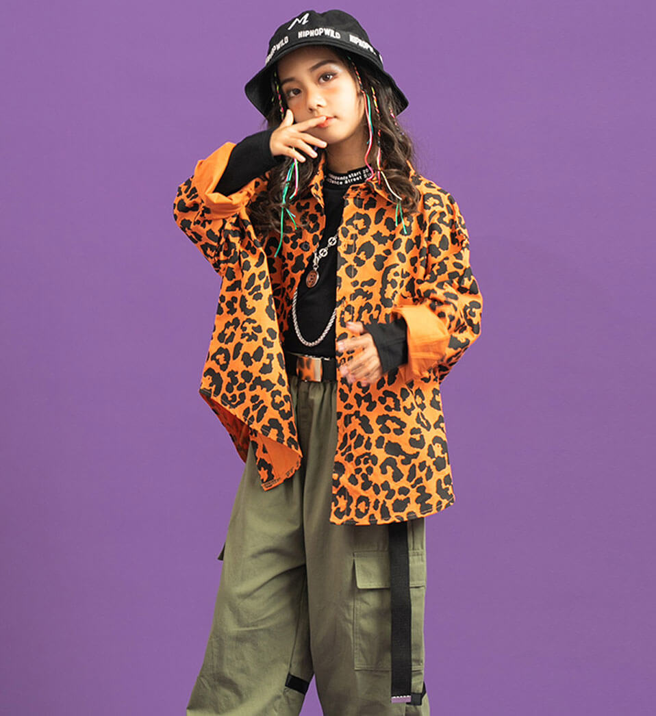 【トップス】キッズダンス衣装トップス単品 長袖シャツ ユニセックス ヒョウ柄 オレンジ 柄物 前開きシャツ 【t-44】