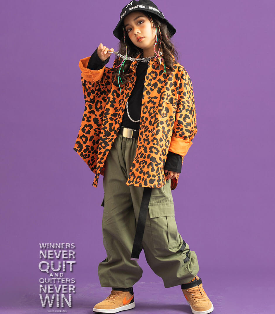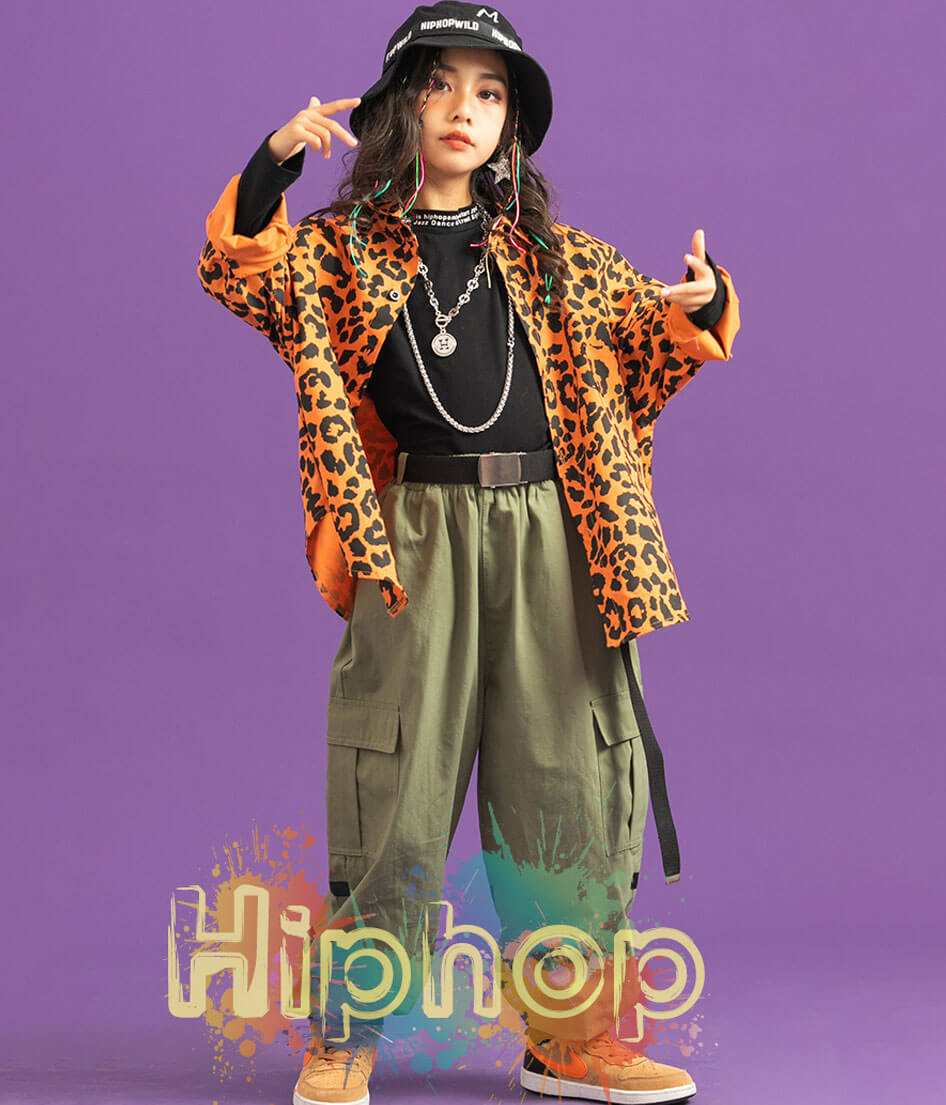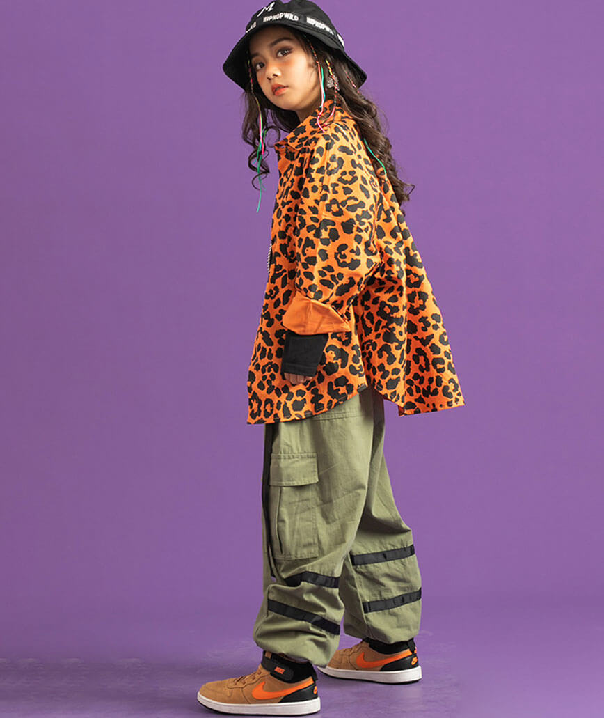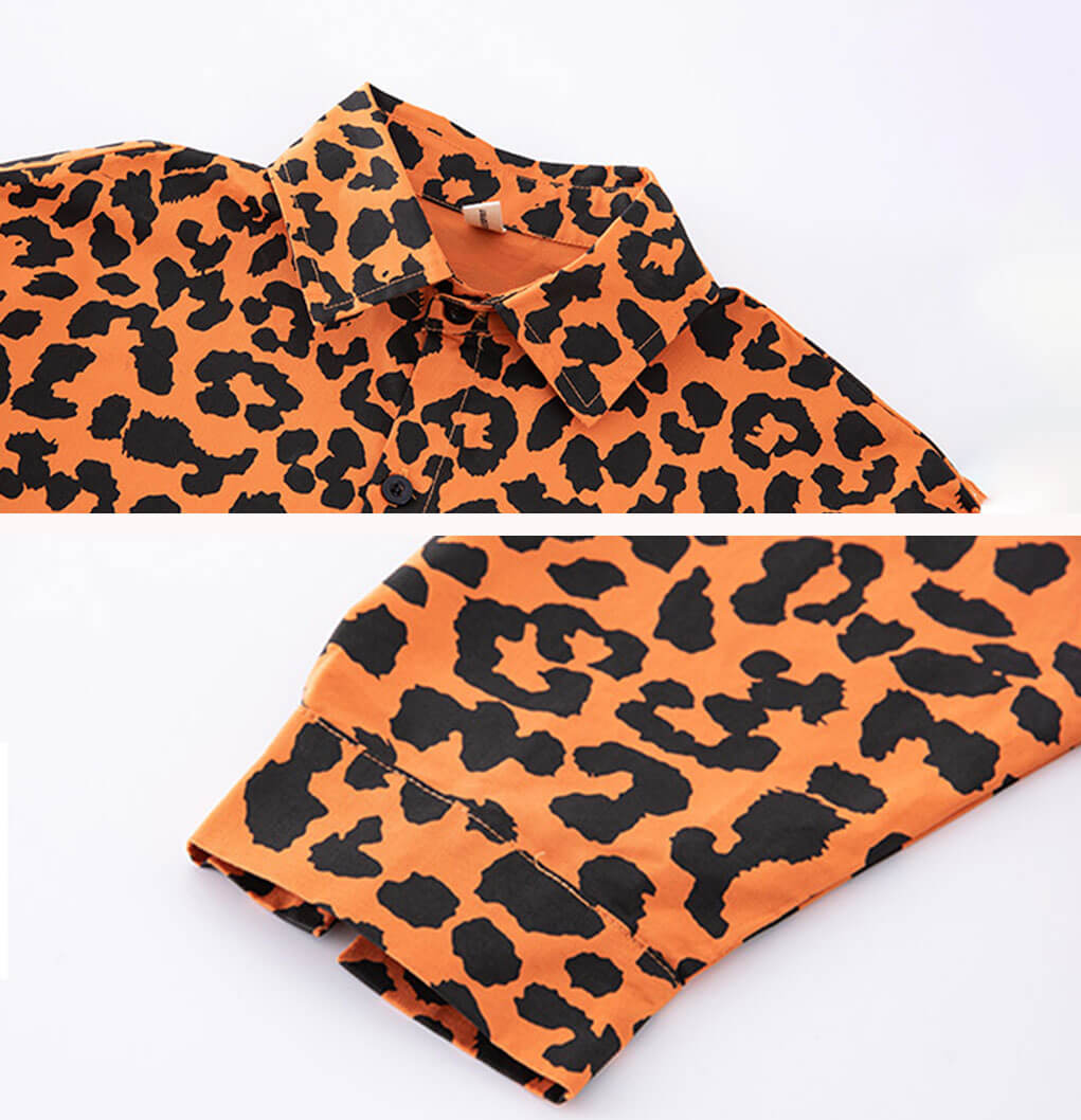 【トップス】キッズダンス衣装トップス単品 長袖シャツ ユニセックス ヒョウ柄 オレンジ 柄物 前開きシャツ 【t-44】