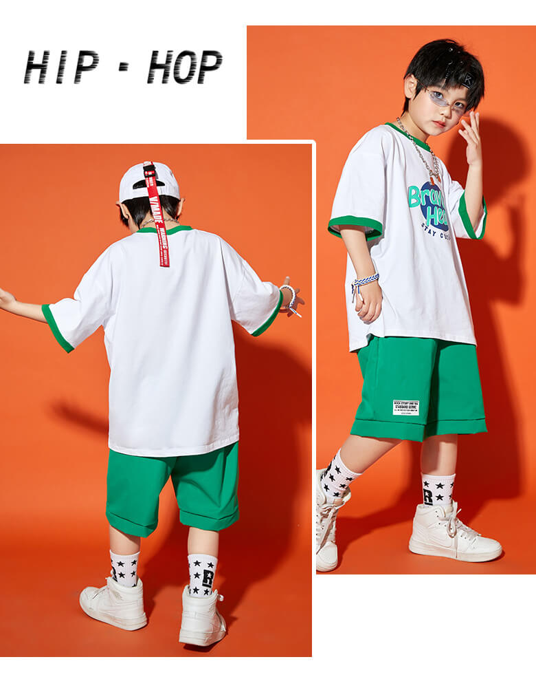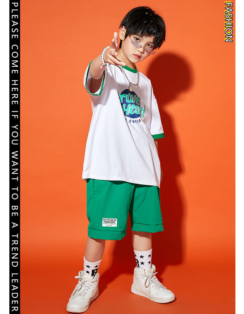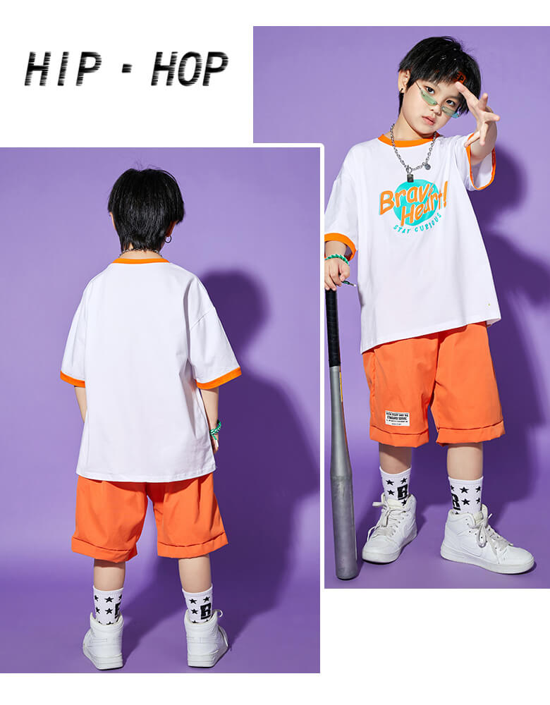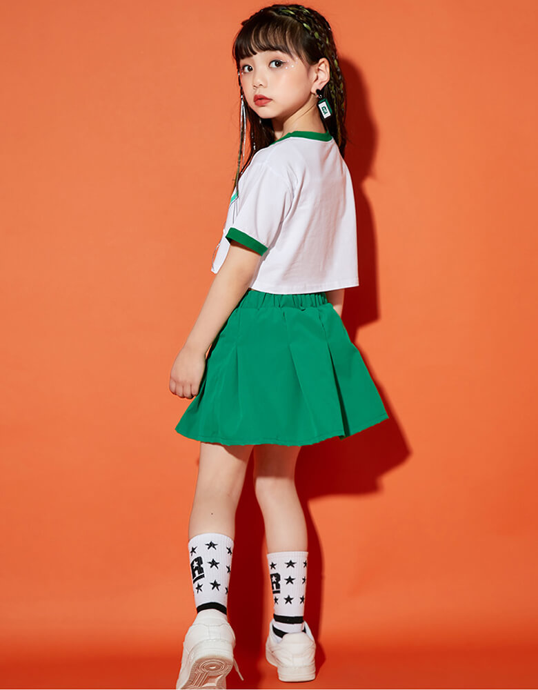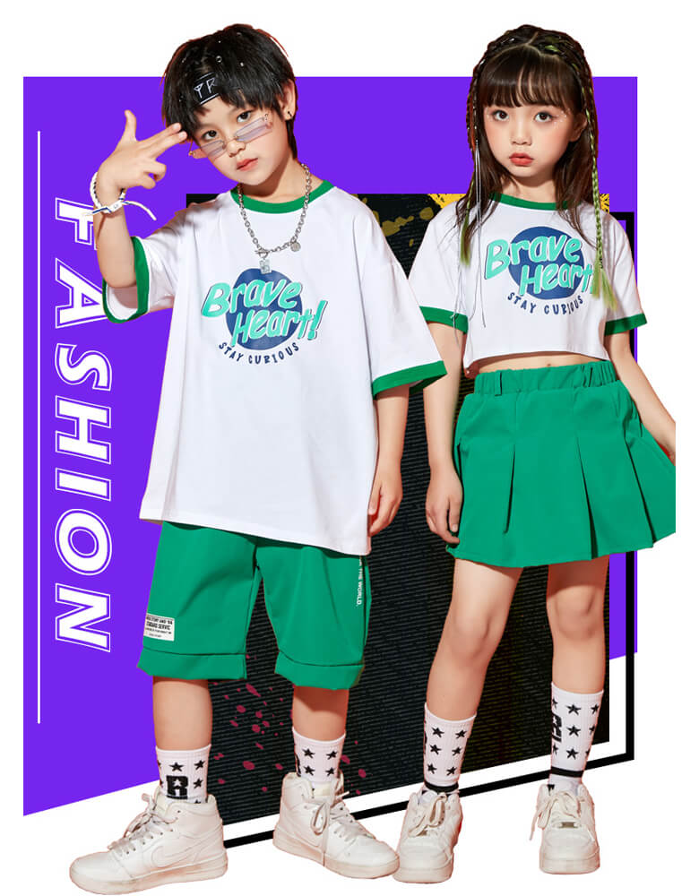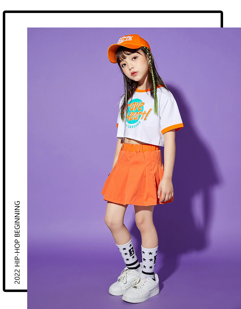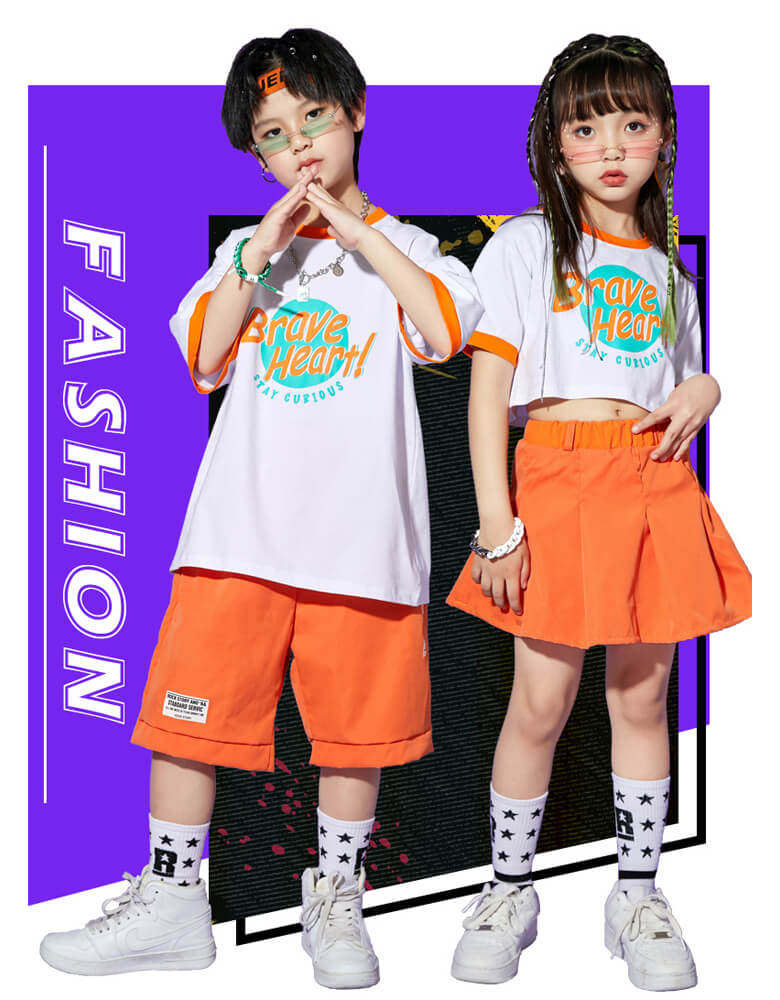 男女MIX キッズダンス衣装 単品OK チア衣装 へそ出し ヒップホップダンス 半袖 半ズボン 短パン スカート ガールズ ボーイズ オレンジ グリーン HIPHOP【dc-565】