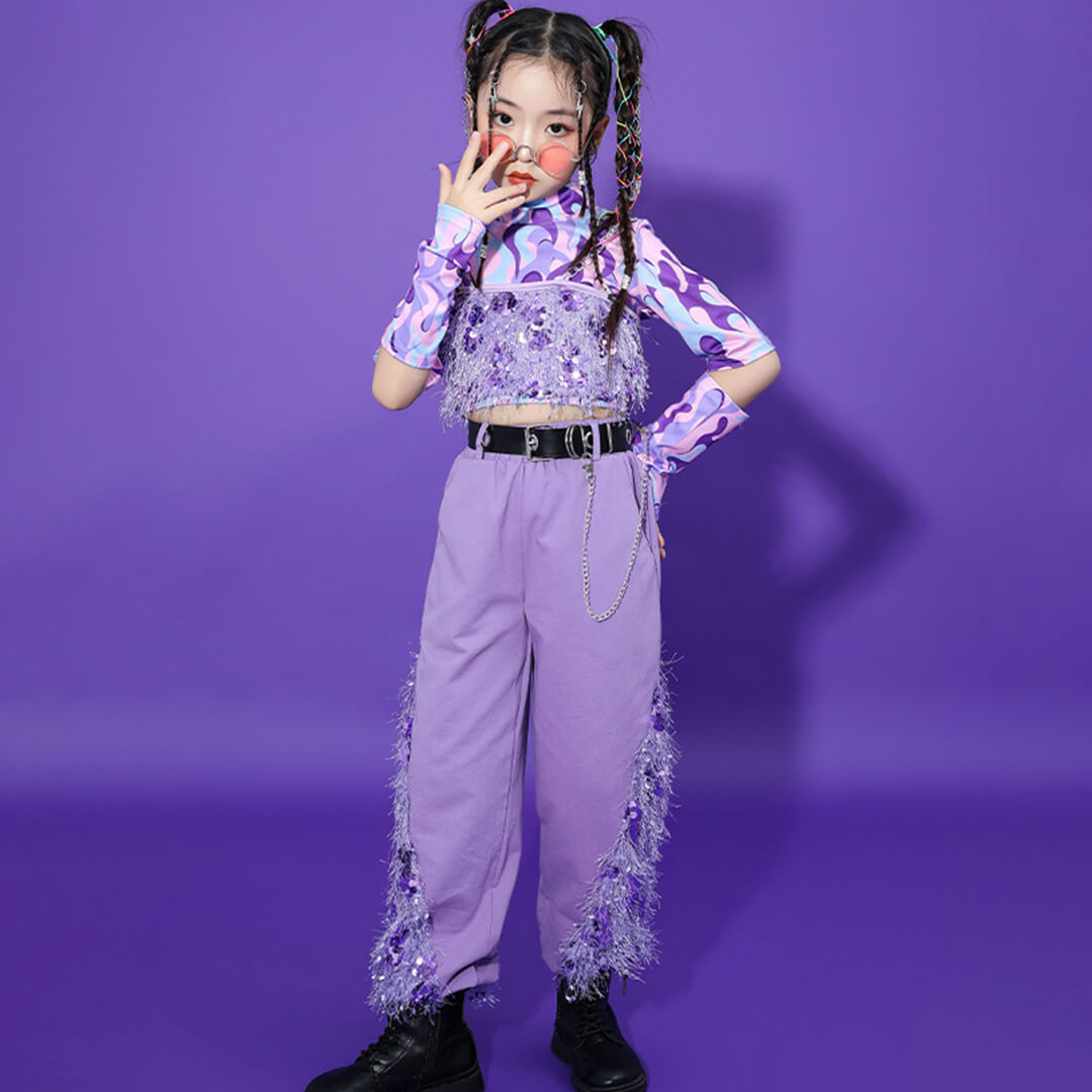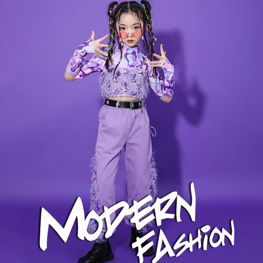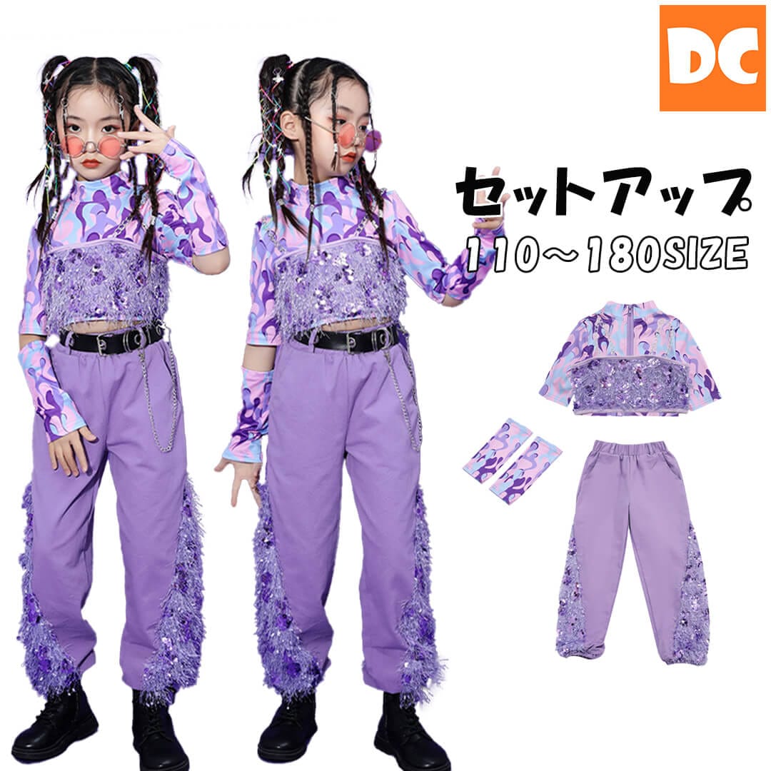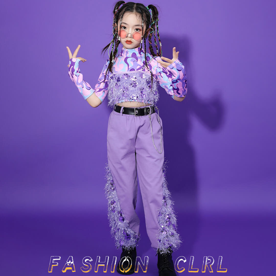 ガールズ衣装 HIPHOP衣装 キッズ衣装 K-POP パープル へそ出し スパンコール キラキラ ロングパンツ マーブル柄【dc-1107】