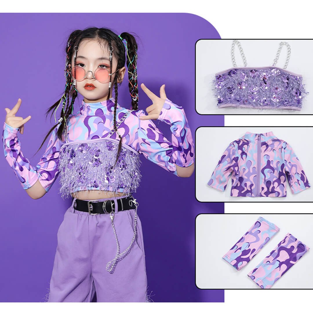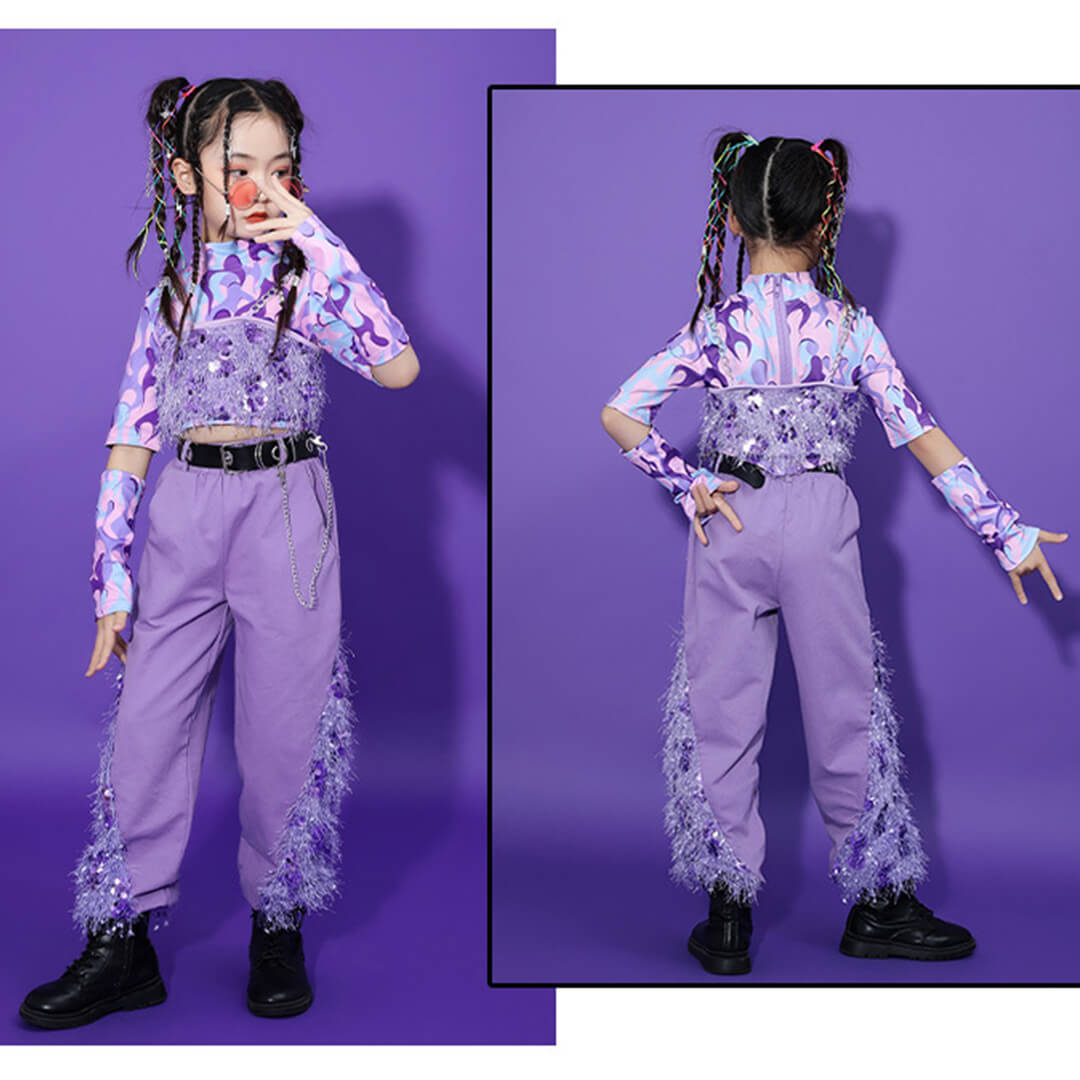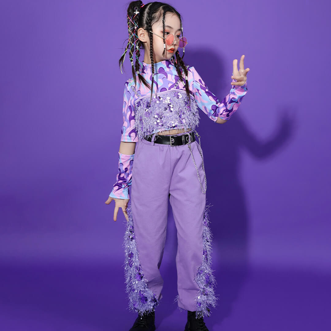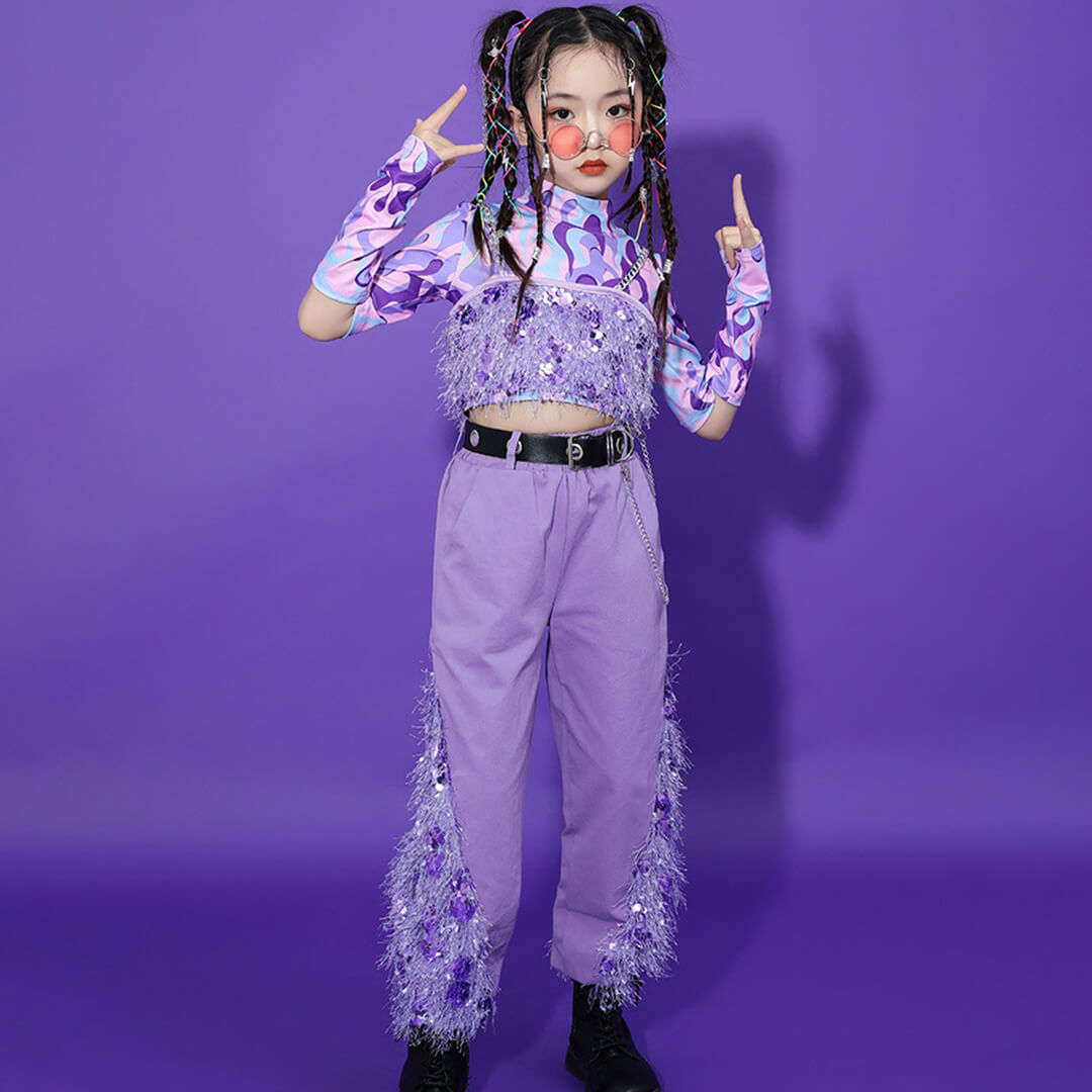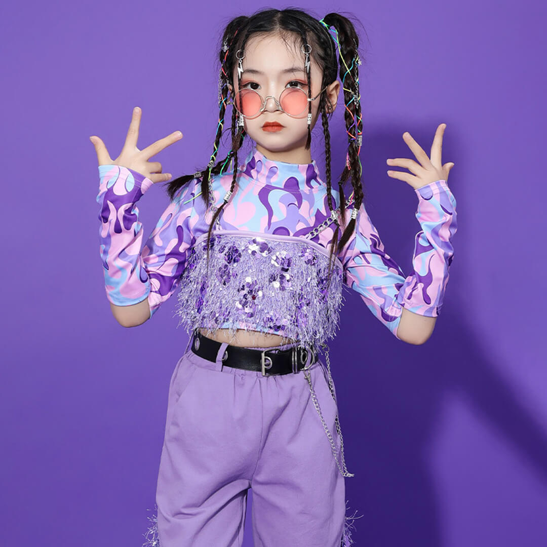 ガールズ衣装 HIPHOP衣装 キッズ衣装 K-POP パープル へそ出し スパンコール キラキラ ロングパンツ マーブル柄【dc-1107】