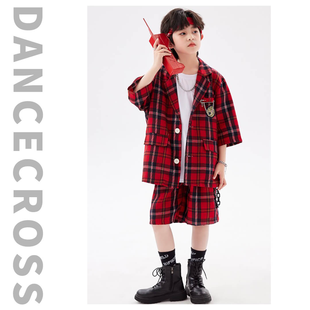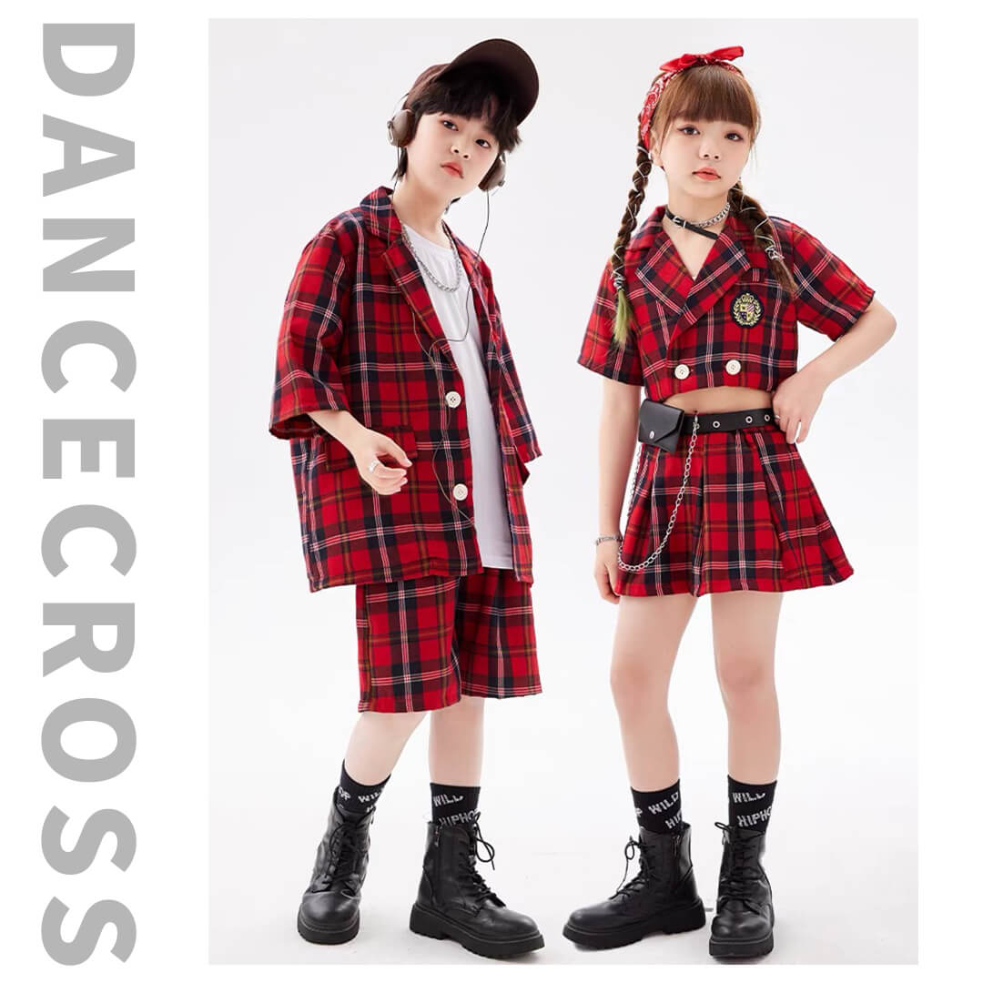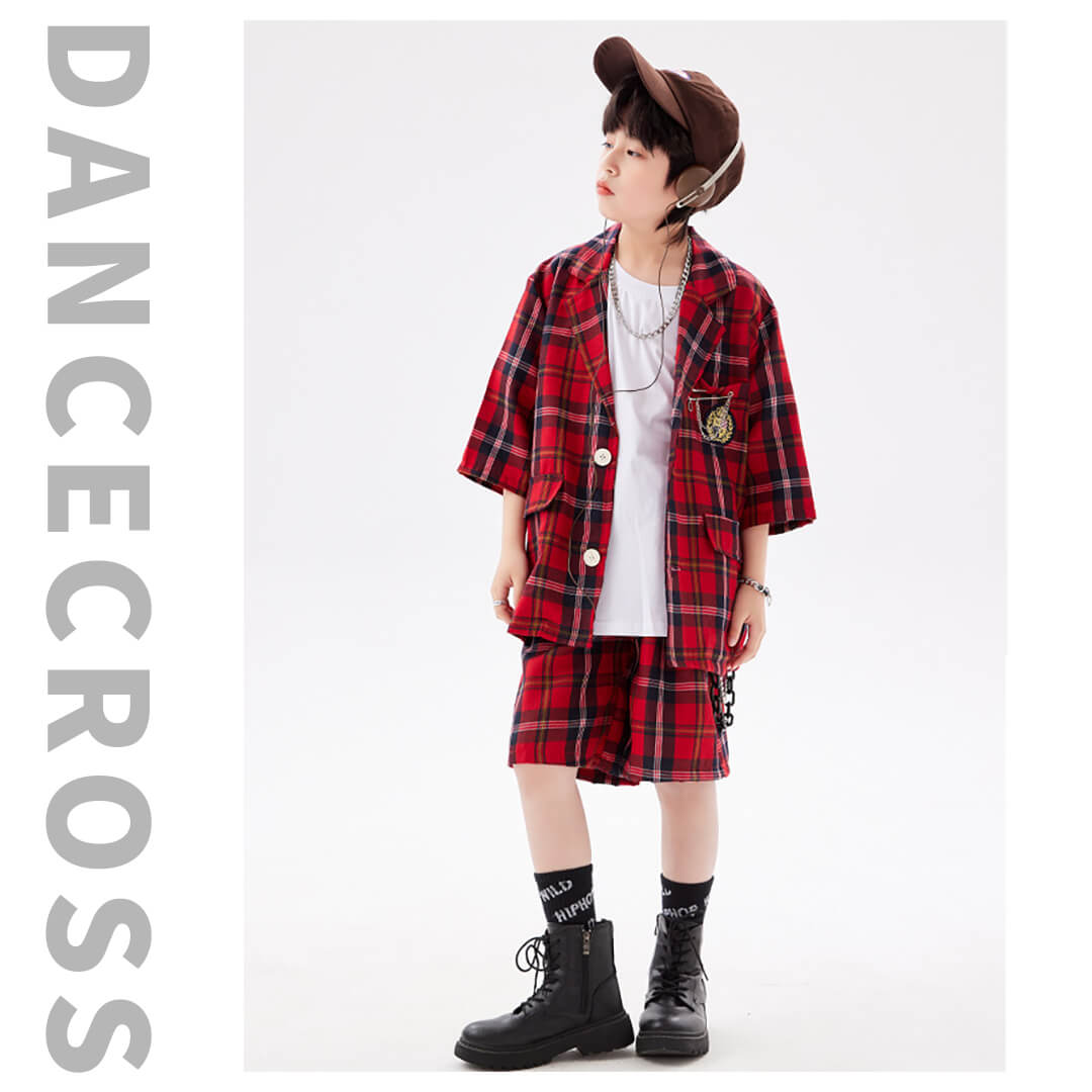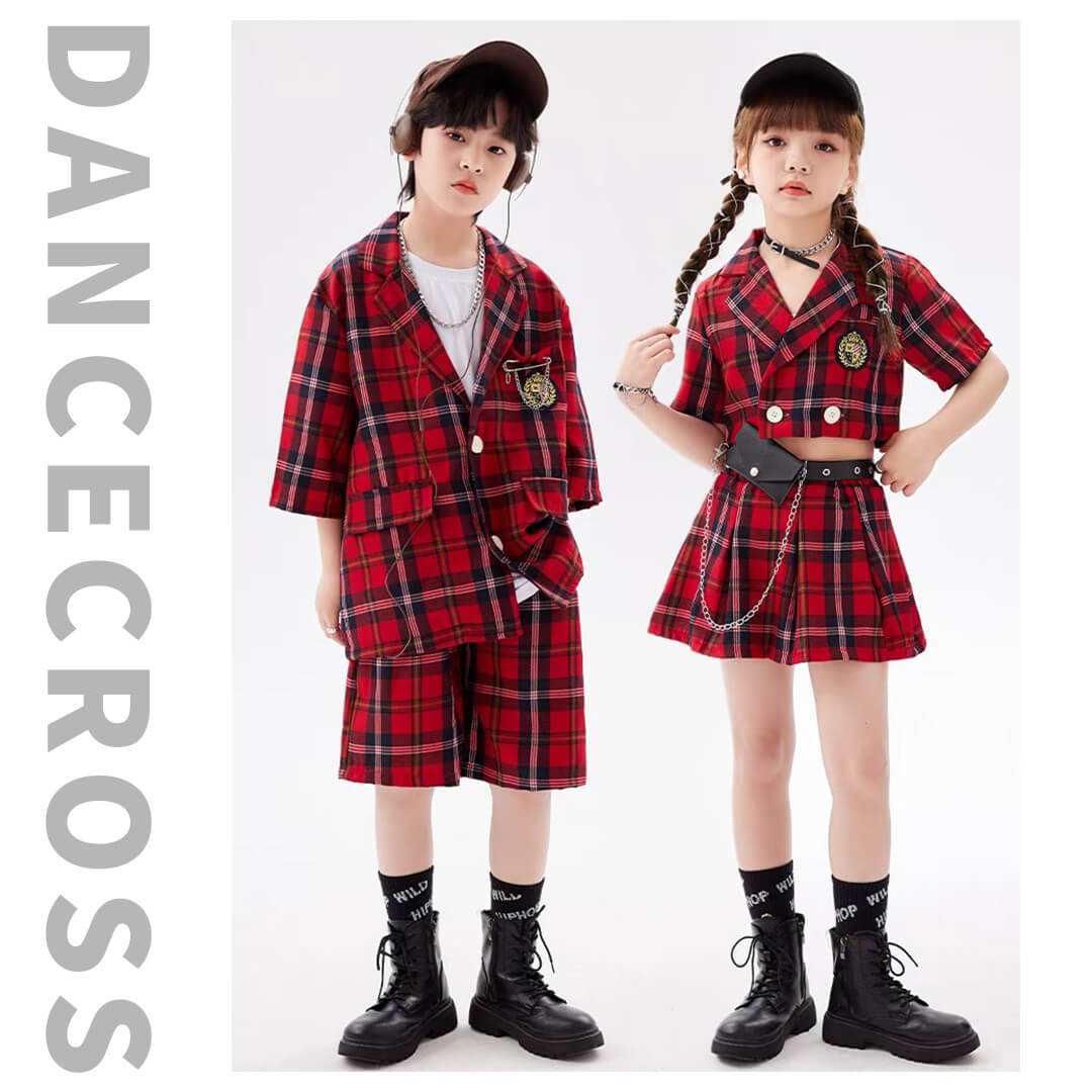 男女MIX HIPHOP衣装 キッズダンス チェック柄 レッド 赤 半袖 半ズボン 前開きシャツ ハーフパンツ へそ出し 110~180【dc-1317】