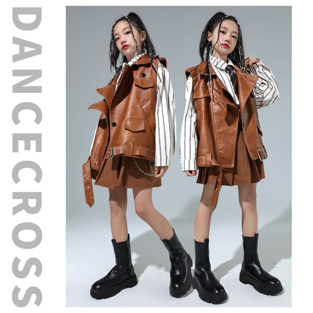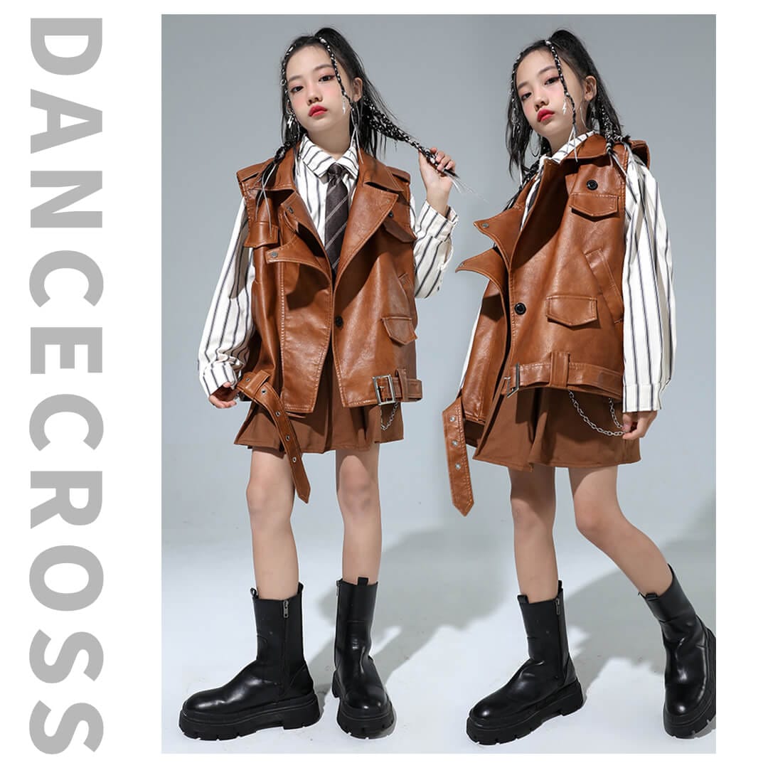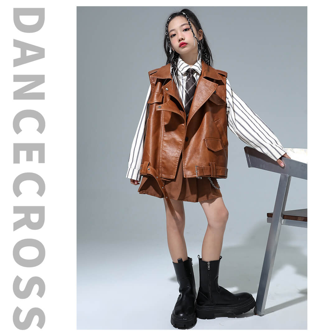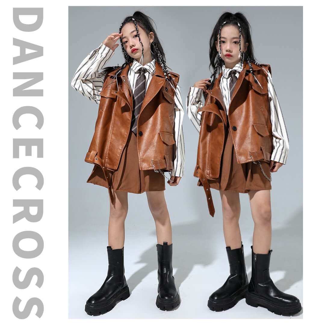 ガールズ衣装 HIPHOP衣装 キッズ衣装 K-POP ブラウン ベスト ストライプシャツ フェイクレザー 長袖 スカート 120~180【dc-1477】