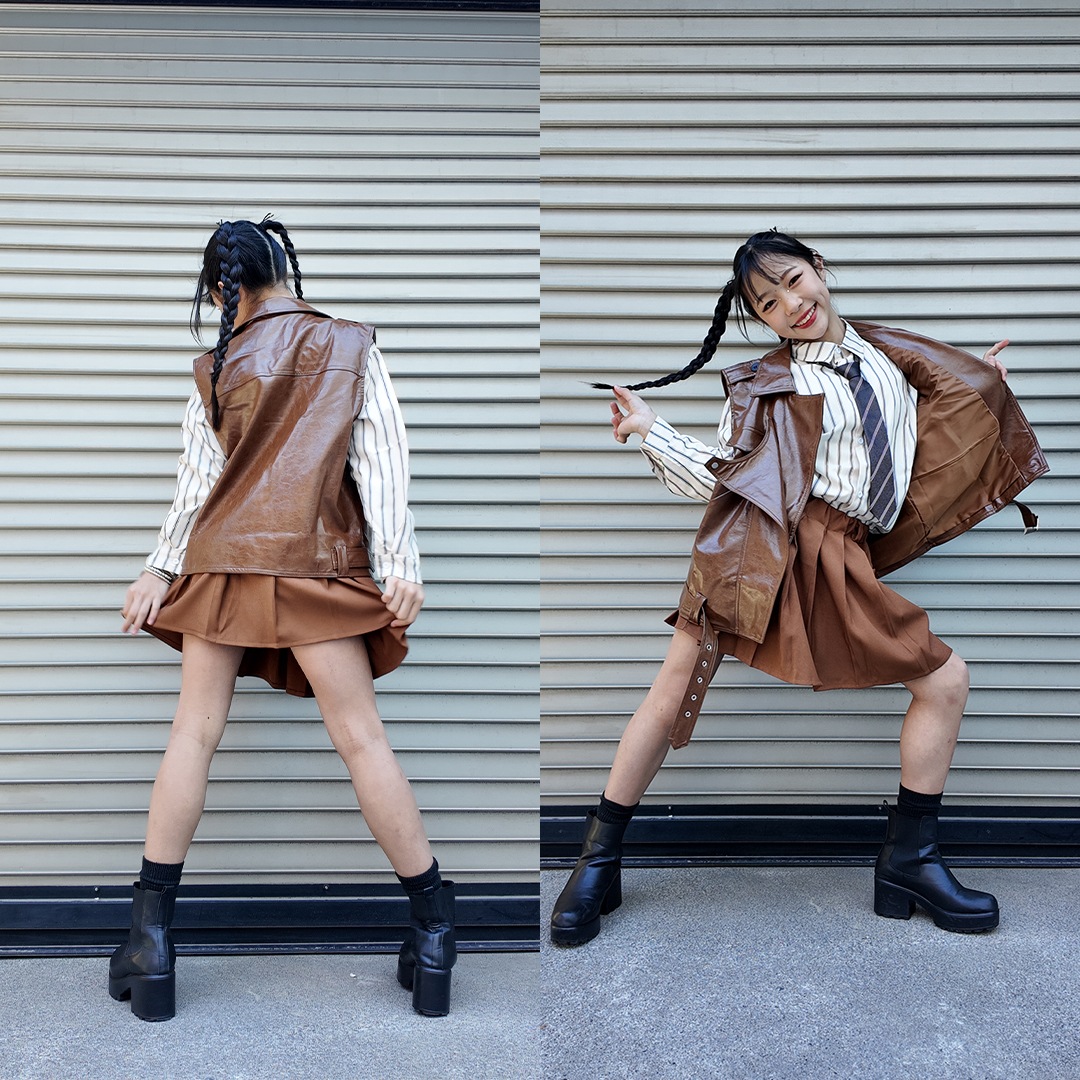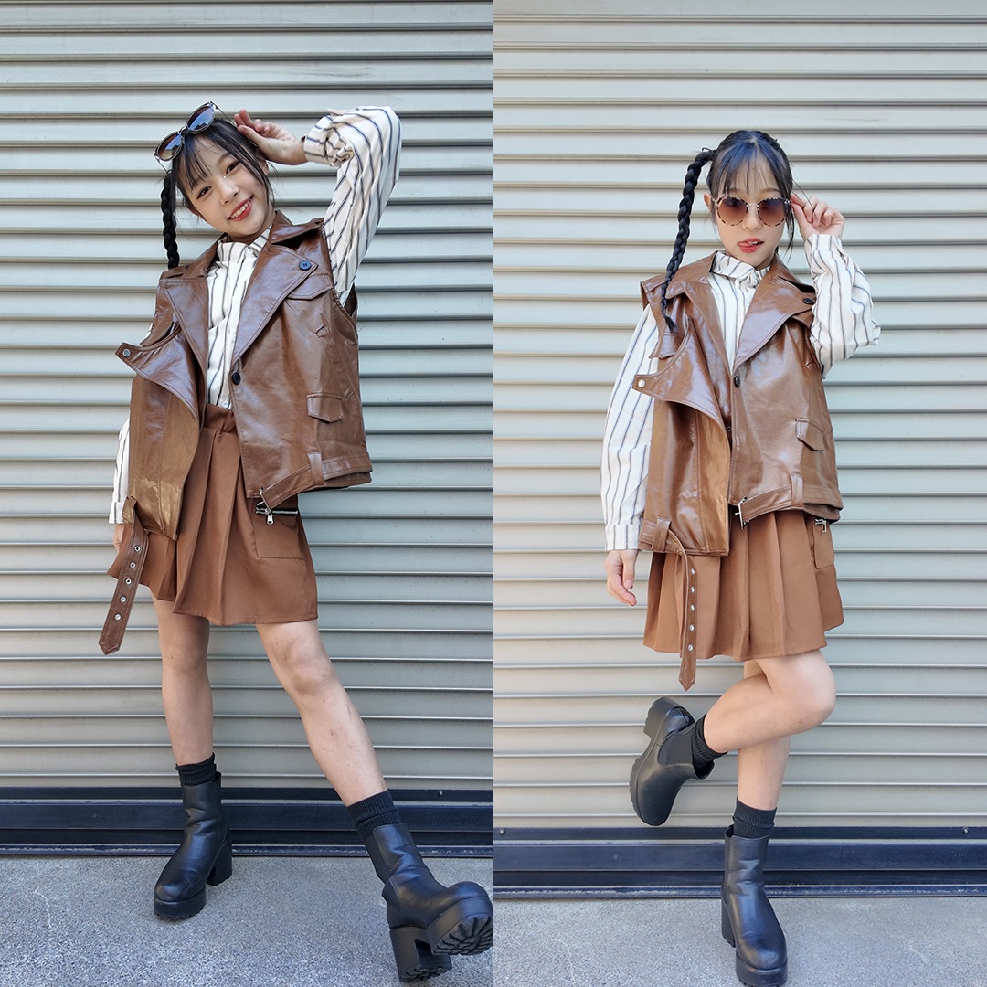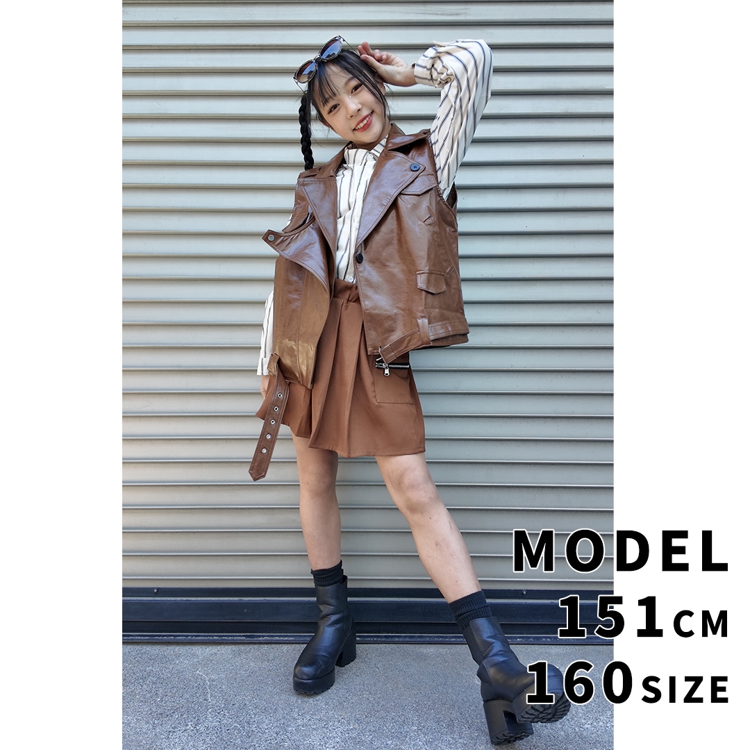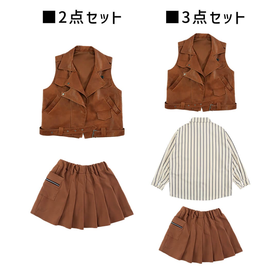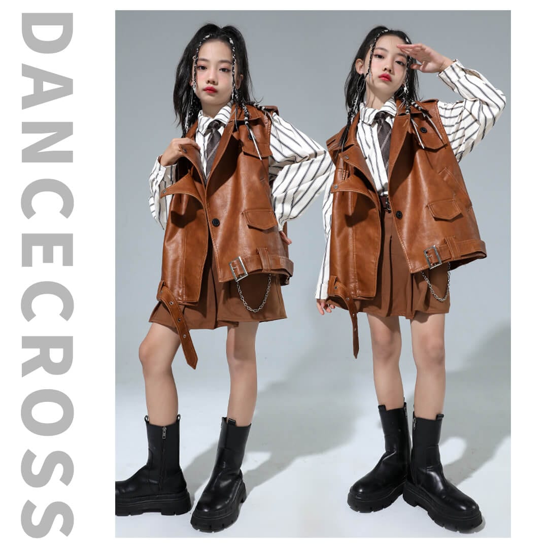 ガールズ衣装 HIPHOP衣装 キッズ衣装 K-POP ブラウン ベスト ストライプシャツ フェイクレザー 長袖 スカート 120~180【dc-1477】