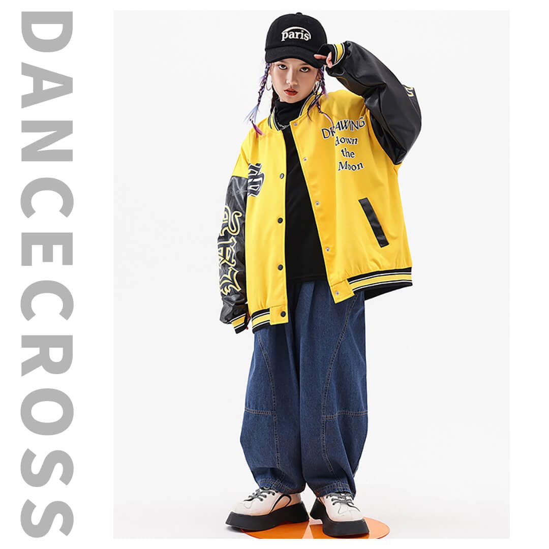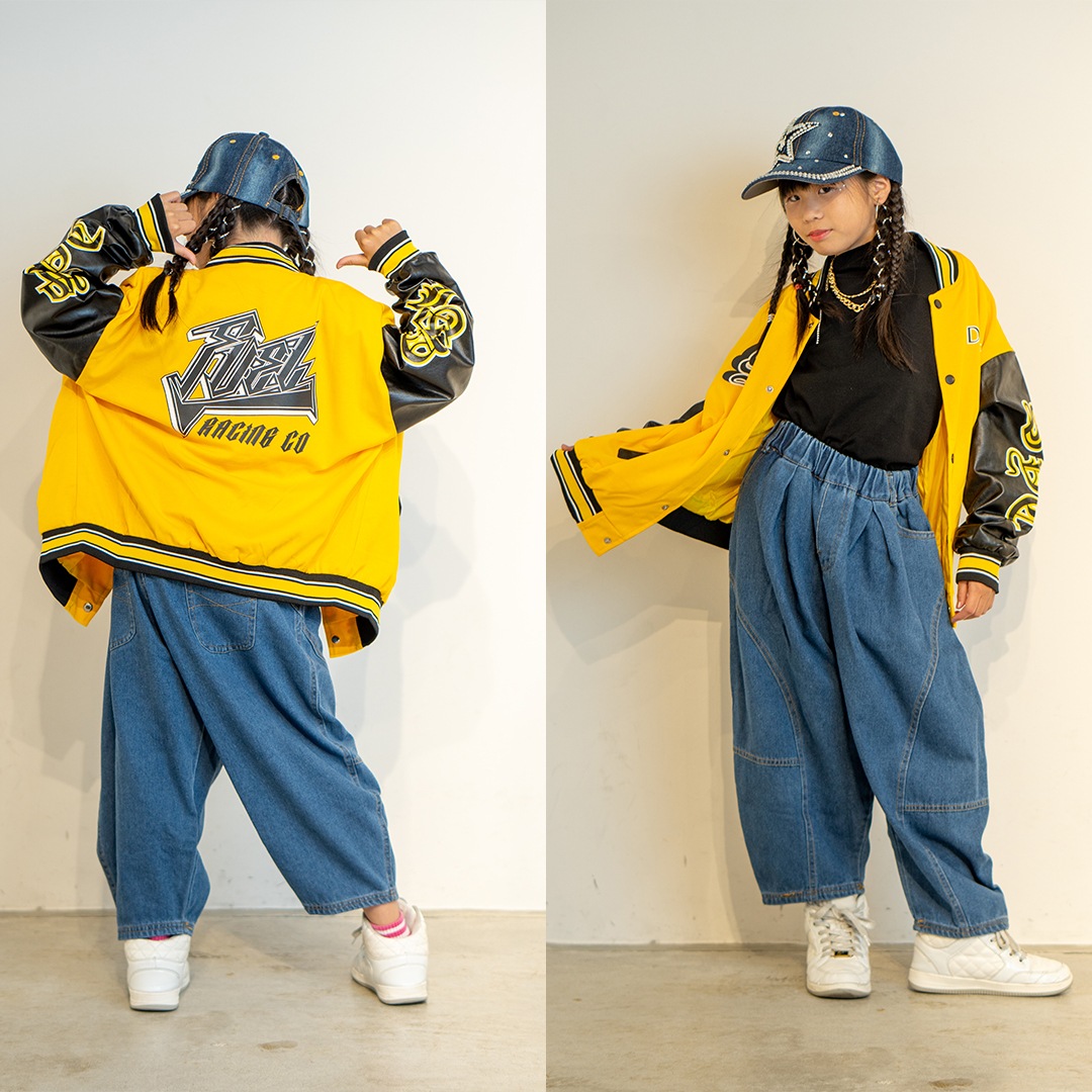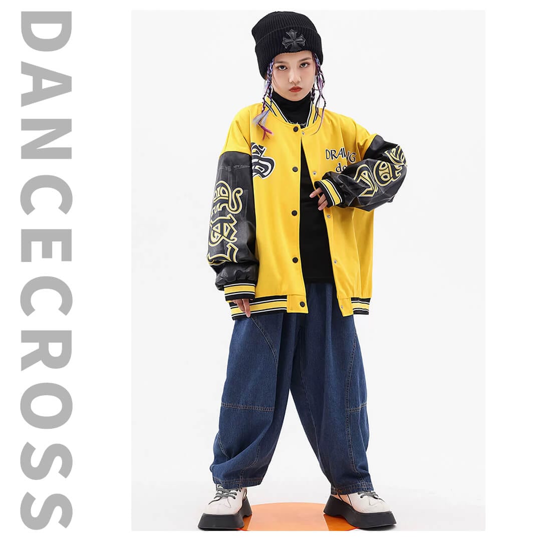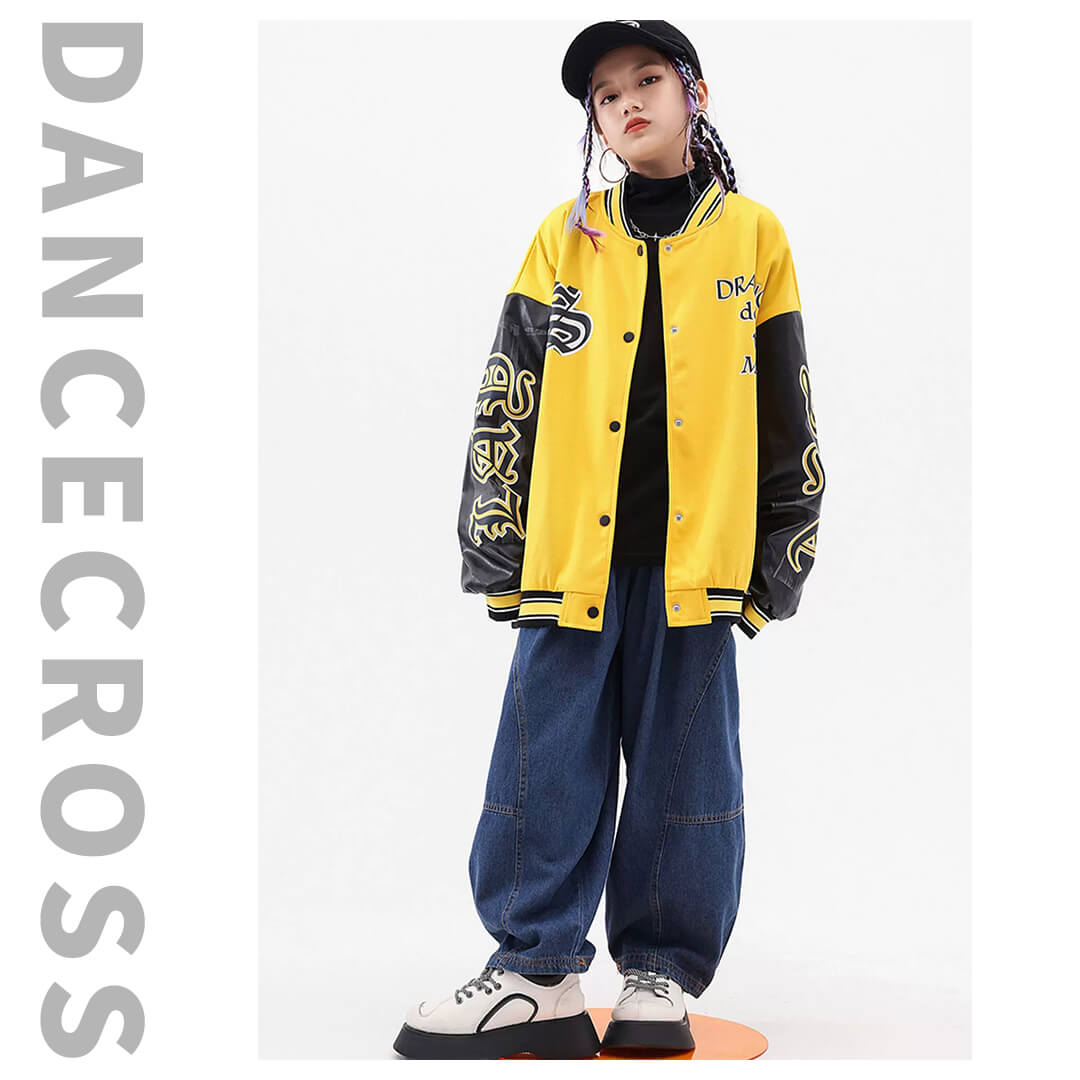 HIPHOP衣装 キッズダンス ユニセックス ブルゾン イエロー ブラック デニムパンツ 長袖 アウター 110~180【dc-1489】