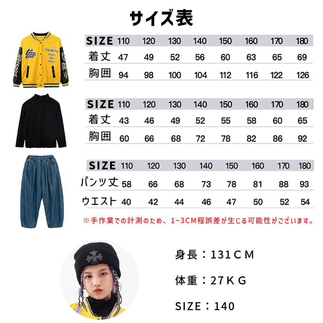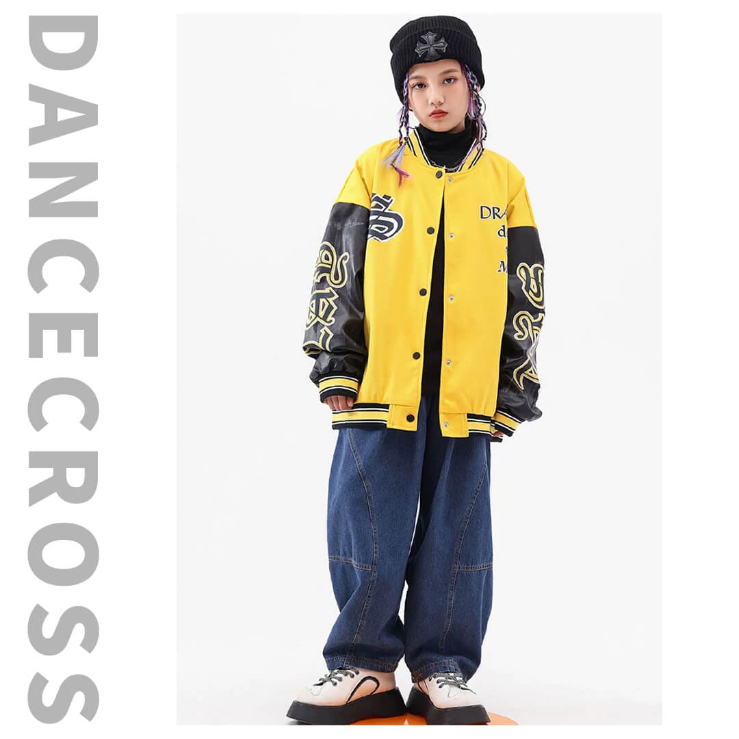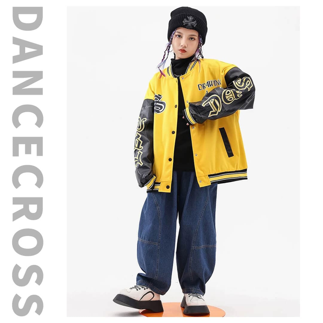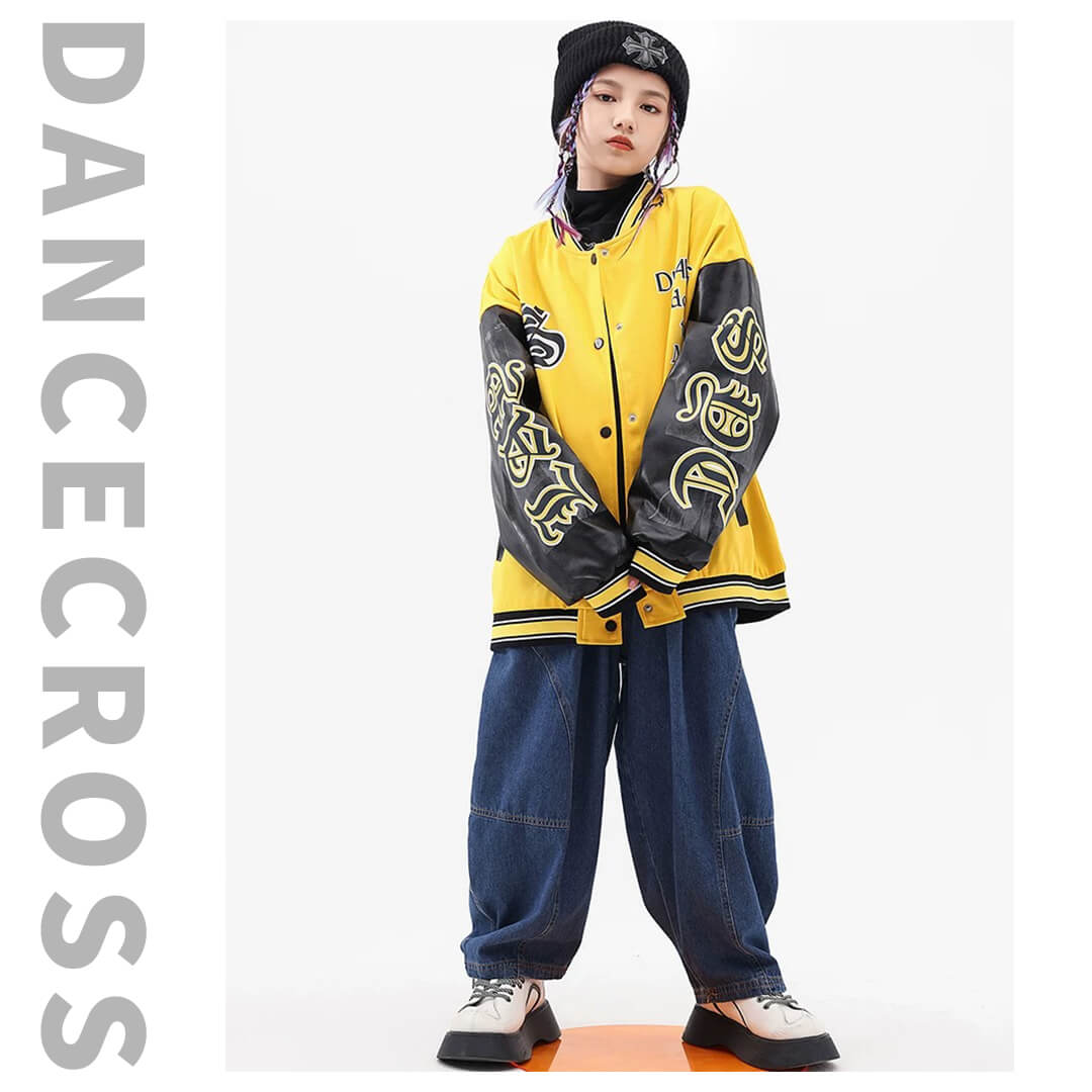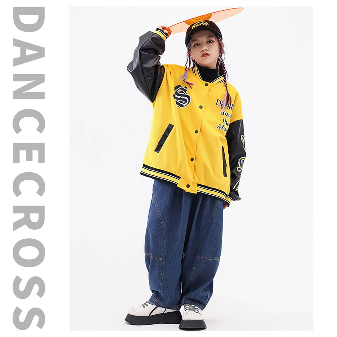 HIPHOP衣装 キッズダンス ユニセックス ブルゾン イエロー ブラック デニムパンツ 長袖 アウター 110~180【dc-1489】