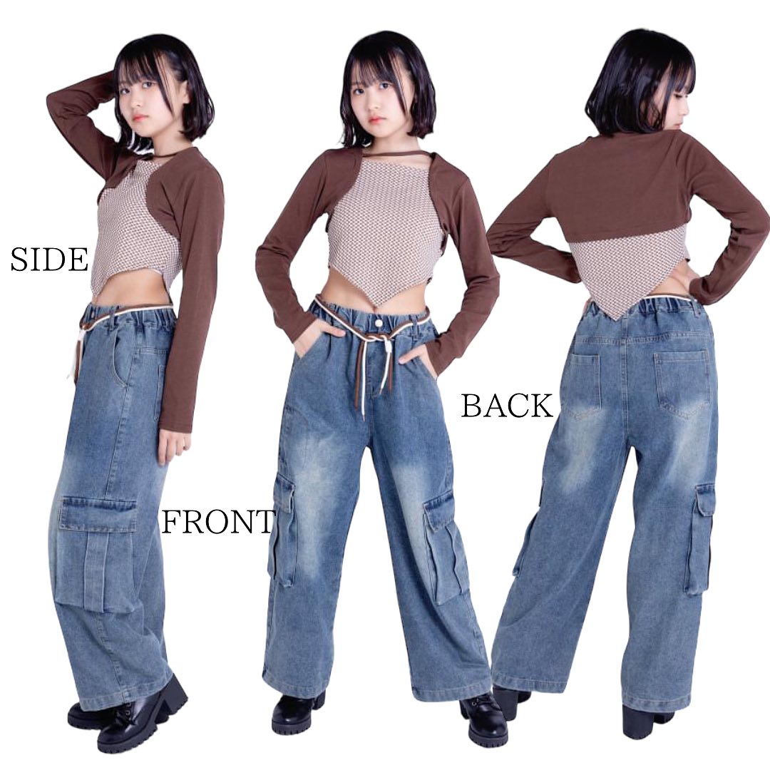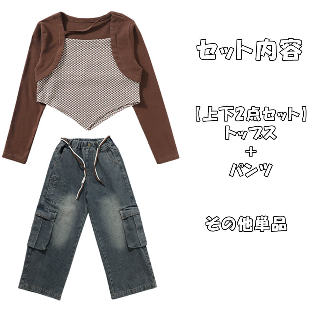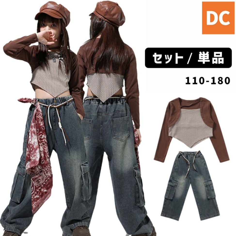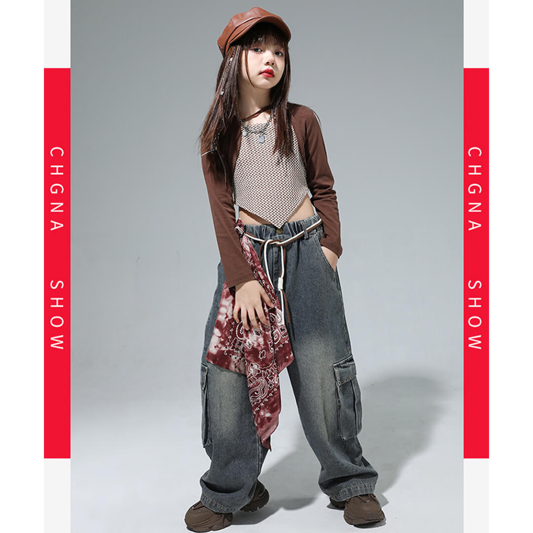 ガールズ衣装 HIPHOP衣装 キッズ衣装 ブラウン デニム へそ出し ロングパンツ 長袖 ショートトップス 110~180【dc-1500】
