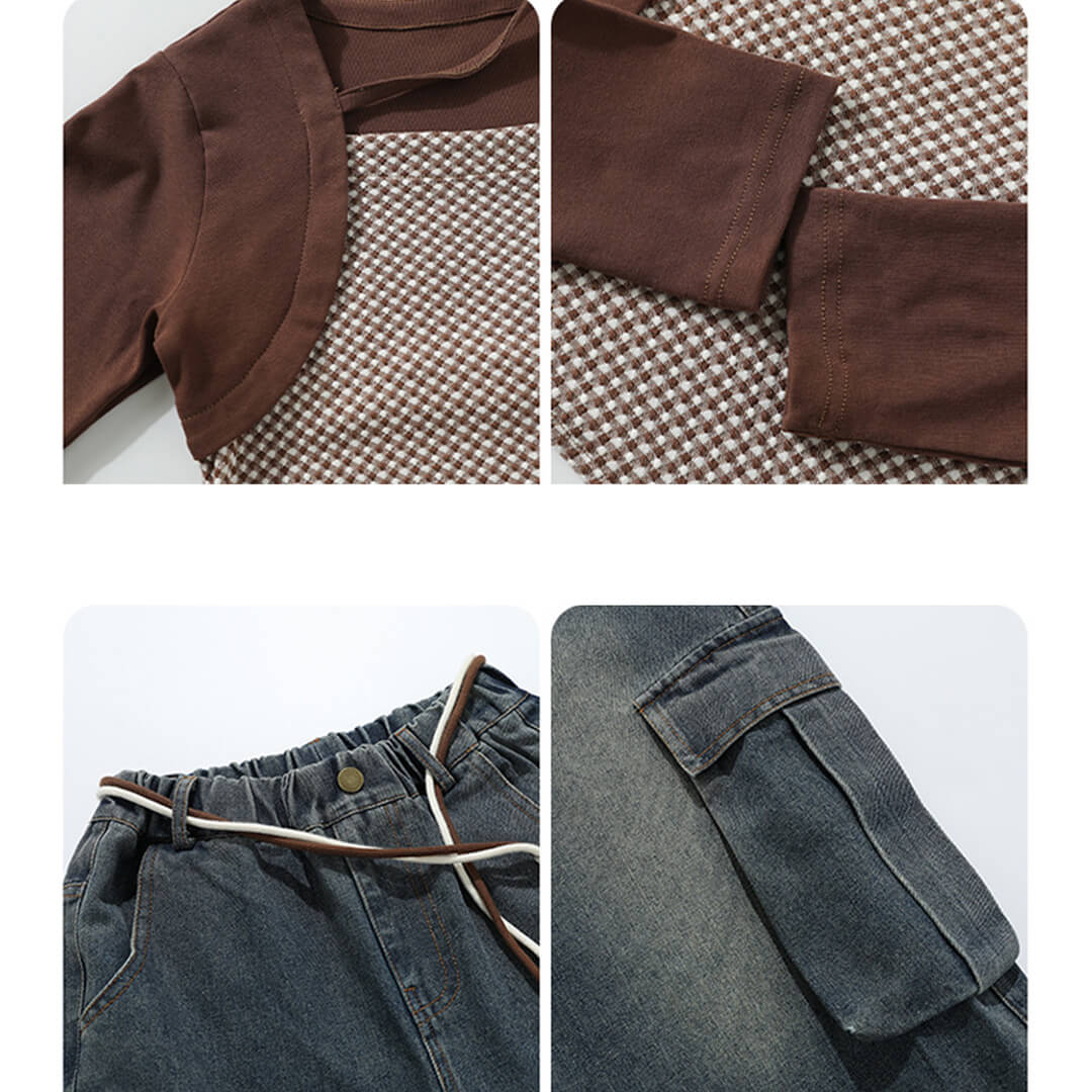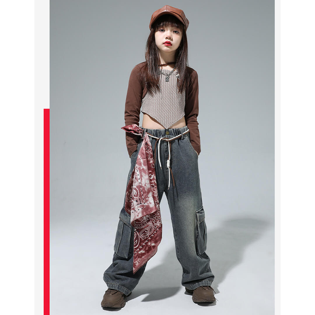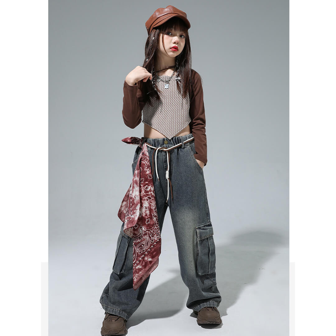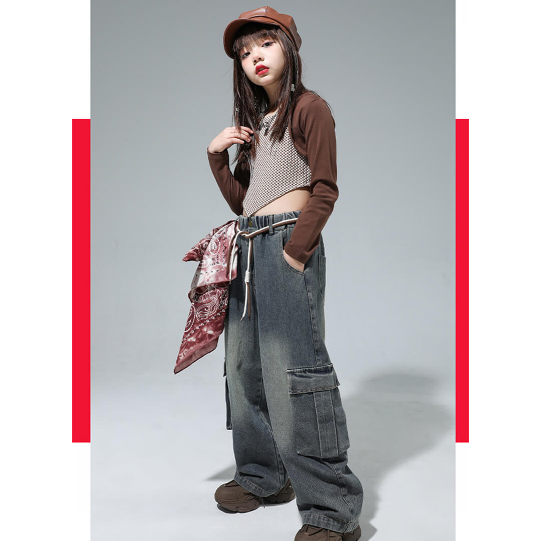 ガールズ衣装 HIPHOP衣装 キッズ衣装 ブラウン デニム へそ出し ロングパンツ 長袖 ショートトップス 110~180【dc-1500】
