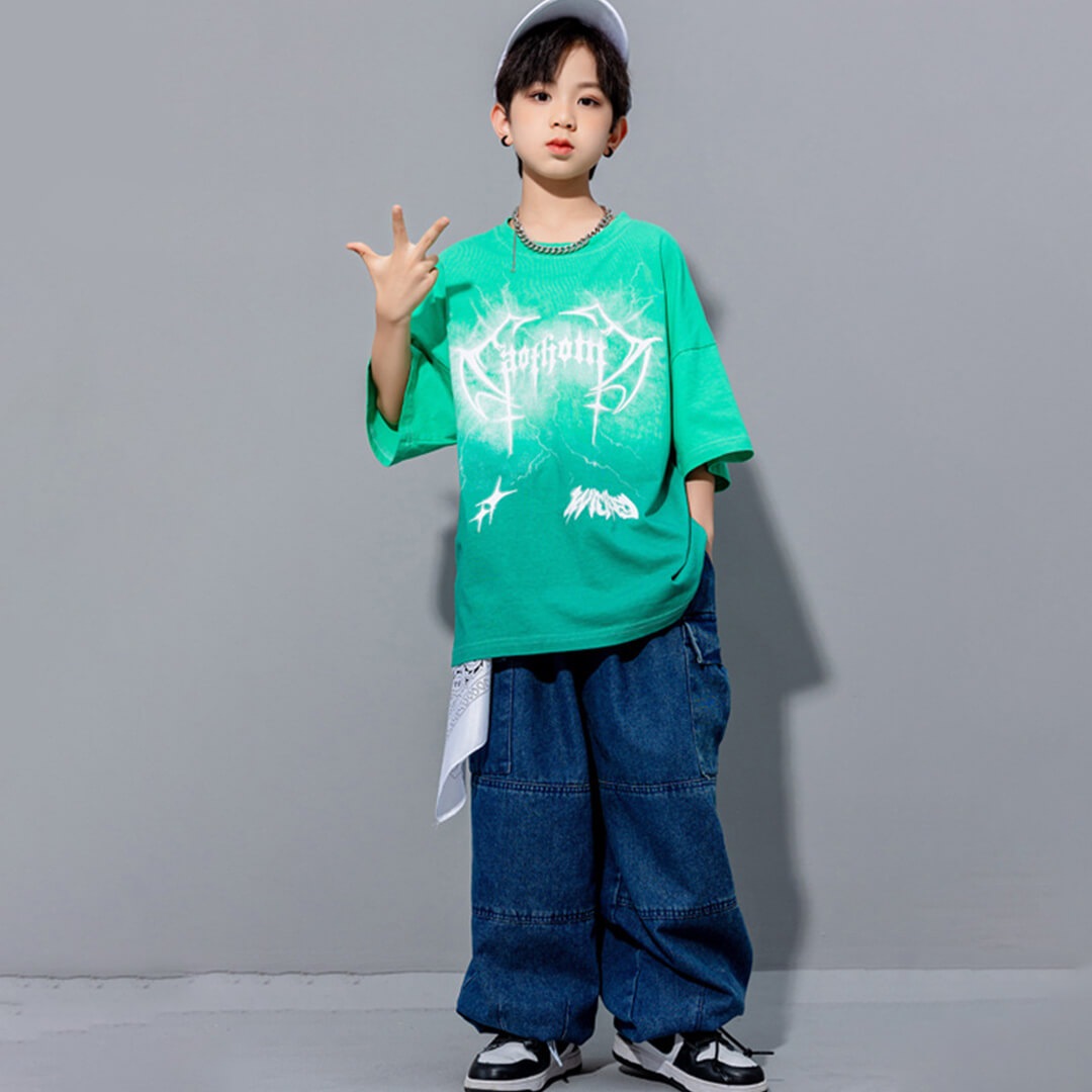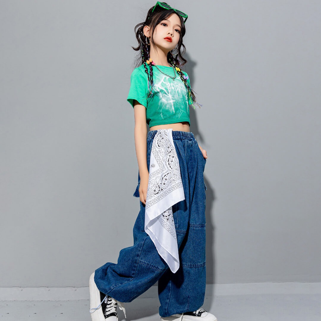 男女MIX HIPHOP衣装 キッズダンス グリーン デニム 半袖 Tシャツ へそ出し ロングパンツ ショートトップス 110~180【dc-1530】