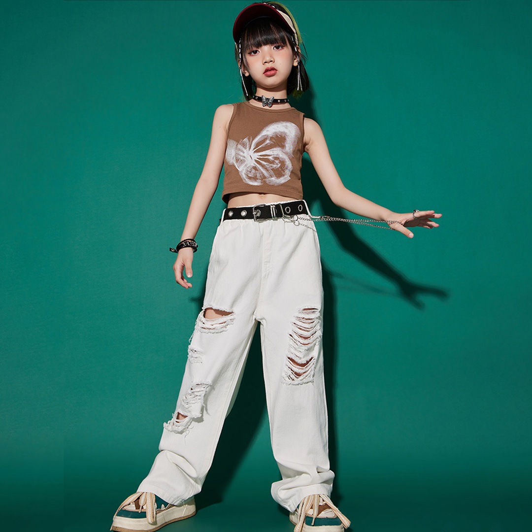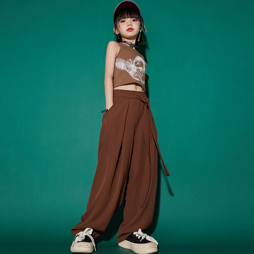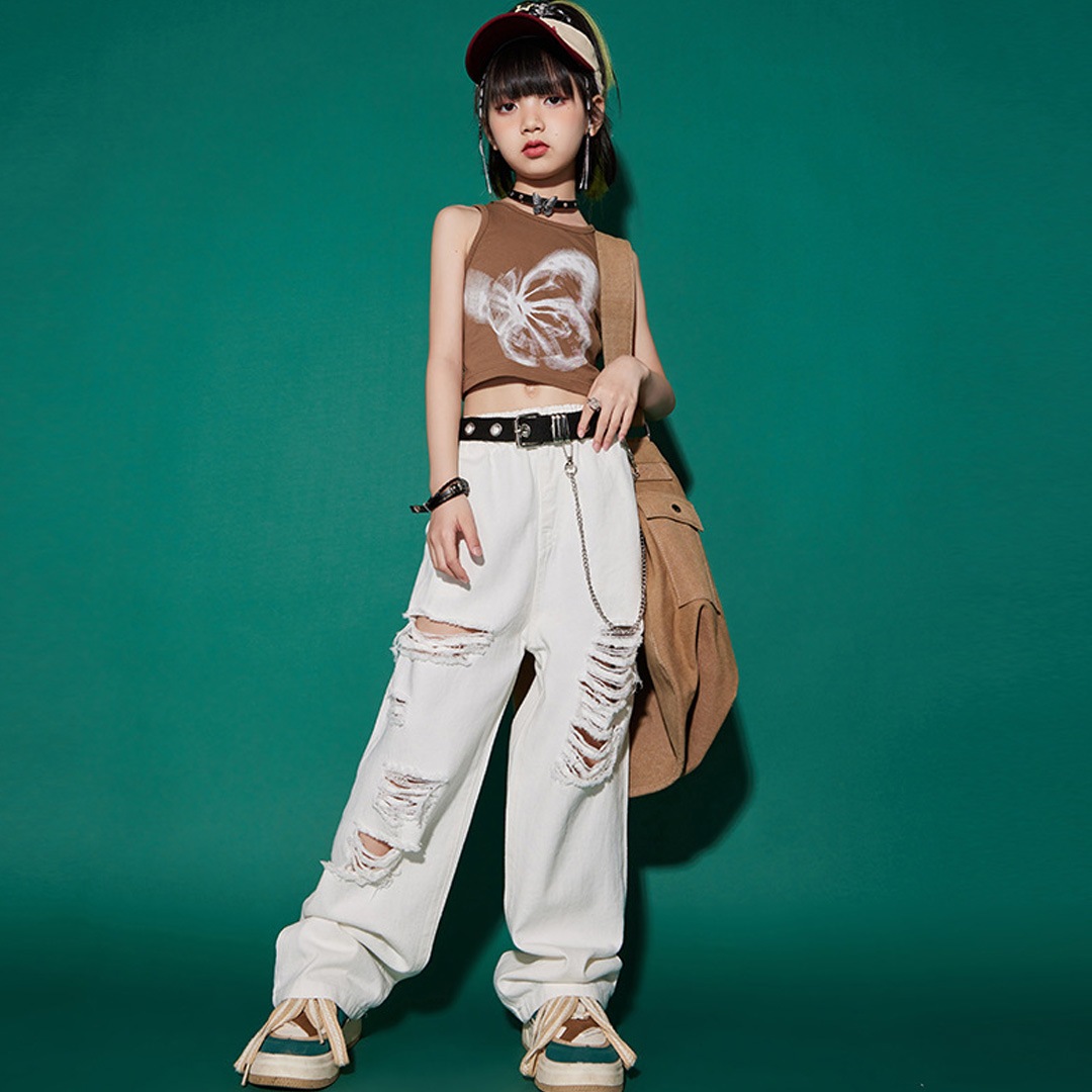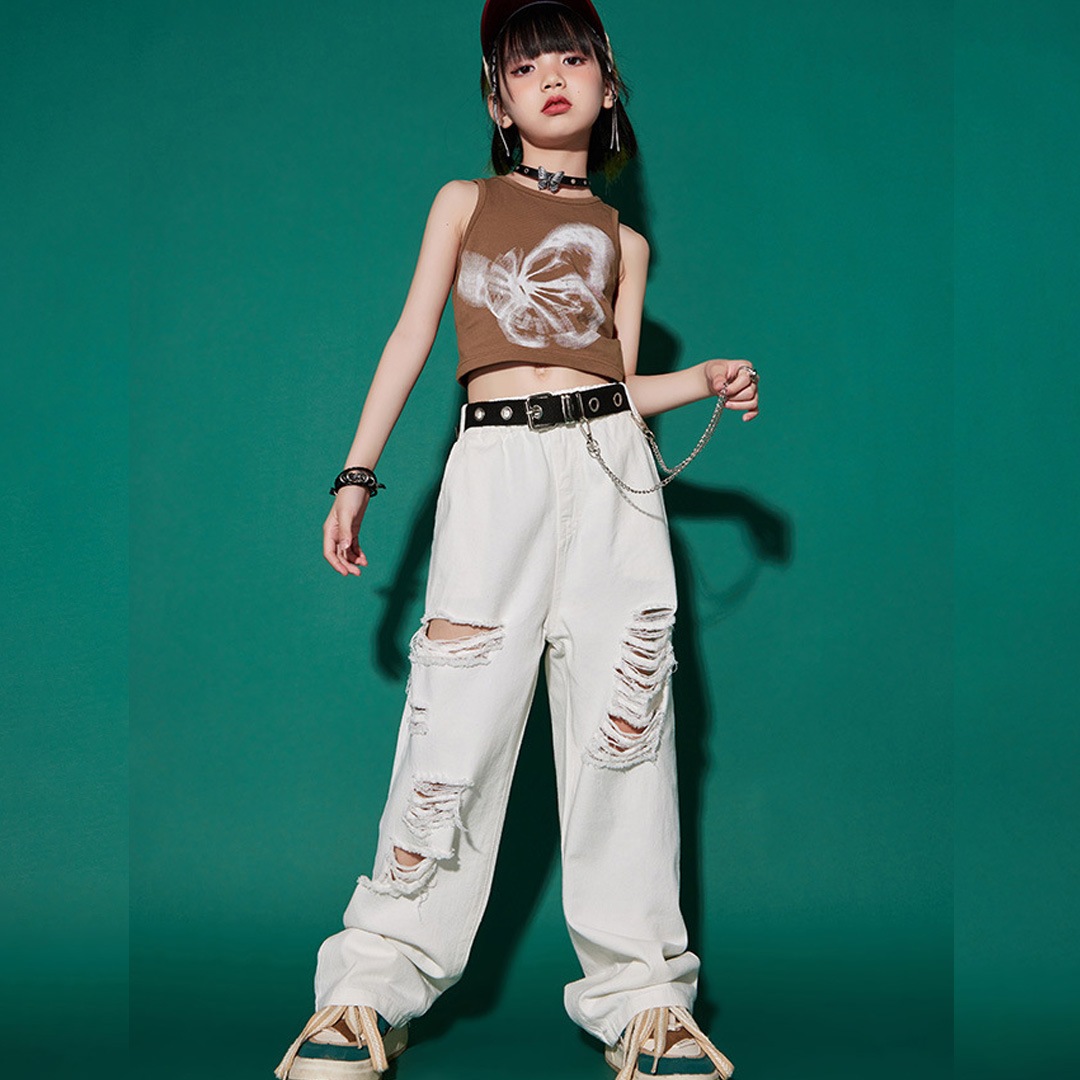 ガールズHIPHOP キッズダンス キッズ衣装 ホワイト ブラウン へそ出し ロングパンツ タンクトップ 110~180【dc-1617】