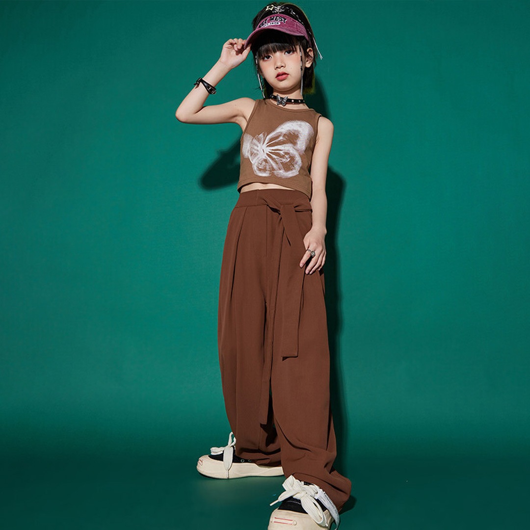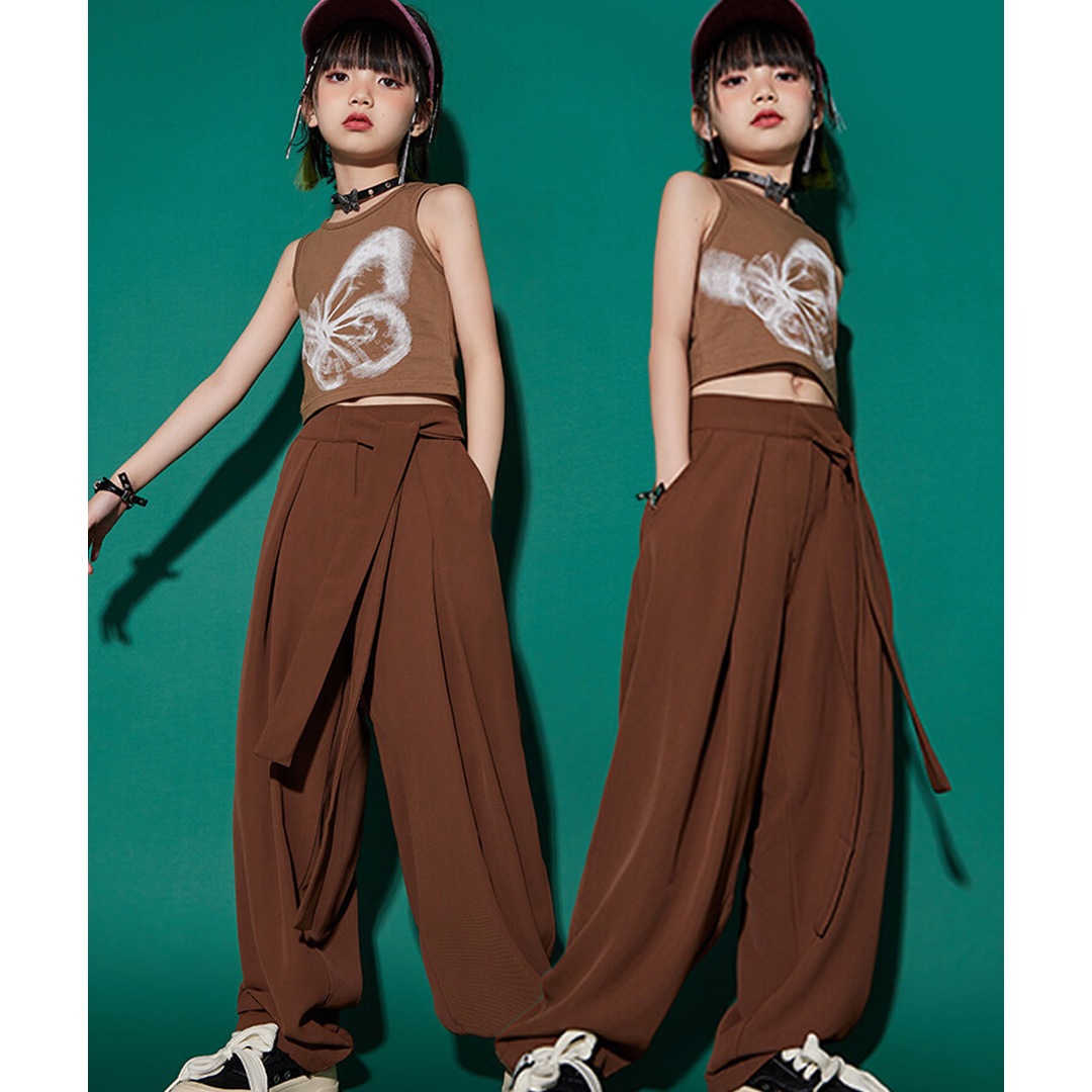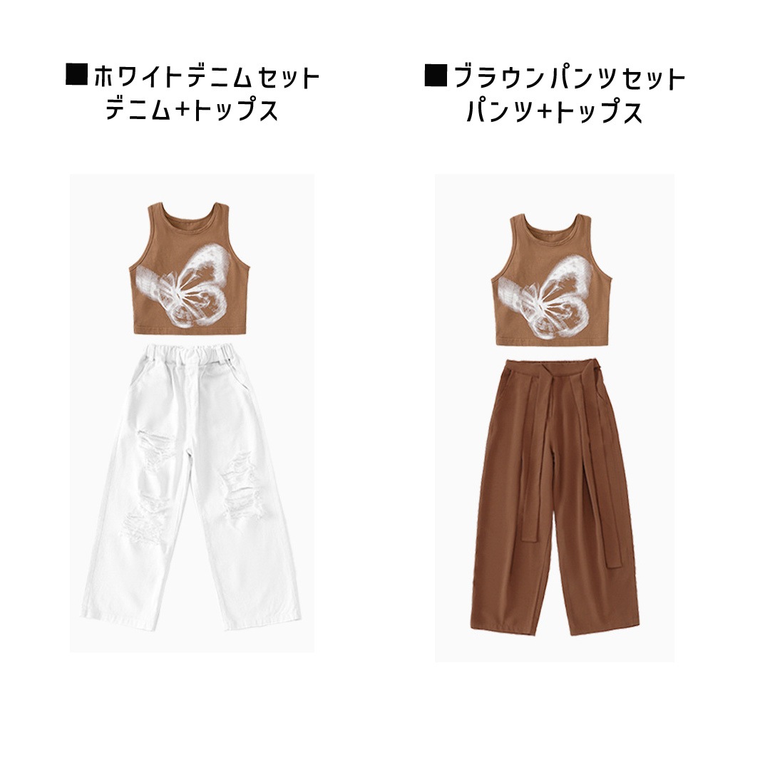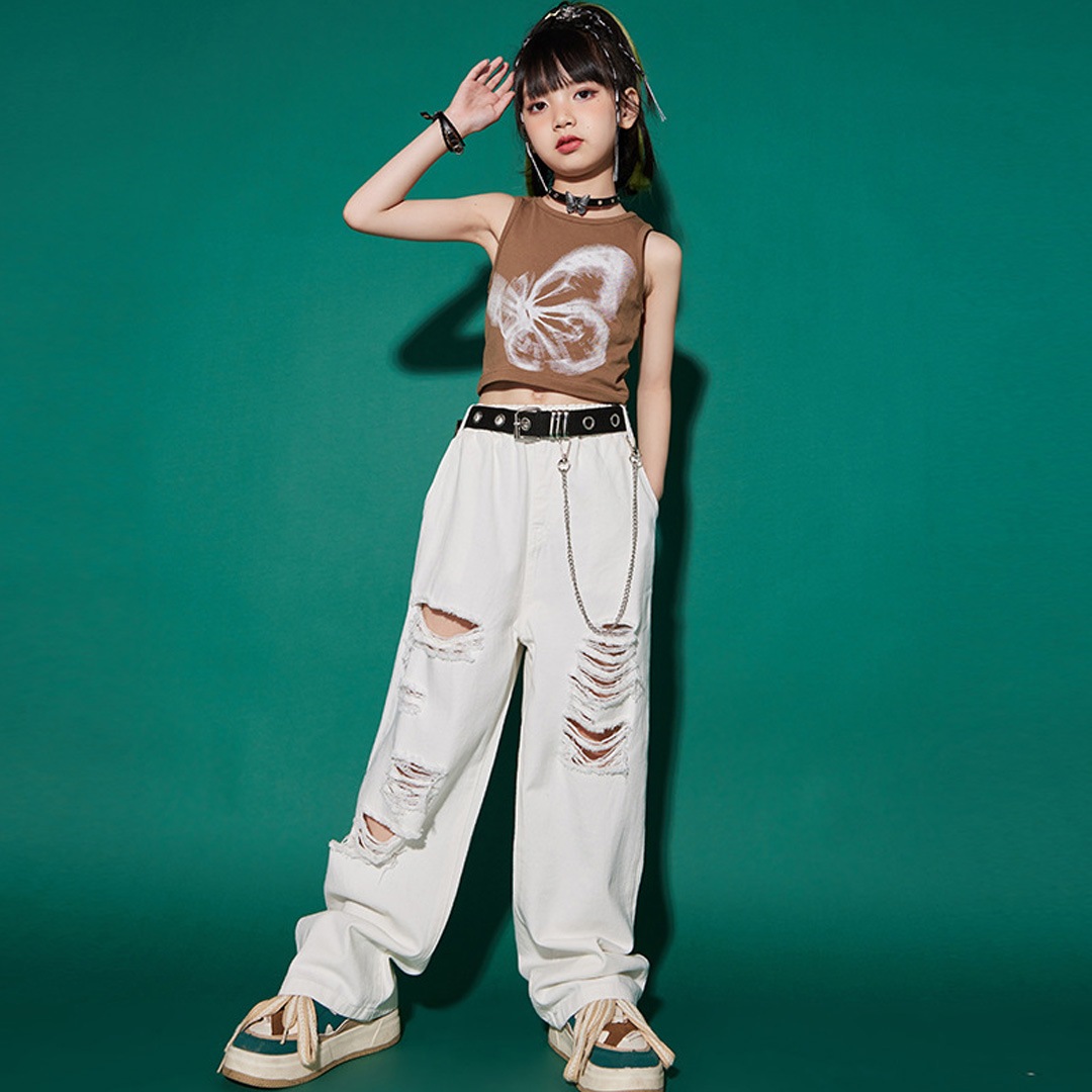 ガールズHIPHOP キッズダンス キッズ衣装 ホワイト ブラウン へそ出し ロングパンツ タンクトップ 110~180【dc-1617】