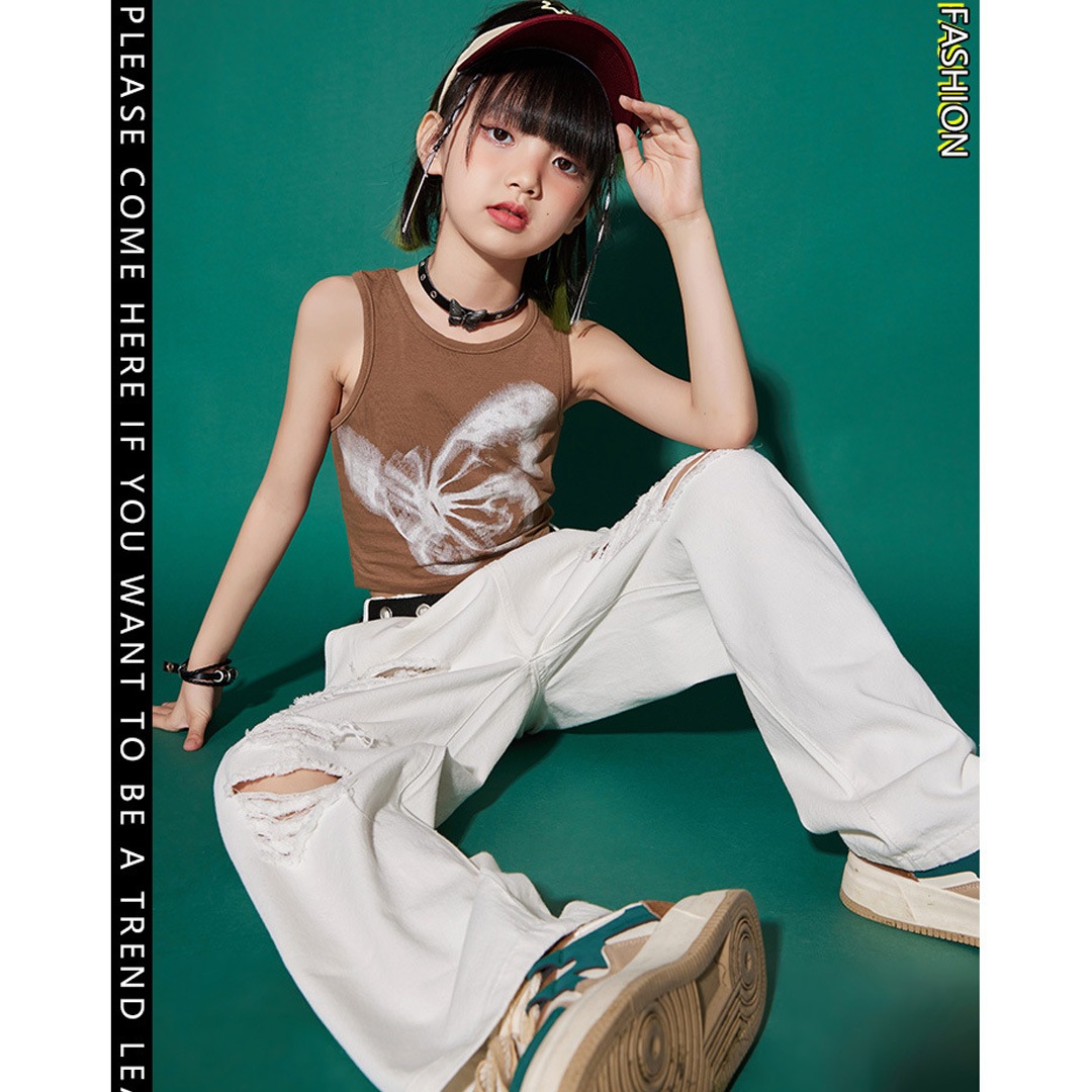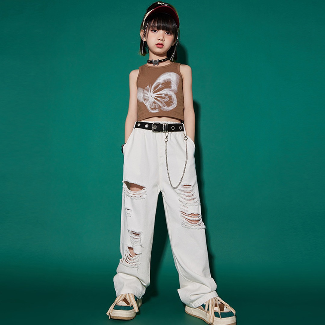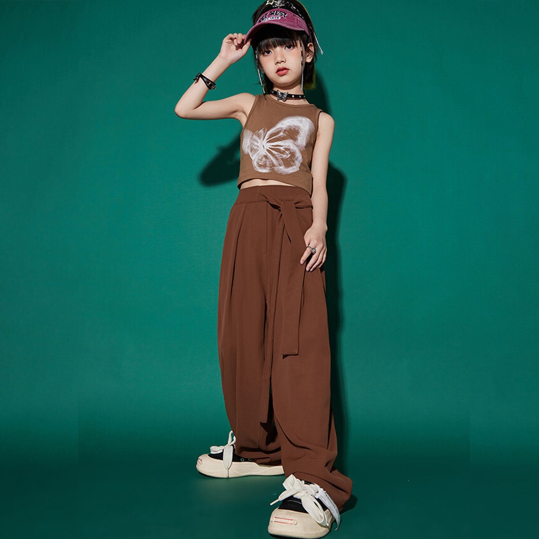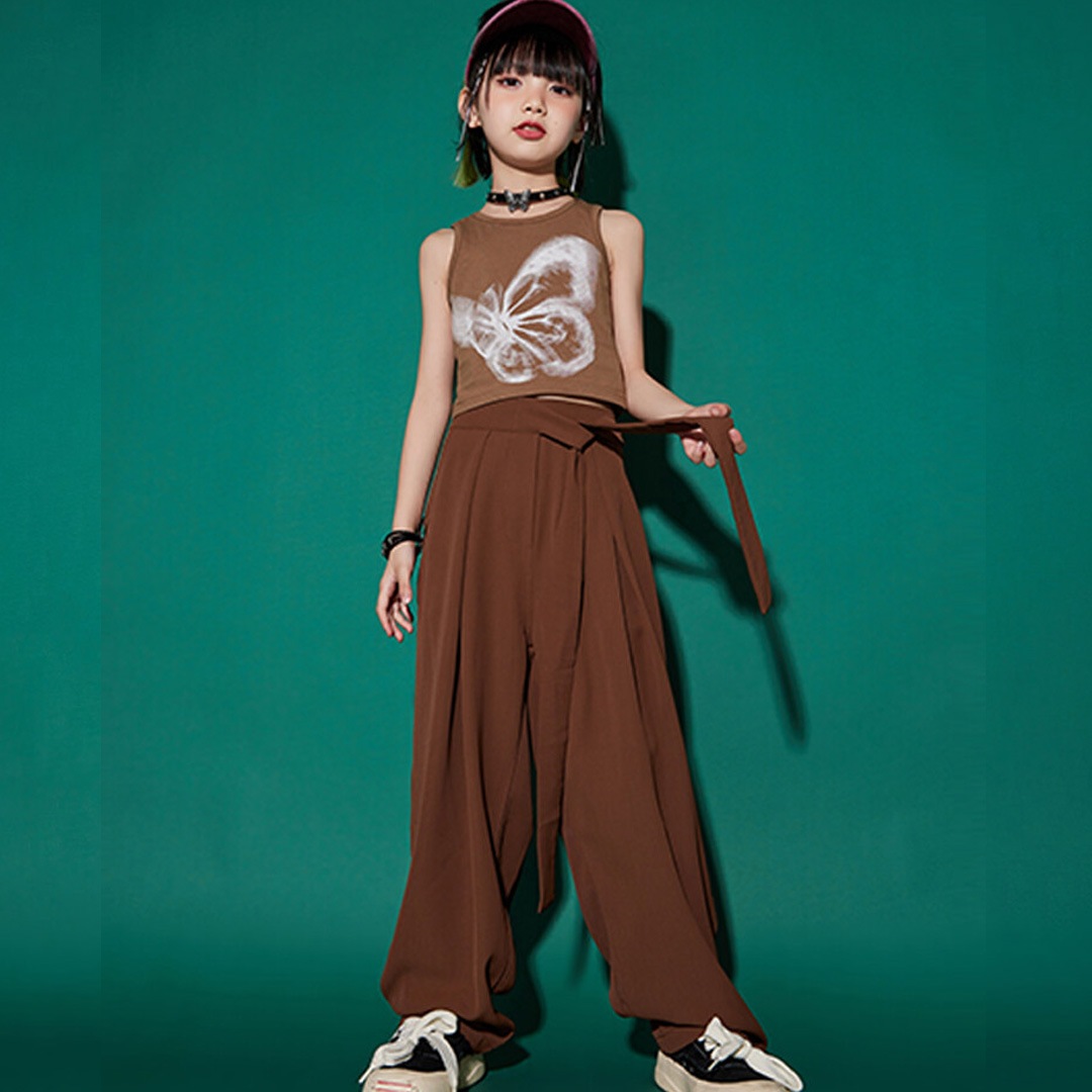 ガールズHIPHOP キッズダンス キッズ衣装 ホワイト ブラウン へそ出し ロングパンツ タンクトップ 110~180【dc-1617】