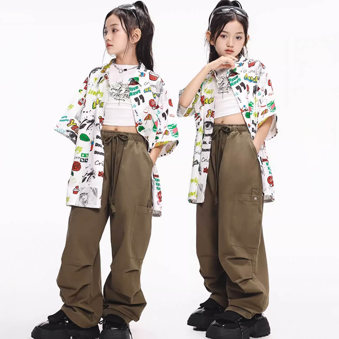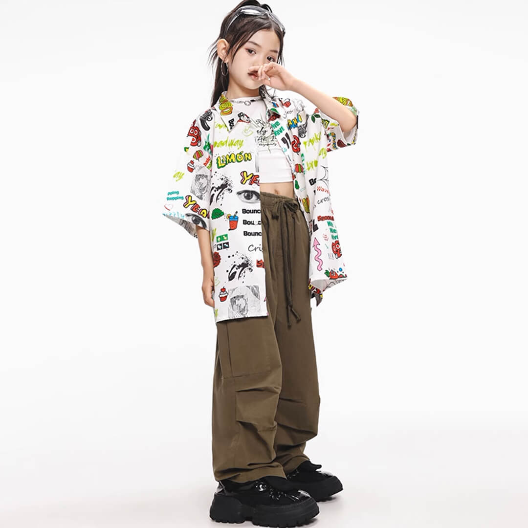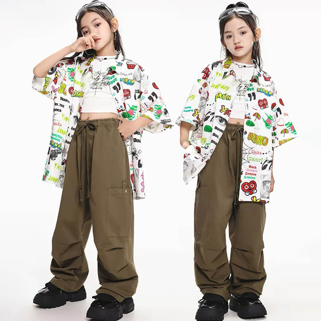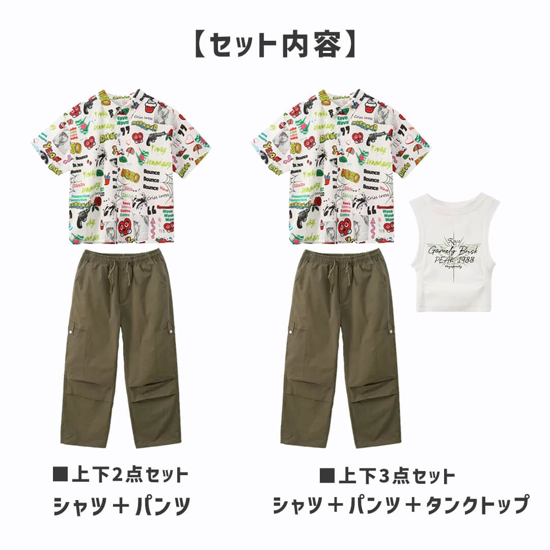 ユニセックス 柄シャツ ホワイト グリーン カーキ ロングパンツ カーゴパンツ 半袖 前開きシャツ HIPHOP衣装 キッズダンス衣装 110~180【dc-1690】