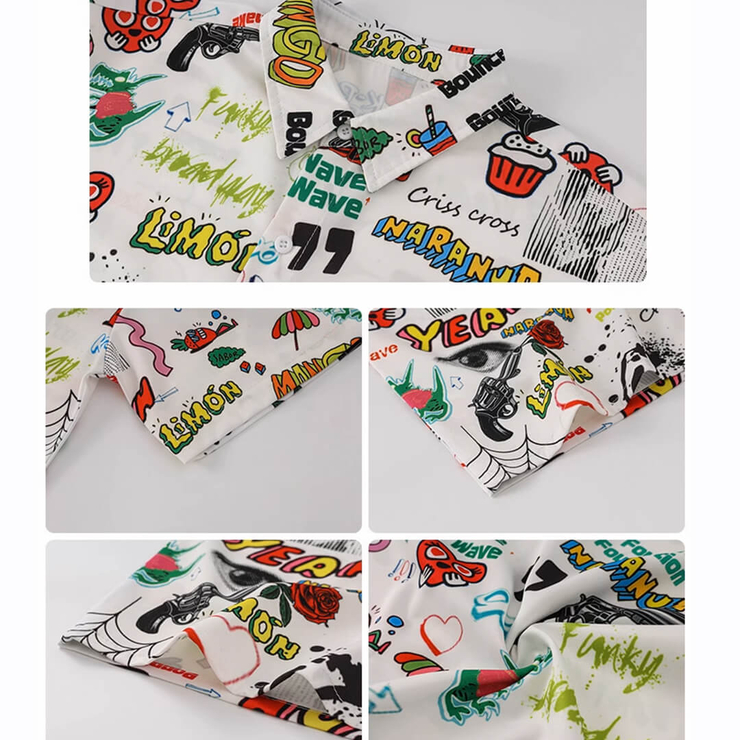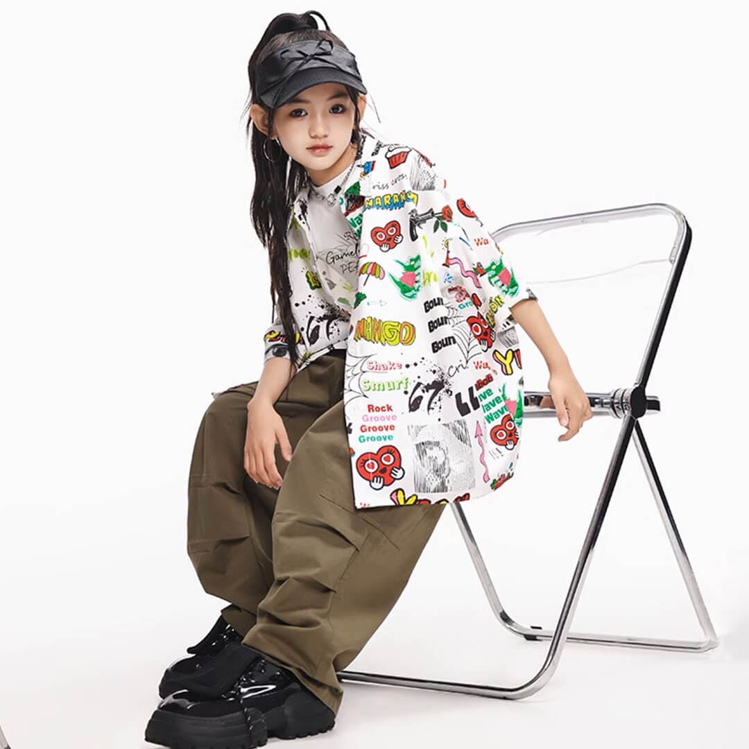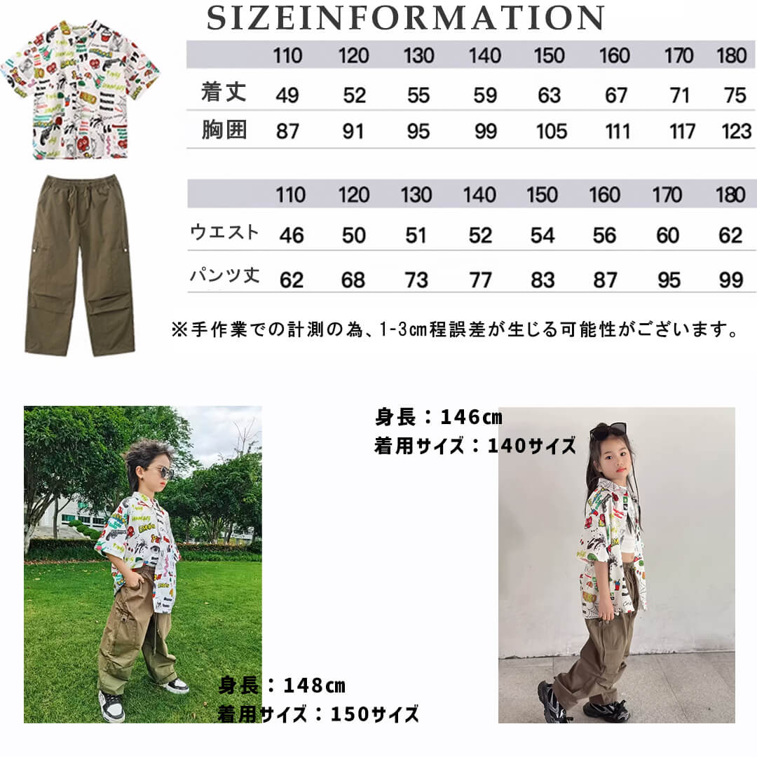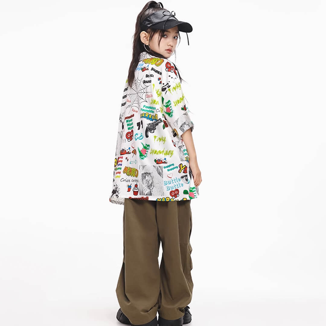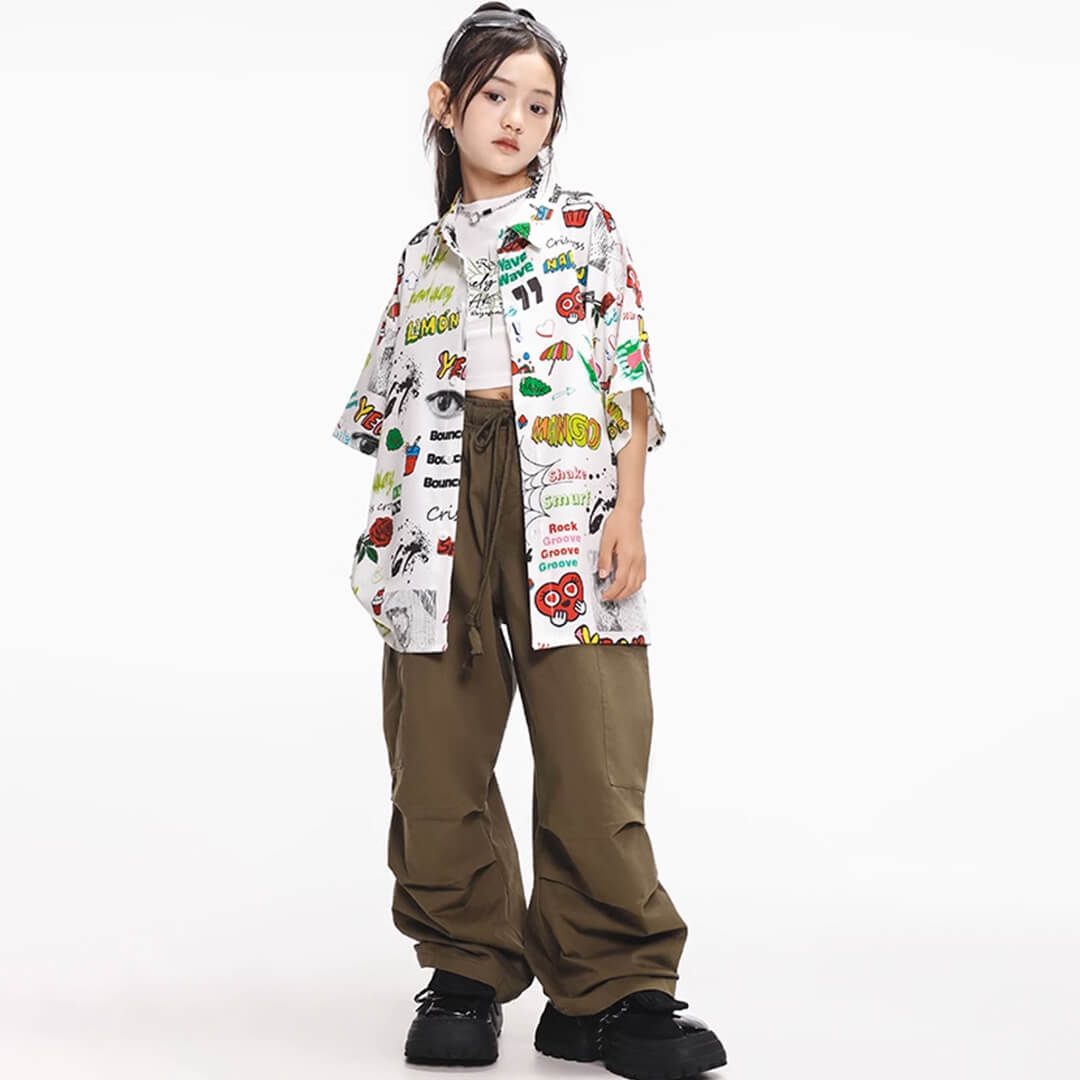 ユニセックス 柄シャツ ホワイト グリーン カーキ ロングパンツ カーゴパンツ 半袖 前開きシャツ HIPHOP衣装 キッズダンス衣装 110~180【dc-1690】