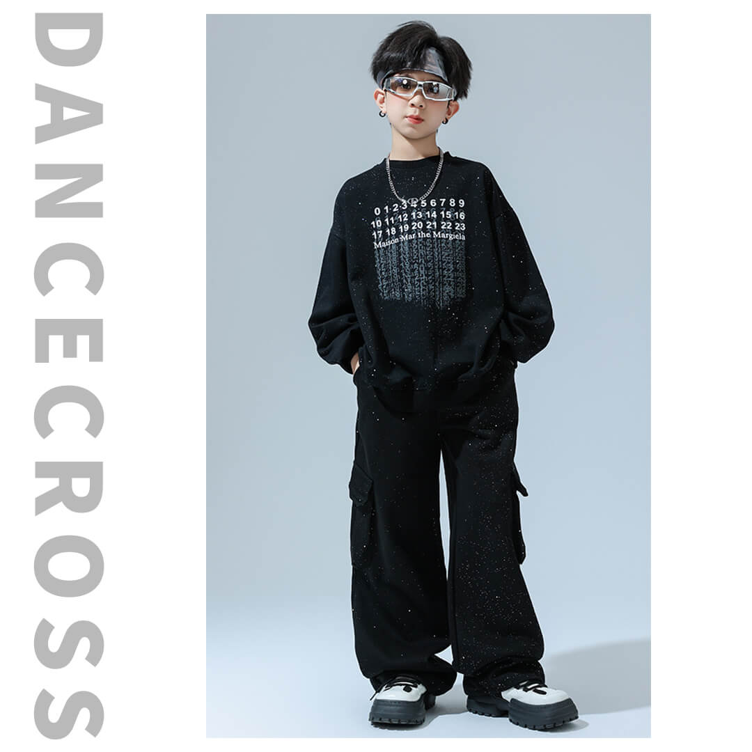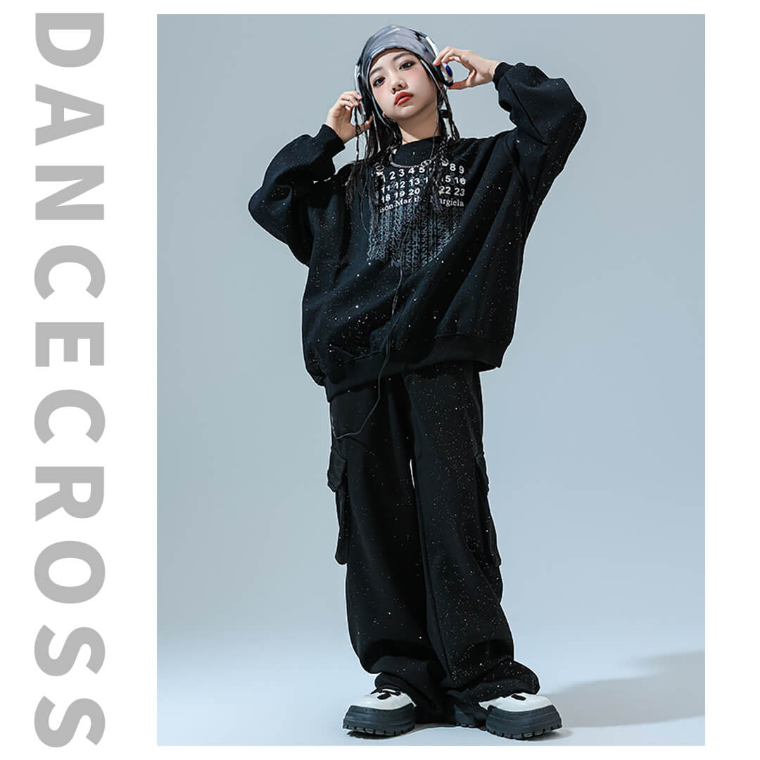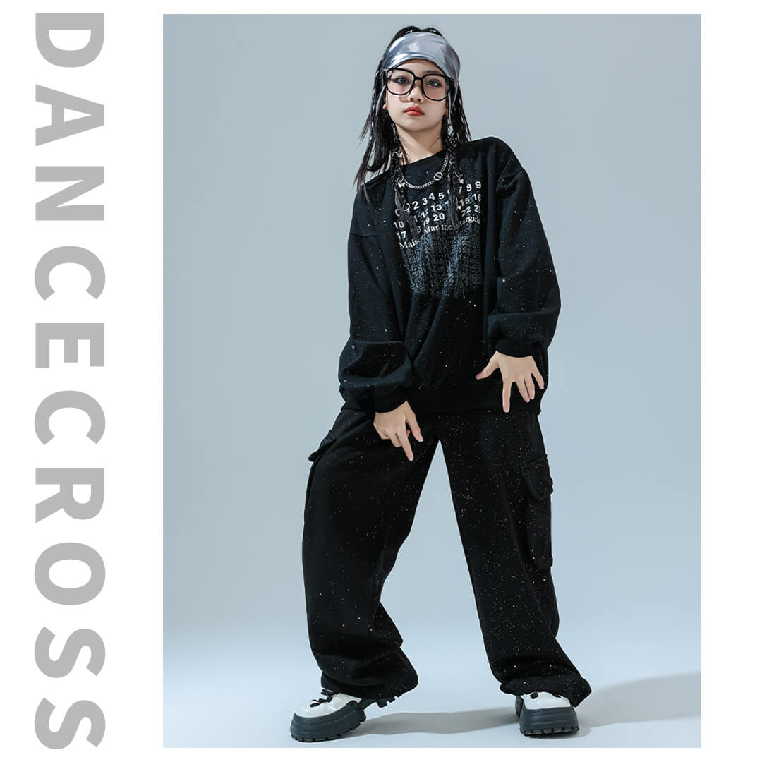 ユニセックス 長袖 トレーナー ロングパンツ カーゴパンツ ブラック モノトーン キラキラ HIPHOP衣装 キッズダンス衣装 110~180【dc-1865】