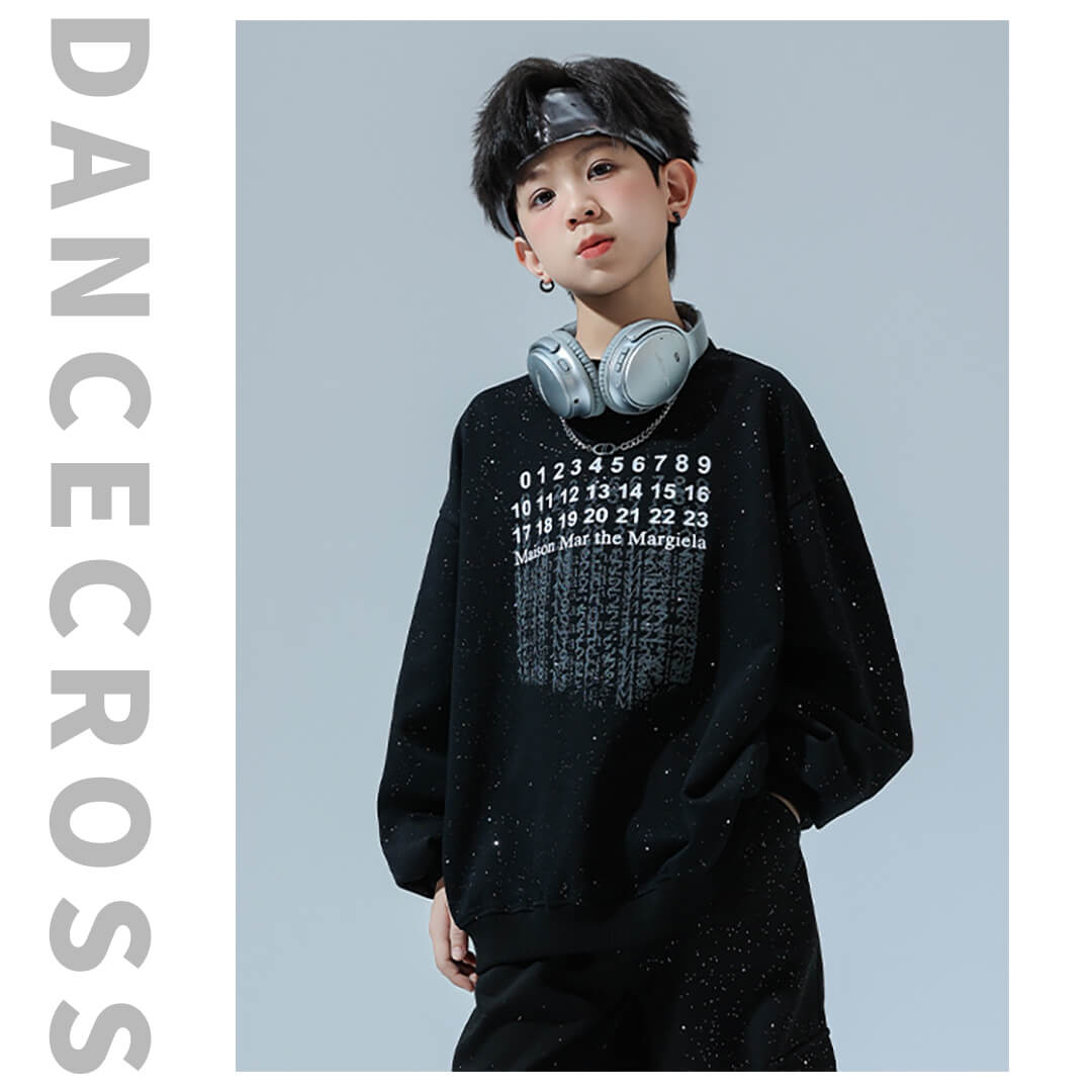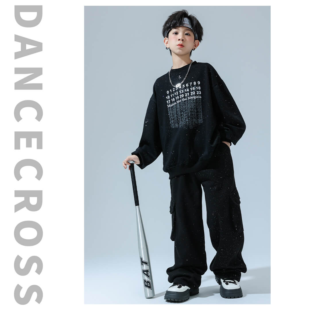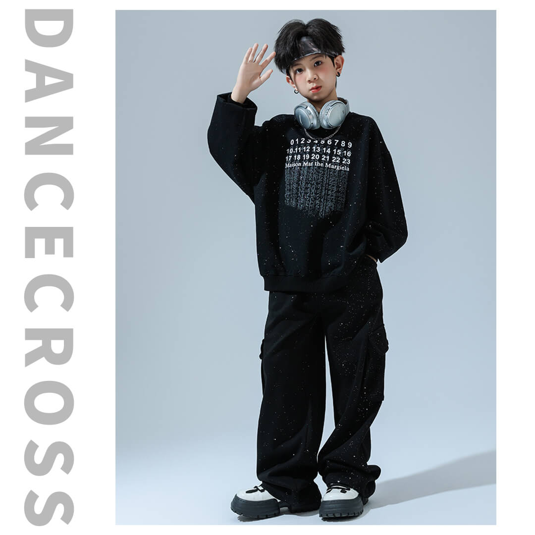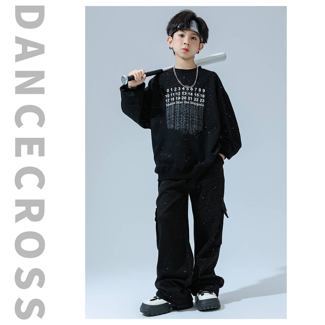 ユニセックス 長袖 トレーナー ロングパンツ カーゴパンツ ブラック モノトーン キラキラ HIPHOP衣装 キッズダンス衣装 110~180【dc-1865】