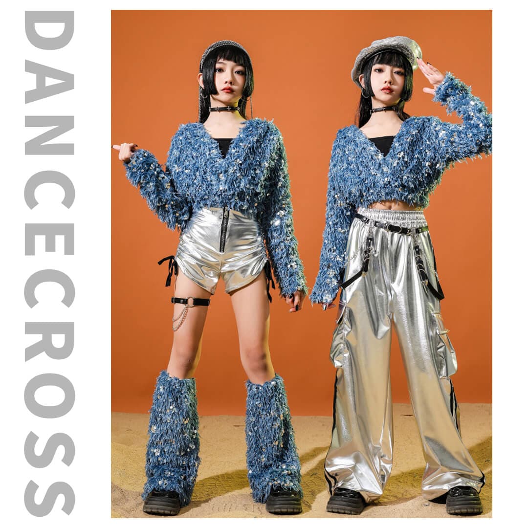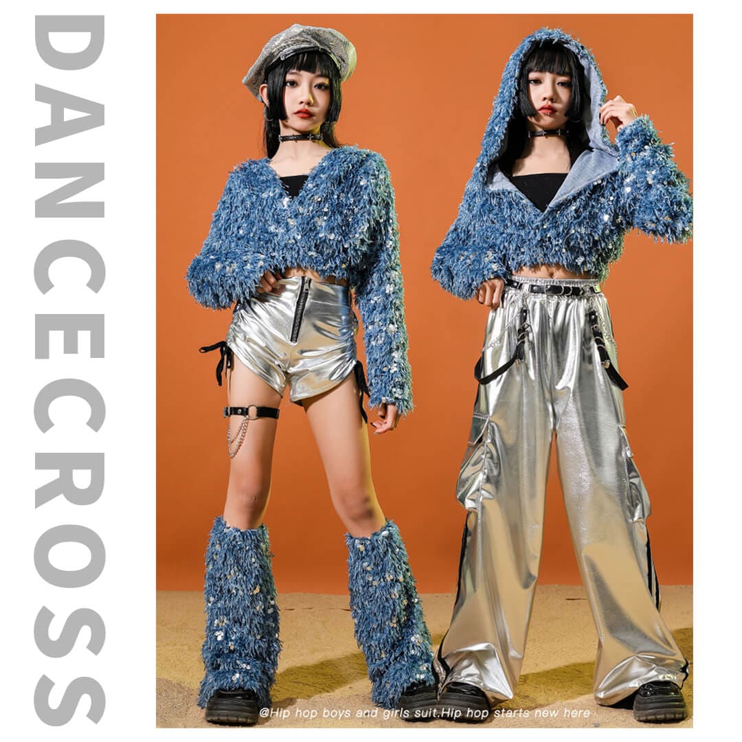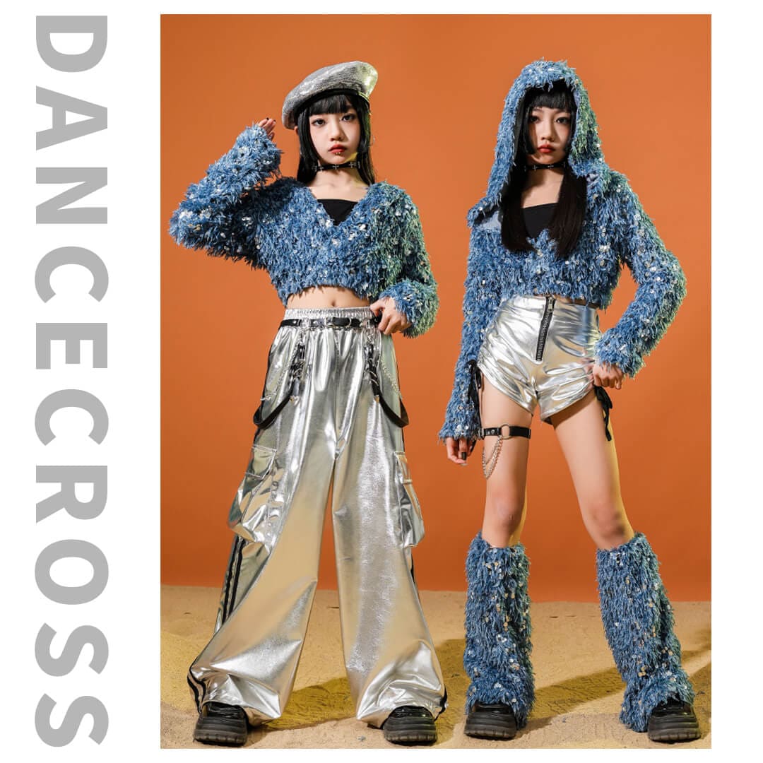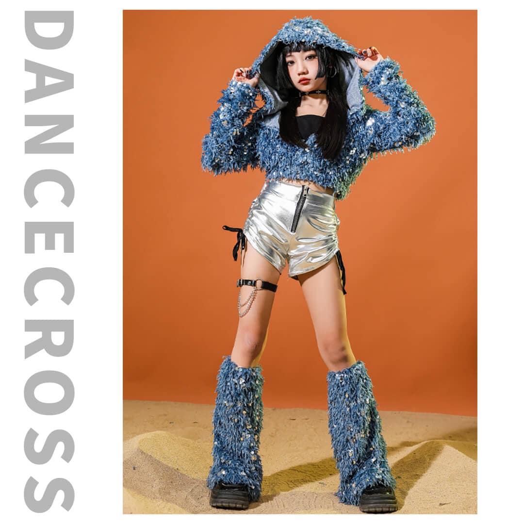 ガールズ衣装 ブルー シルバー スパンコール 長袖 ショートパンツ ロングパンツ フェイクレザー フード へそ出し K-POP 韓国 ファッション キッズダンス キッズ衣装 110-180【dc-1888】