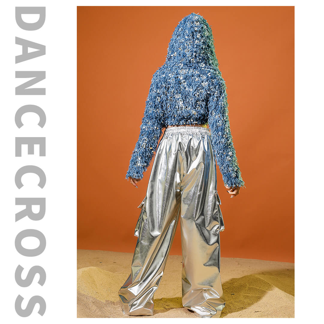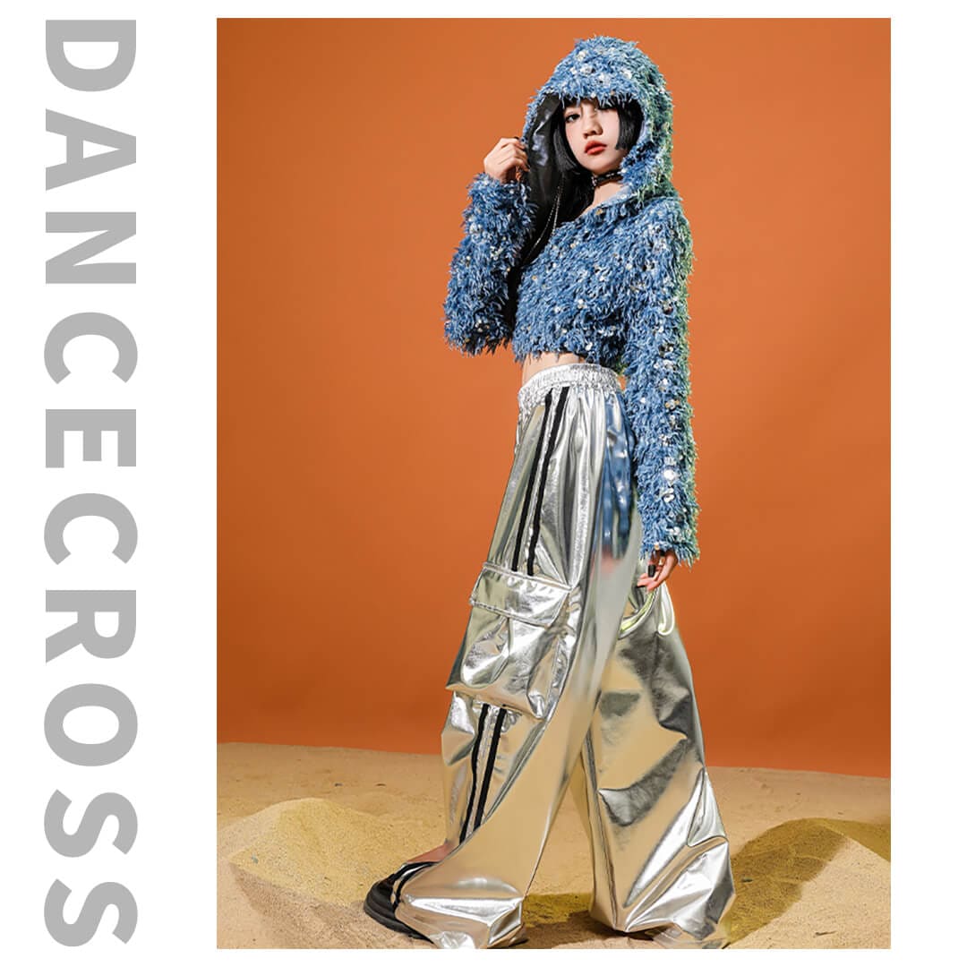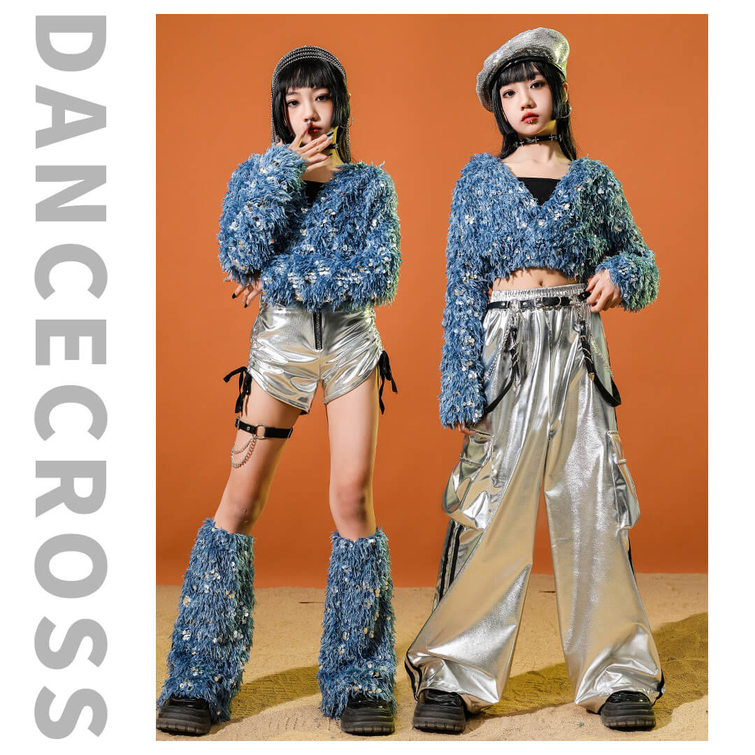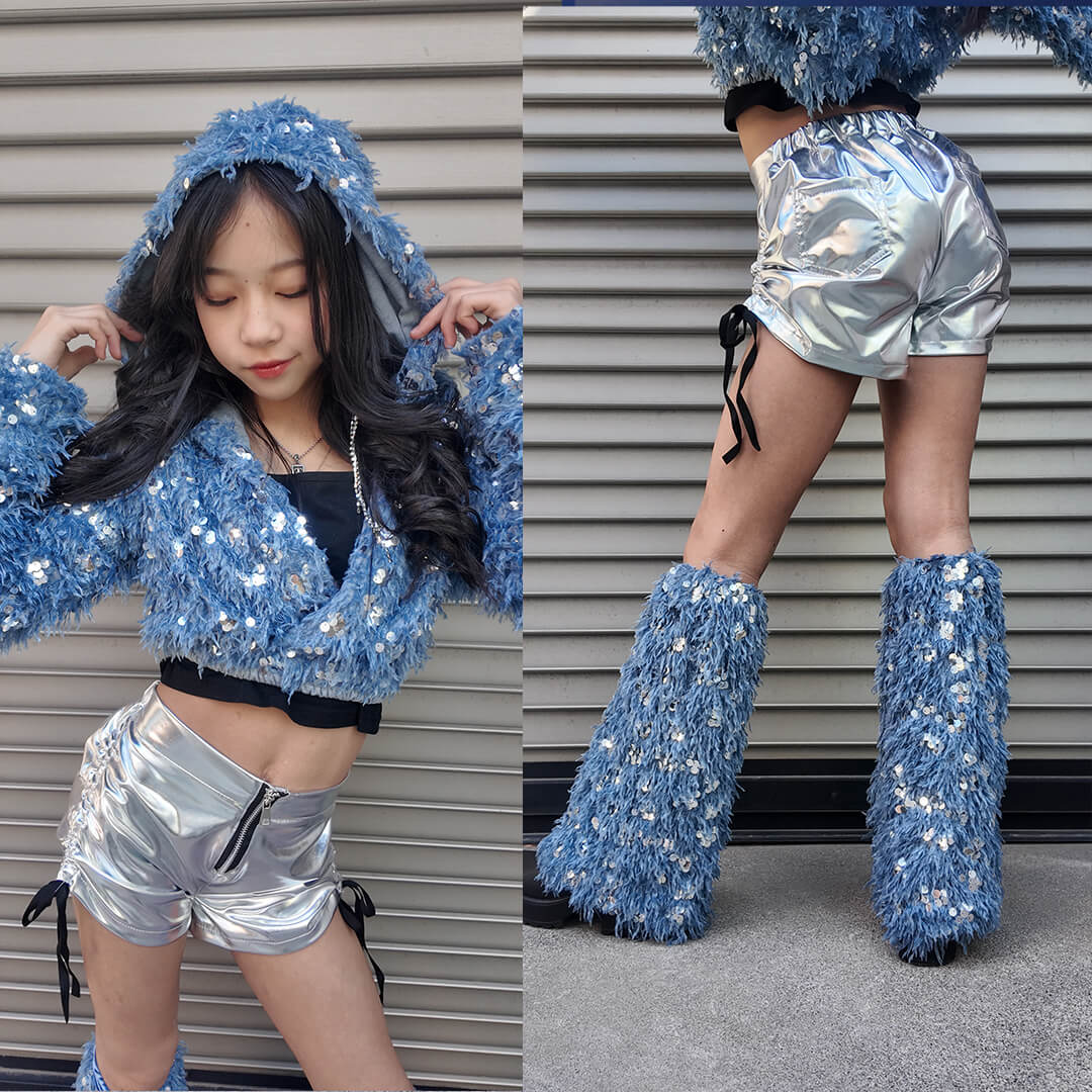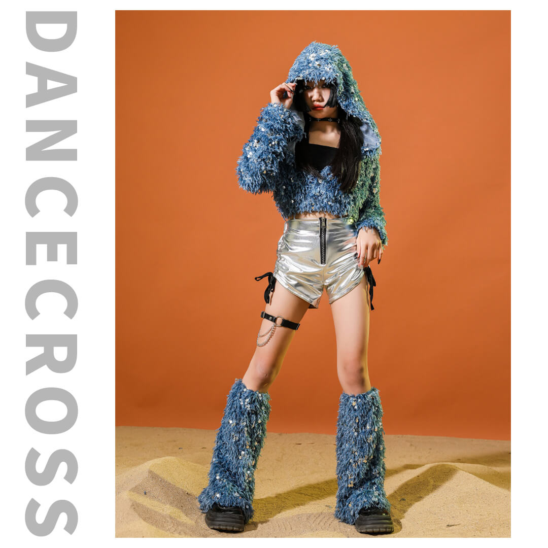ガールズ衣装 ブルー シルバー スパンコール 長袖 ショートパンツ ロングパンツ フェイクレザー フード へそ出し K-POP 韓国 ファッション キッズダンス キッズ衣装 110-180【dc-1888】