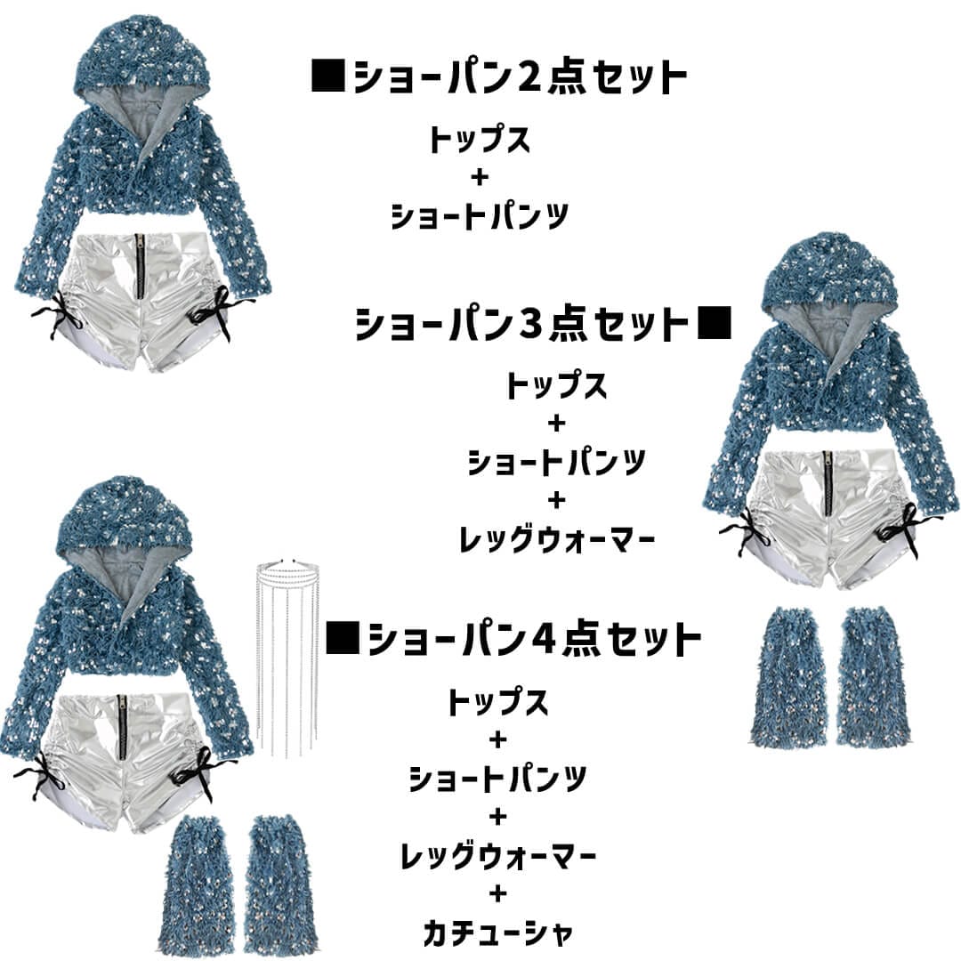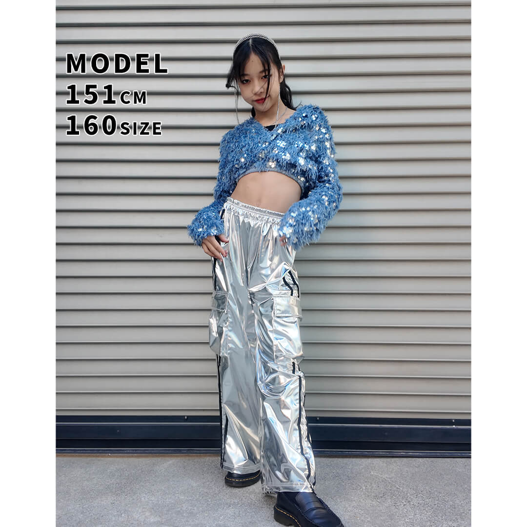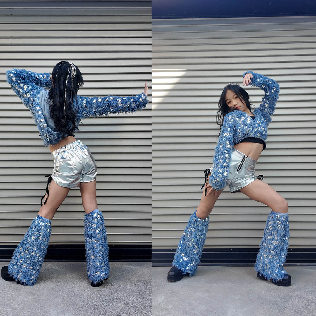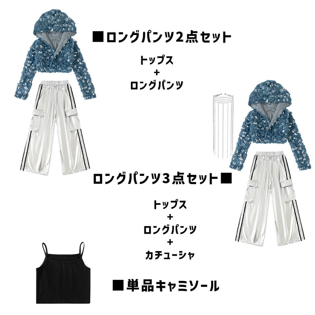 ガールズ衣装 ブルー シルバー スパンコール 長袖 ショートパンツ ロングパンツ フェイクレザー フード へそ出し K-POP 韓国 ファッション キッズダンス キッズ衣装 110-180【dc-1888】