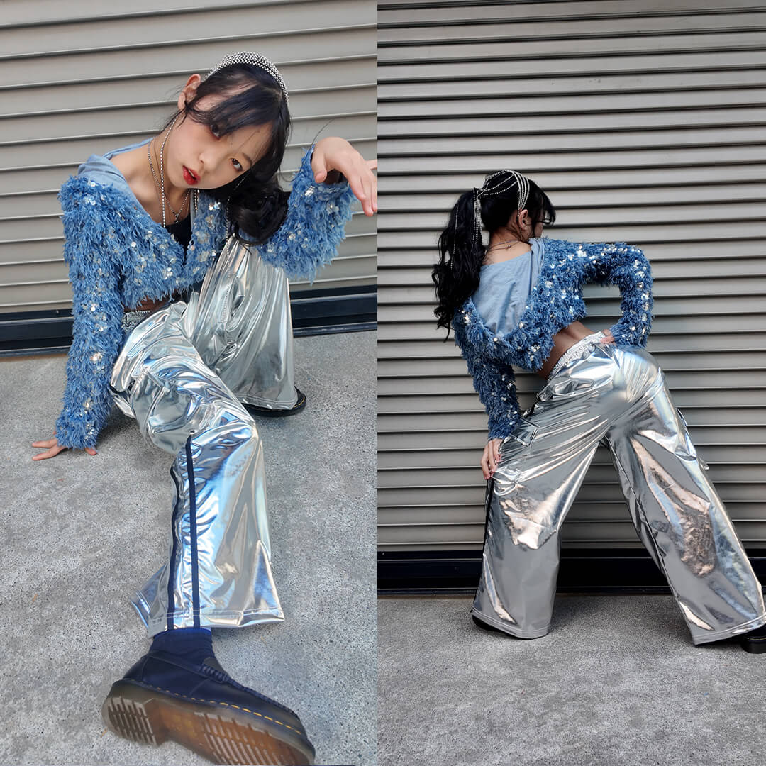 デザインは、ファッション性だけではなく、動きやすさも追求しました。フェイクレザーパンツは軽やかでありながら、強さを兼ね備え、お子様が自由に踊れる快適さを提供します。長袖のトップスとショートパンツ、ロングパンツから選べる構成は、シーンに応じてアレンジ可能。ユニークでありながら、実用性も兼ね備えています。