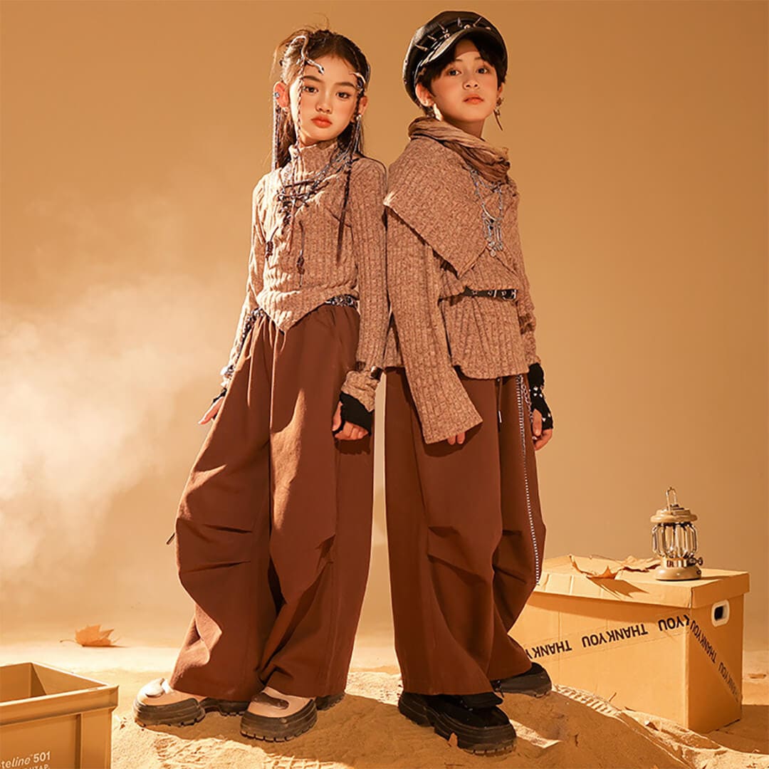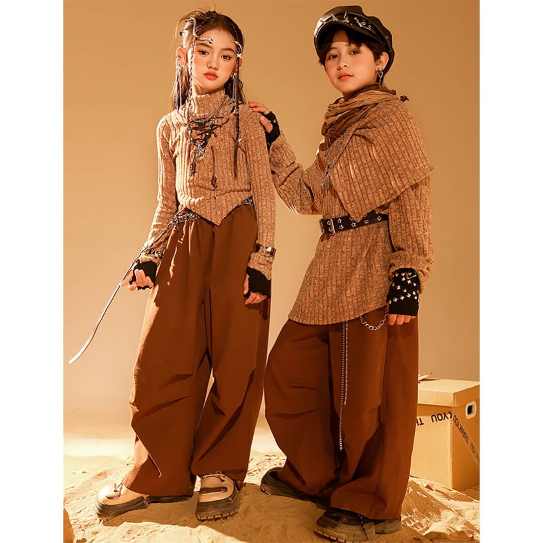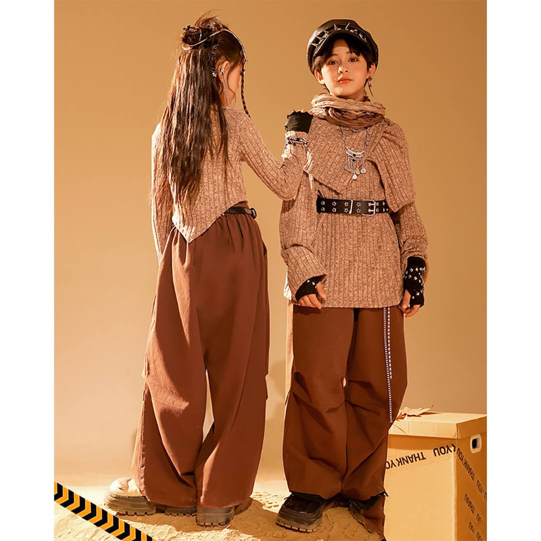 男女MIX ブラウン 長袖 ロングパンツ カーゴパンツ ベルト 映え衣装 ヴィンテージ  K-POP HIPHOP衣装 キッズダンス衣装 110~180【dc-1849】