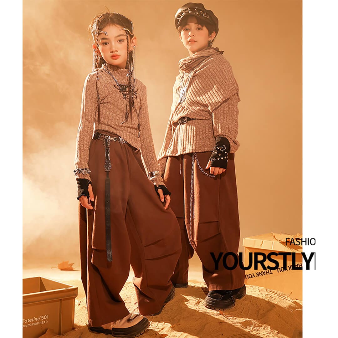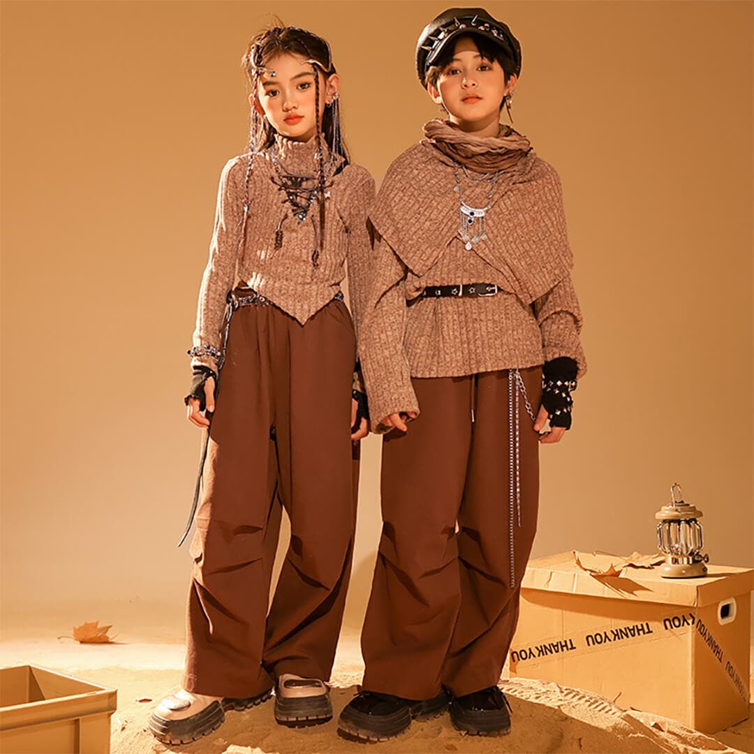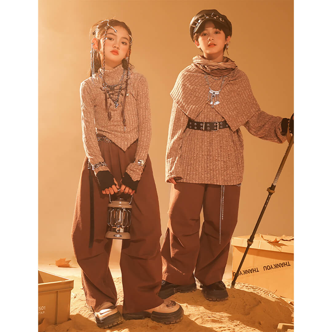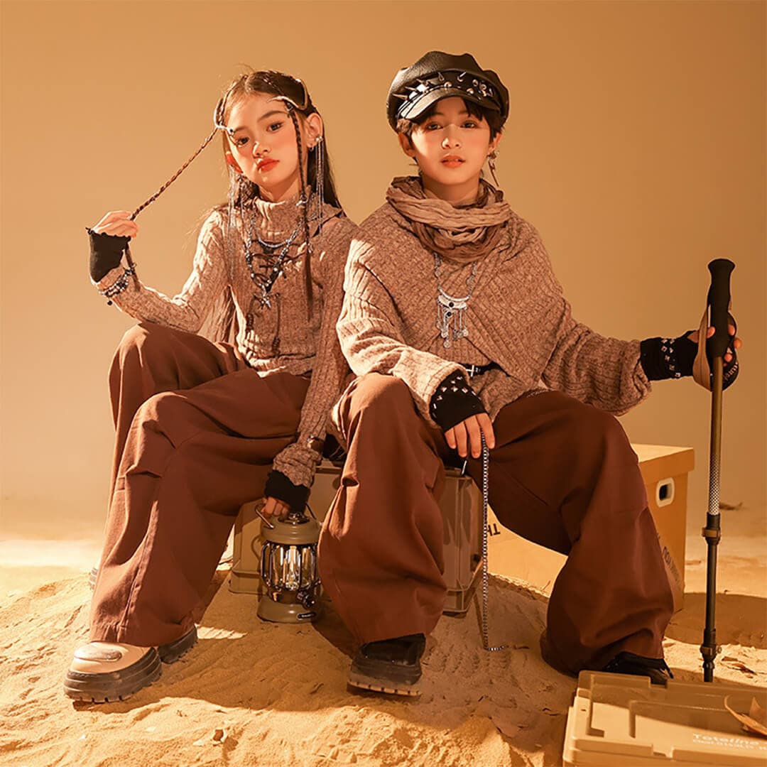 男女MIX ブラウン 長袖 ロングパンツ カーゴパンツ ベルト 映え衣装 ヴィンテージ  K-POP HIPHOP衣装 キッズダンス衣装 110~180【dc-1849】