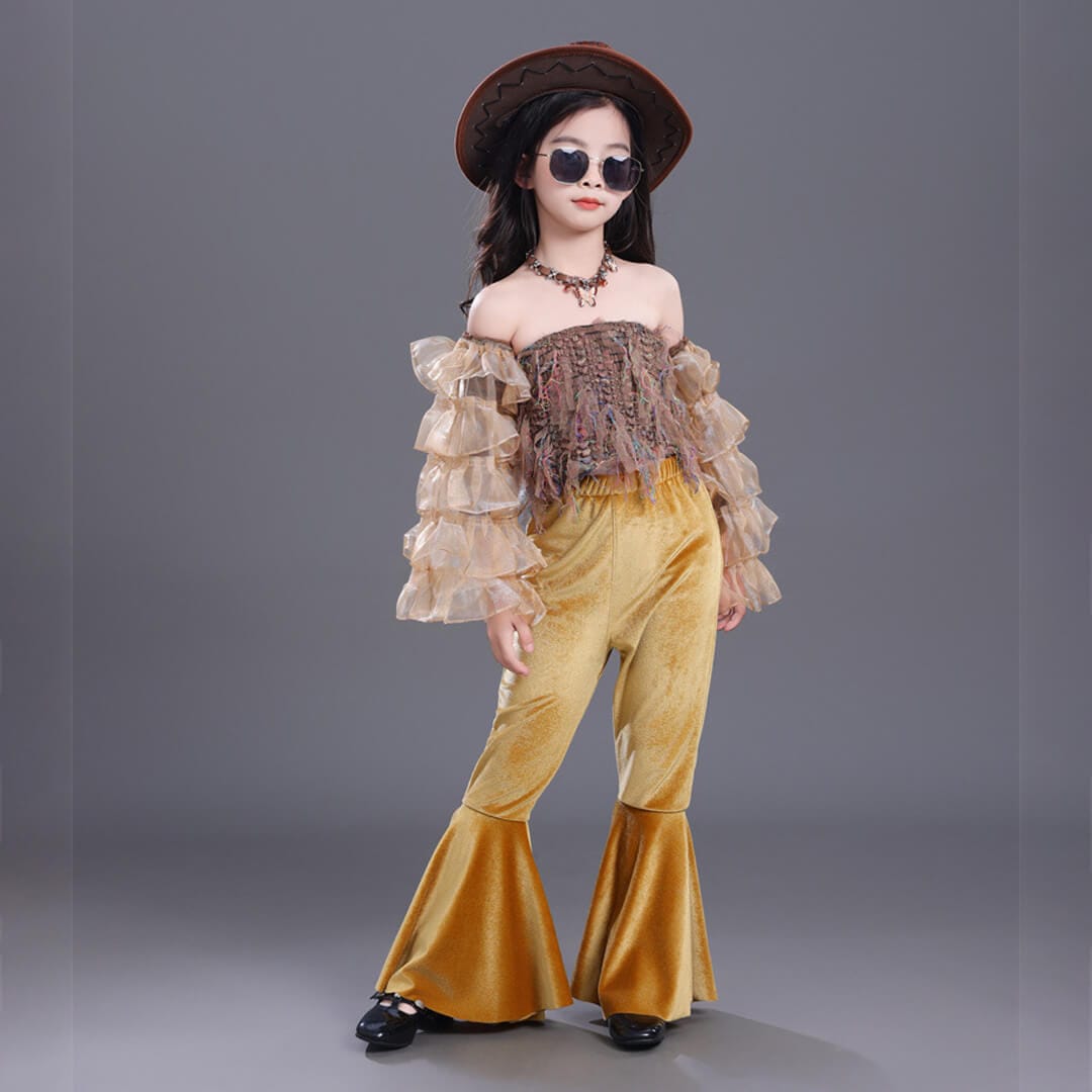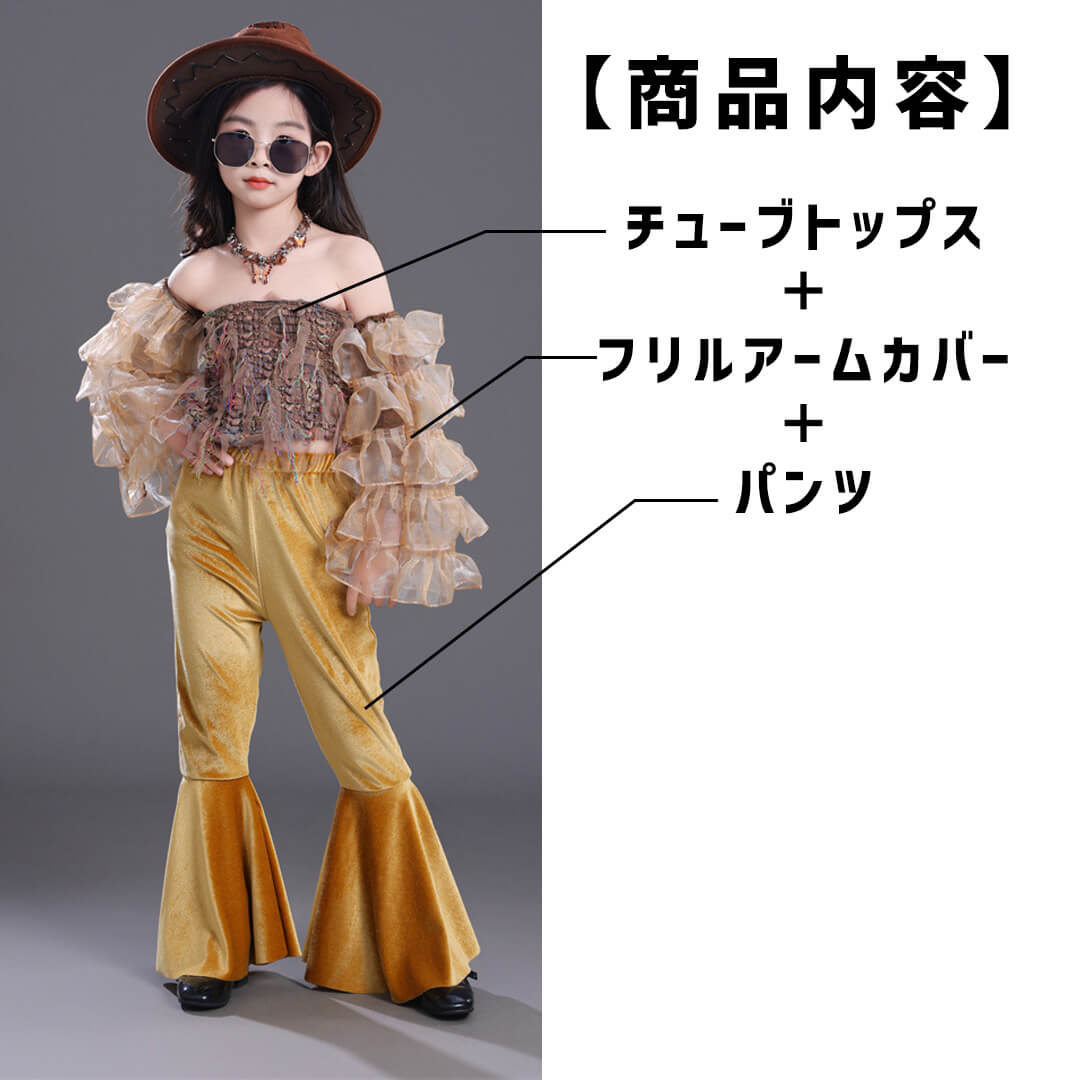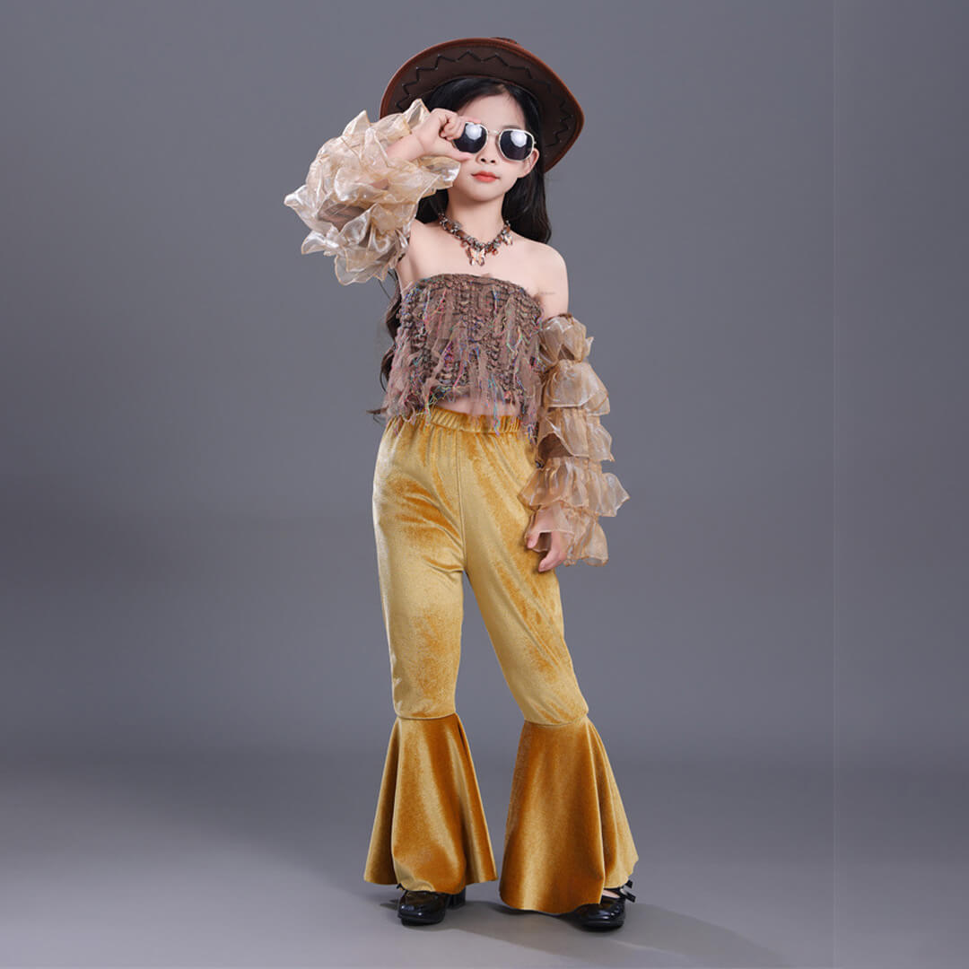 ガールズ Jazz イエロー ブラウン へそ出し 個性的 半袖 フレアパンツ ボヘミアン ベロア フリル レトロスタイル 韓国 カラーパンツ キッズダンス 衣装 110~160【dc-1925】