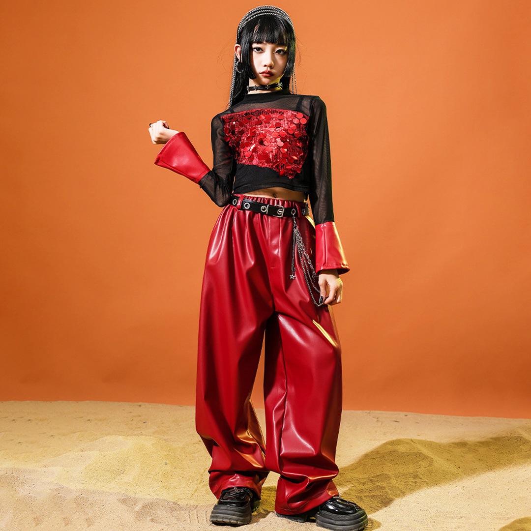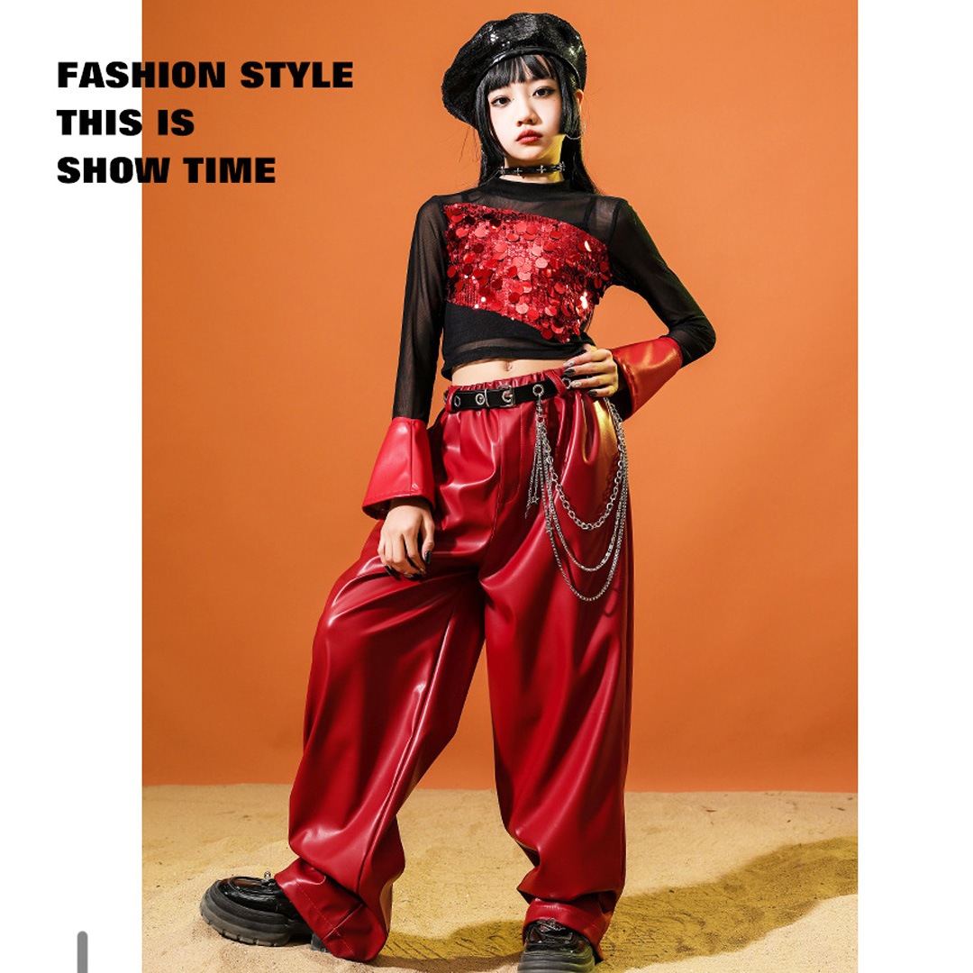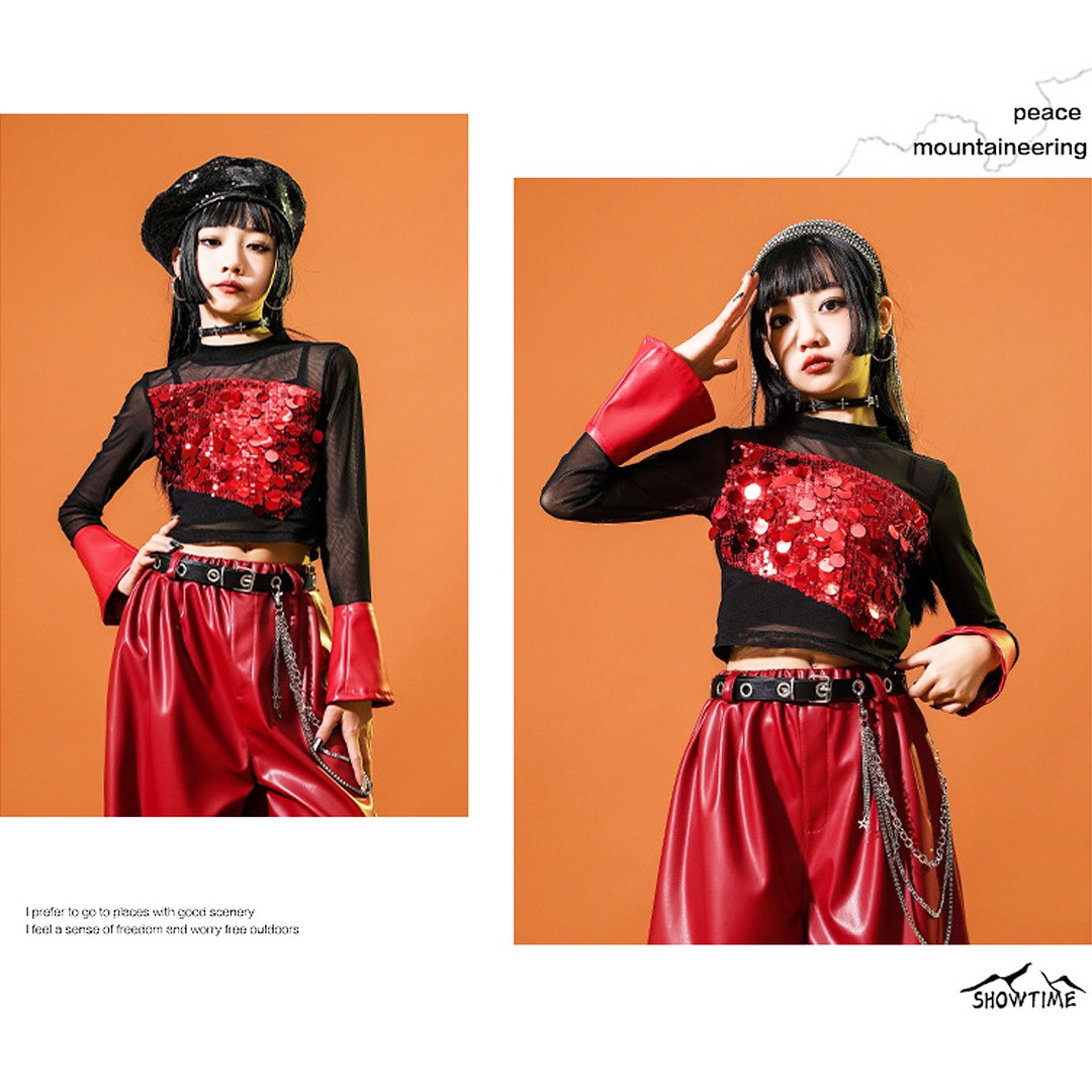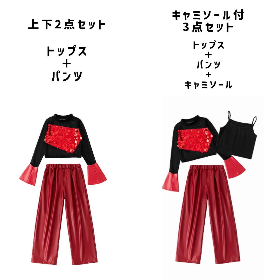 ガールズ K-POP 韓国 ブラック レッド ロングパンツ スパンコール シアー フェイクレザー へそ出し 長袖 キッズダンス キッズ衣装 110~180【dc-1895】