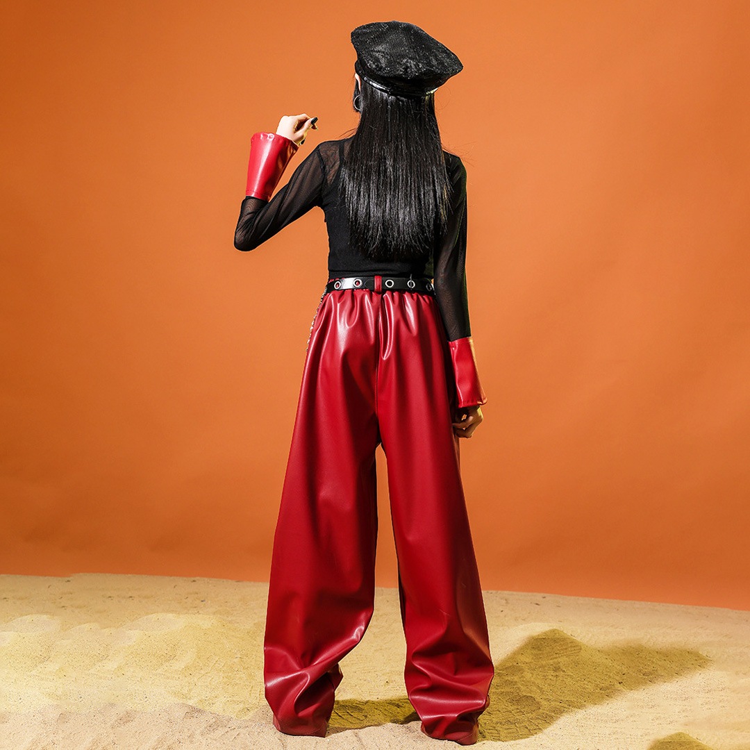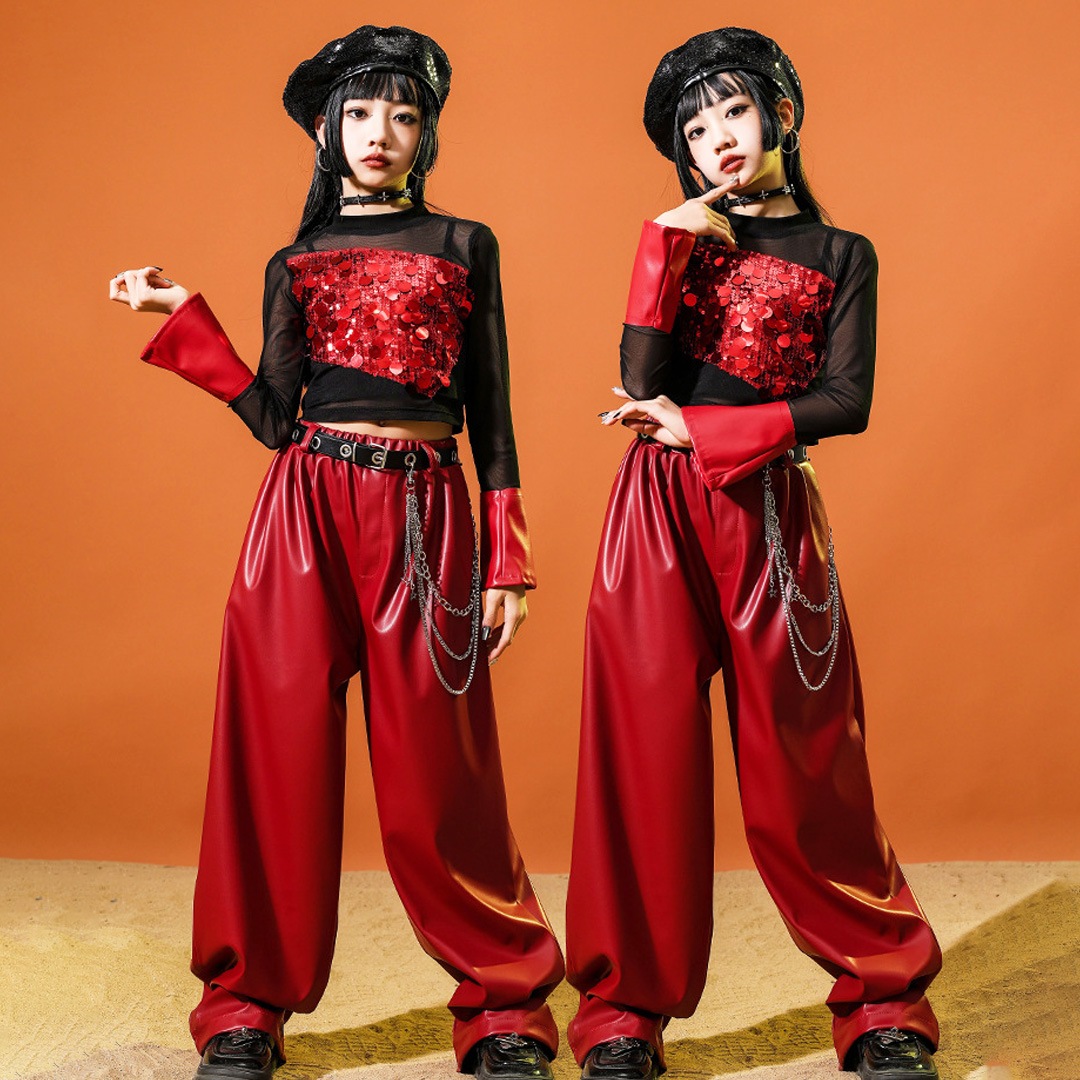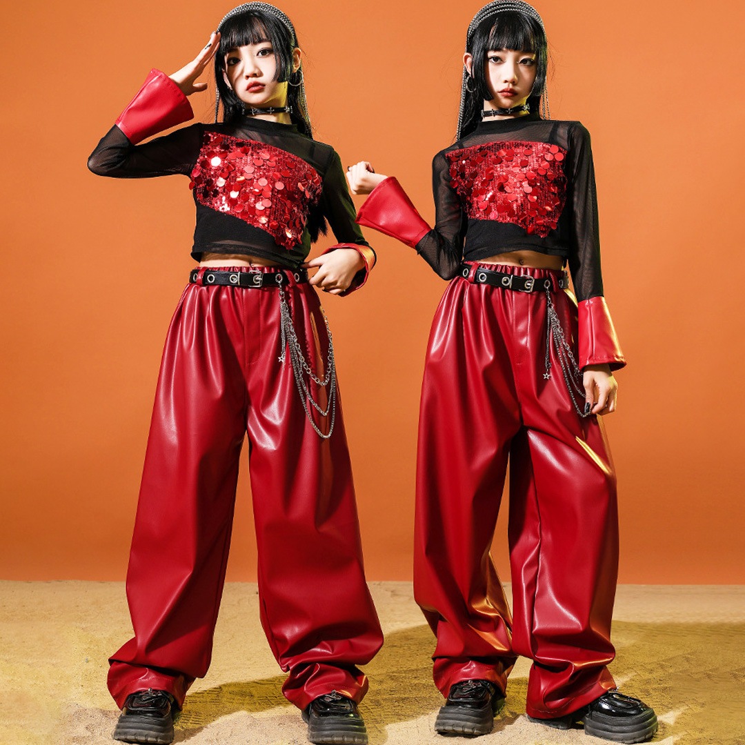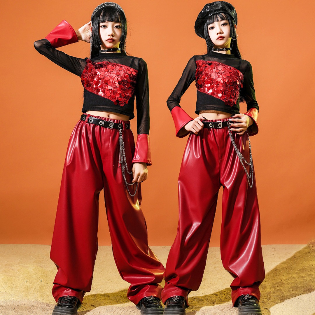 ガールズ K-POP 韓国 ブラック レッド ロングパンツ スパンコール シアー フェイクレザー へそ出し 長袖 キッズダンス キッズ衣装 110~180【dc-1895】