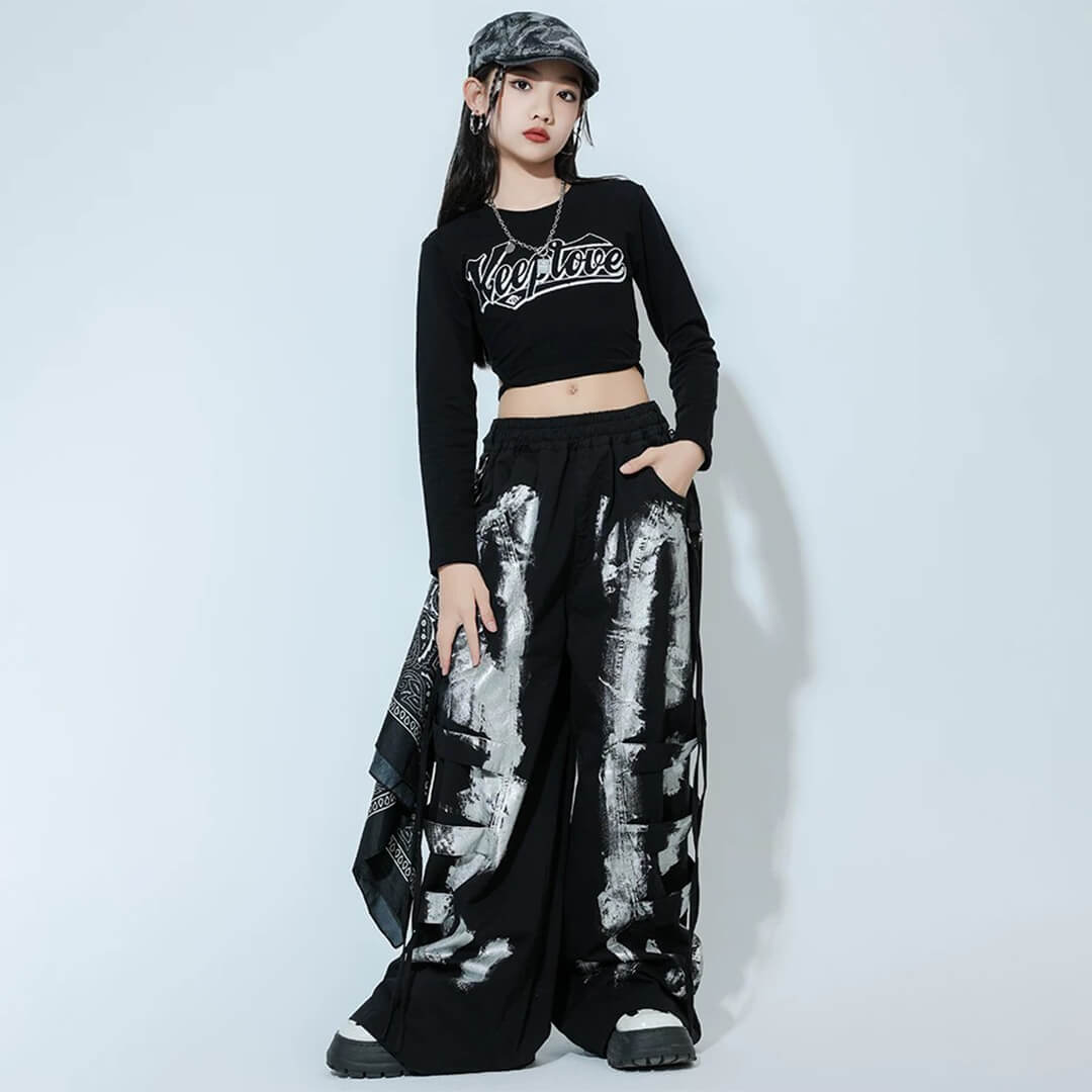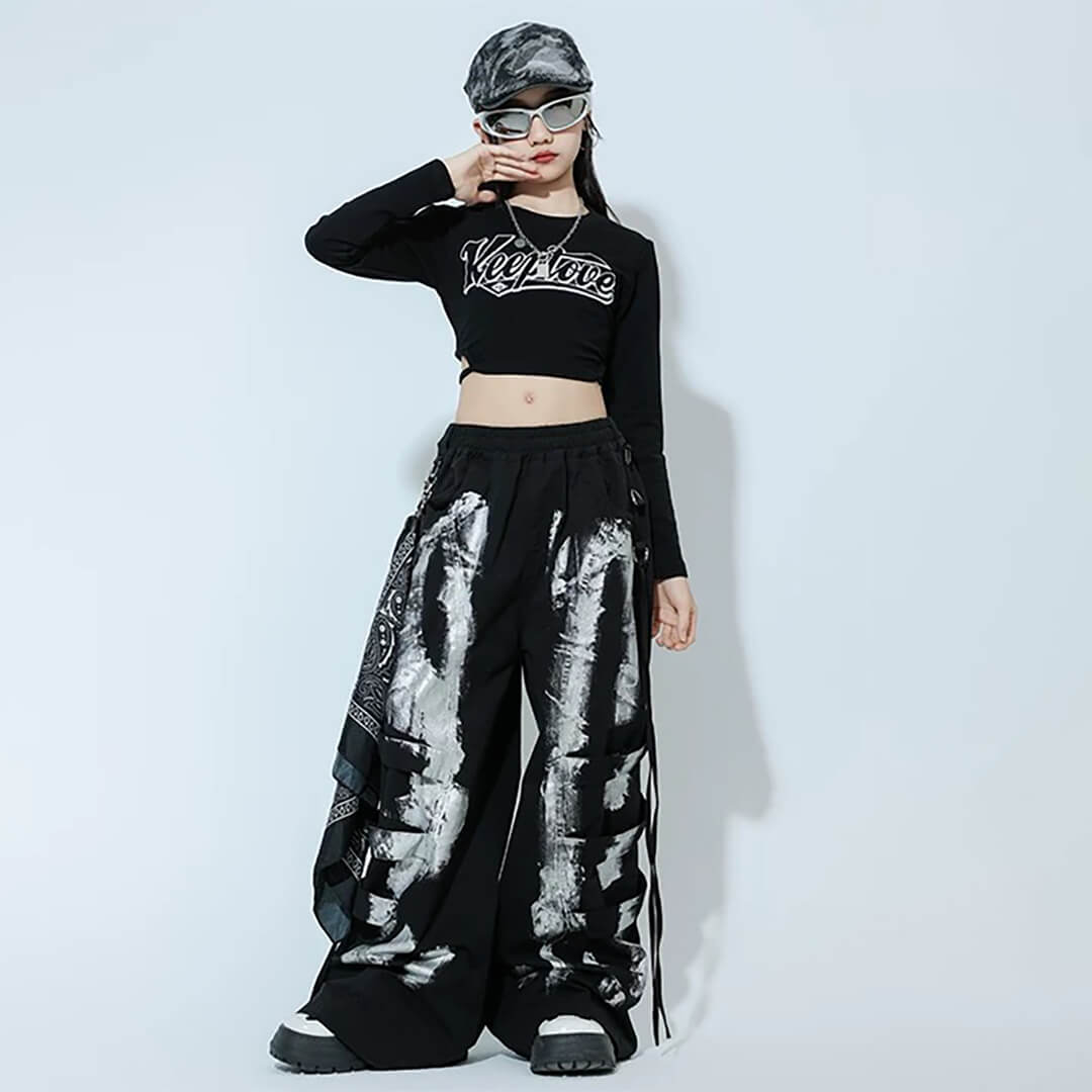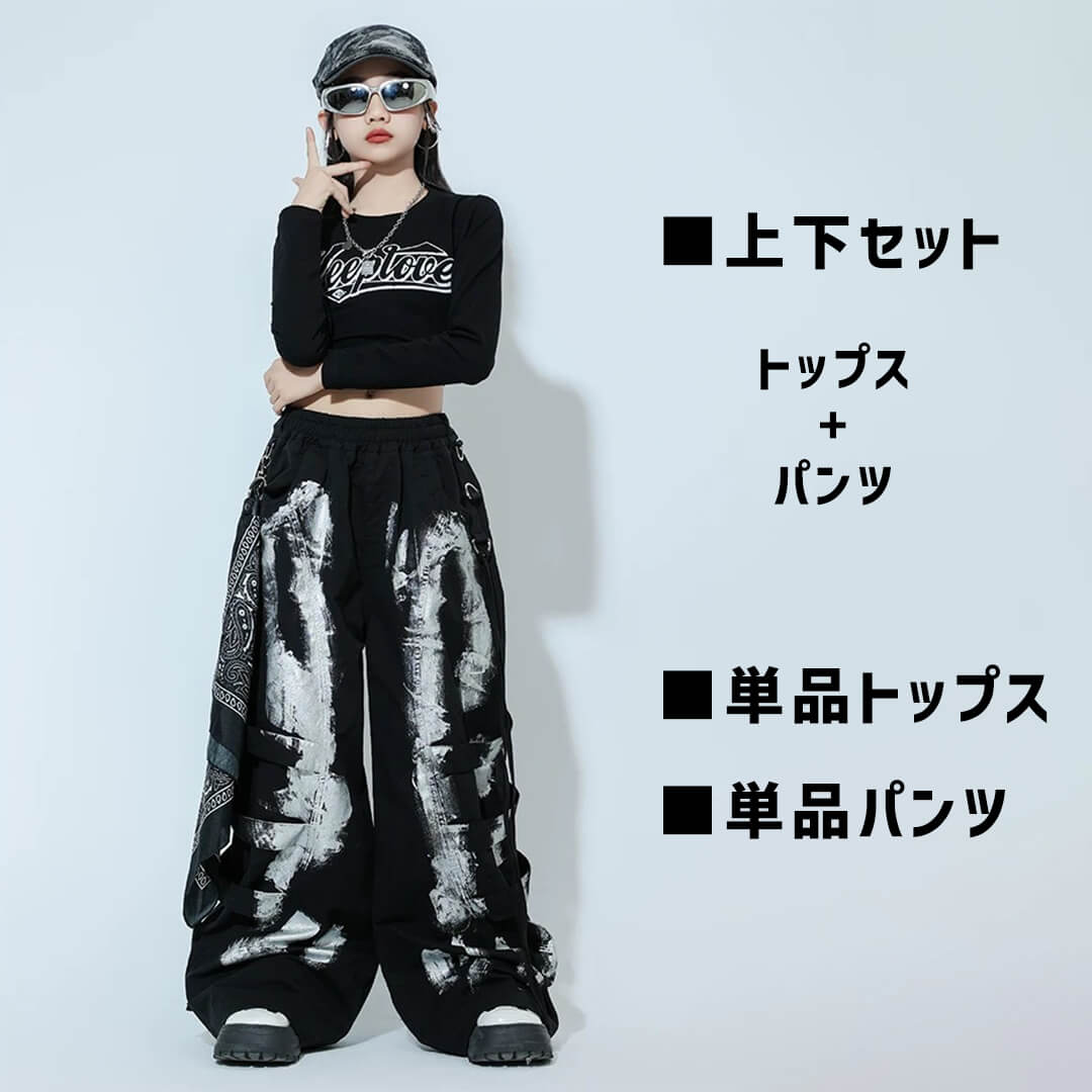 ガールズ K-POP 韓国 ブラック ロングパンツ タイダイ カーゴパンツ へそ出し 長袖 モノトーン キッズダンス キッズ衣装 120~180【dc-1892】