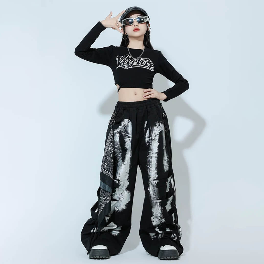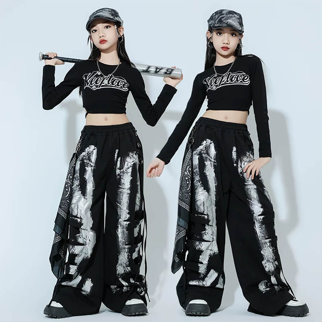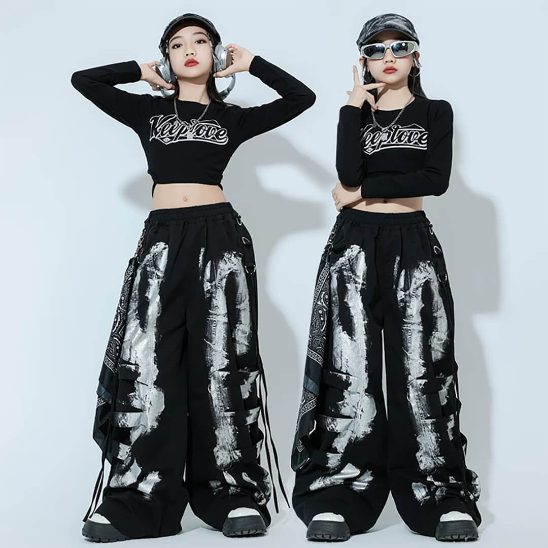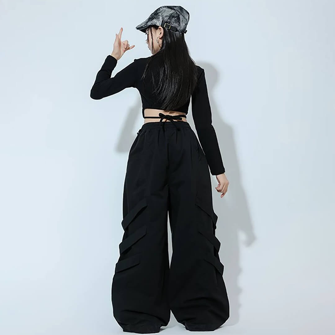 ガールズ K-POP 韓国 ブラック ロングパンツ タイダイ カーゴパンツ へそ出し 長袖 モノトーン キッズダンス キッズ衣装 120~180【dc-1892】