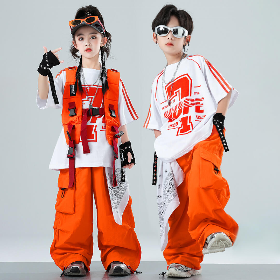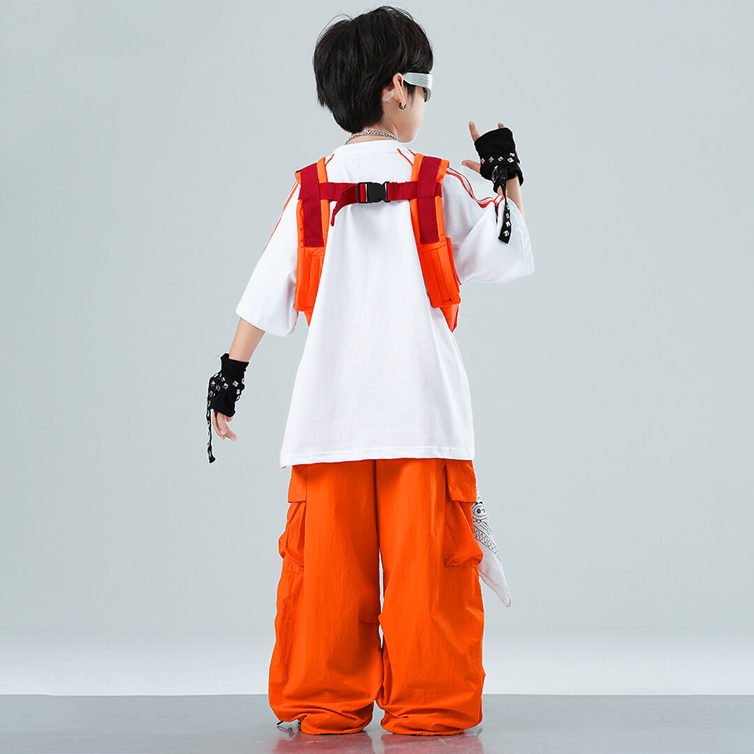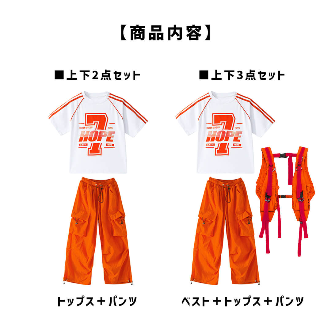 ユニセックス ユニフォーム オレンジ ホワイト ベスト 半袖 ストリート ロングパンツ カーゴパンツ ロンT オーバーサイズ【dc-2077】