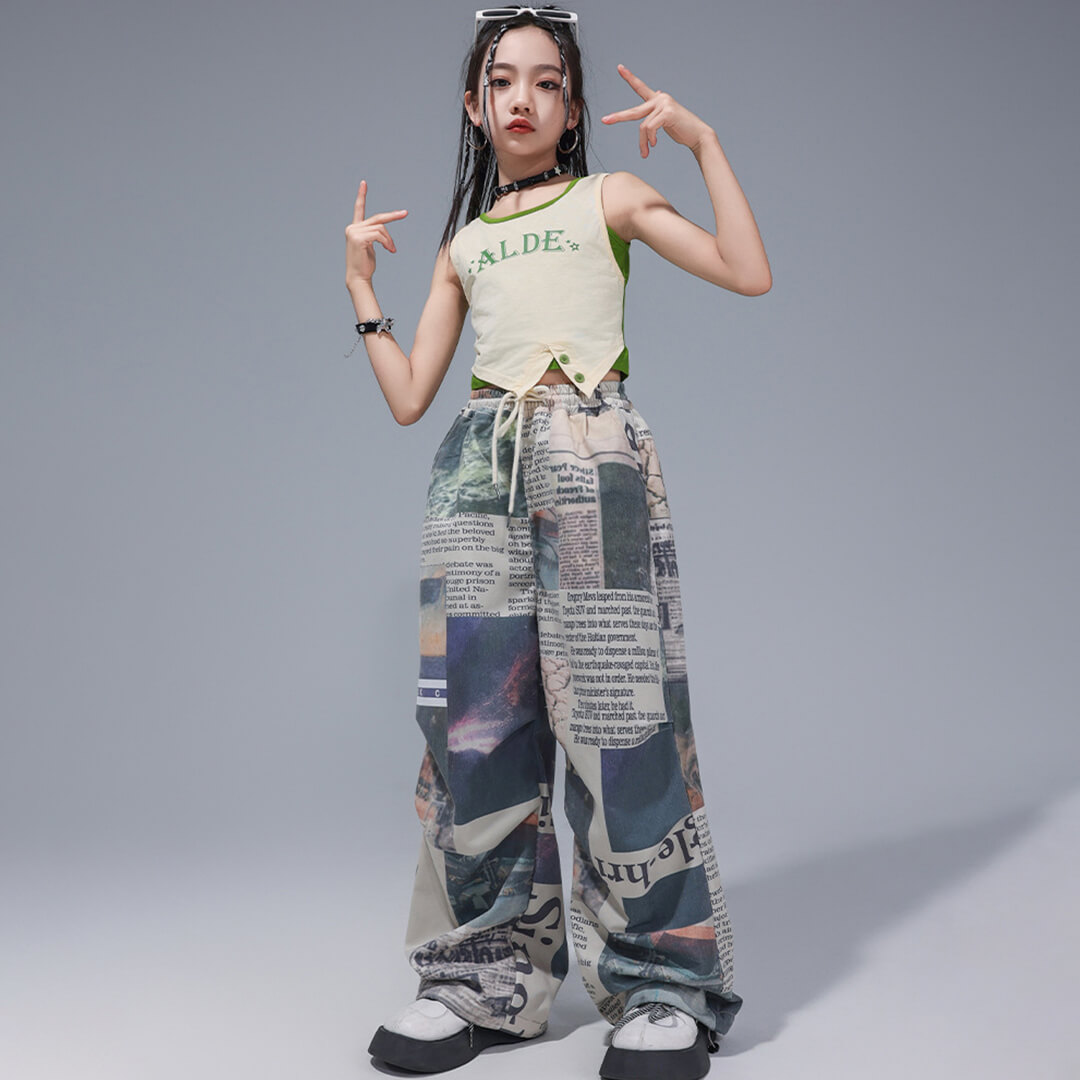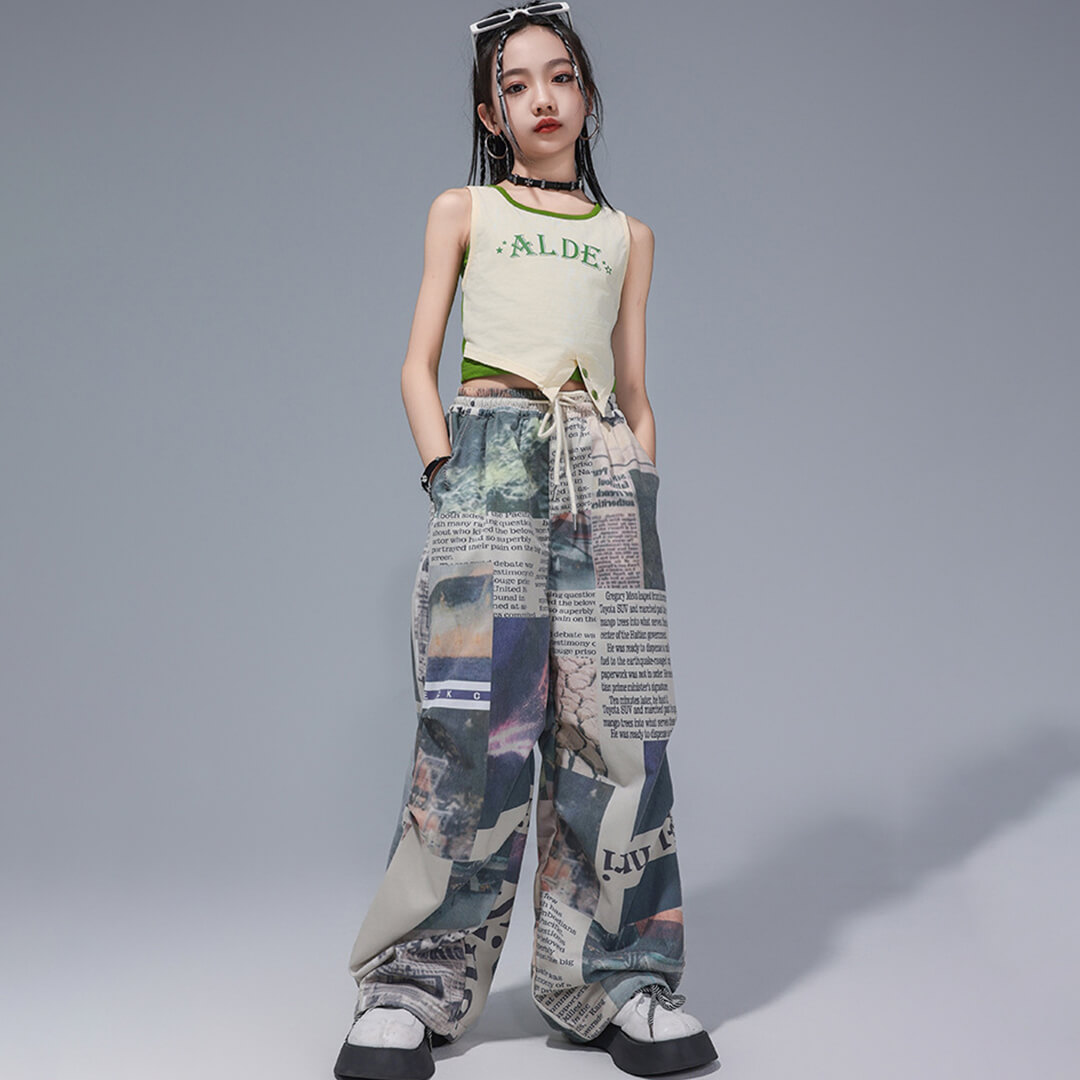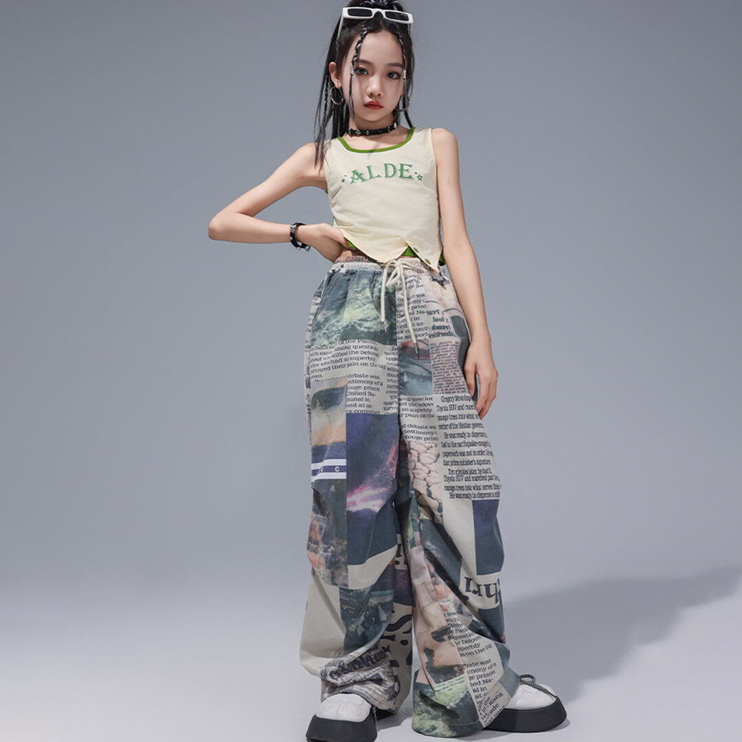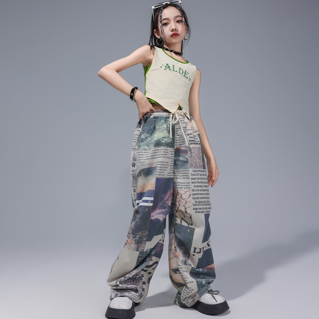 ガールズ ベージュ グリーン 柄パンツ タンクトップ へそ出し 変形トップス ノースリーブ HIPHOP【dc-2119】