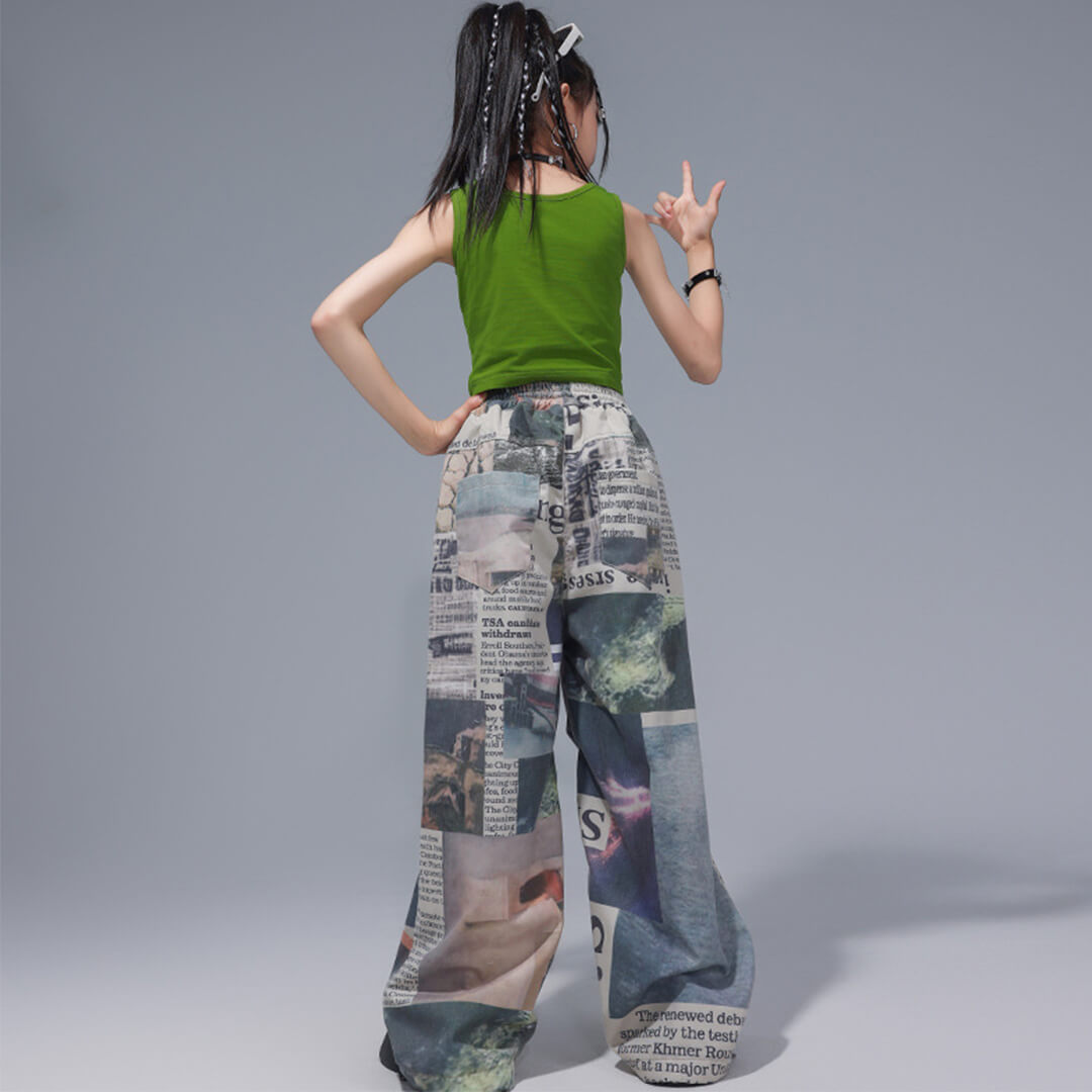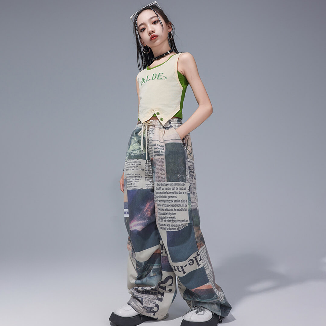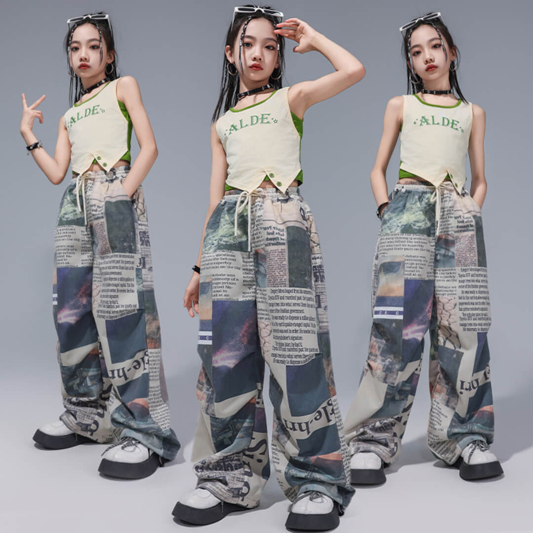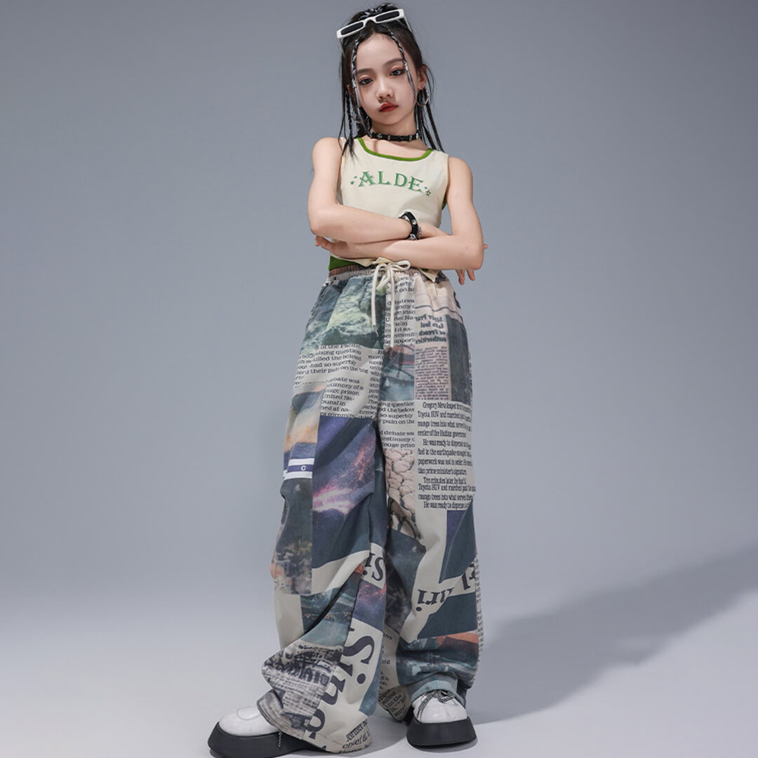 ガールズ ベージュ グリーン 柄パンツ タンクトップ へそ出し 変形トップス ノースリーブ HIPHOP【dc-2119】