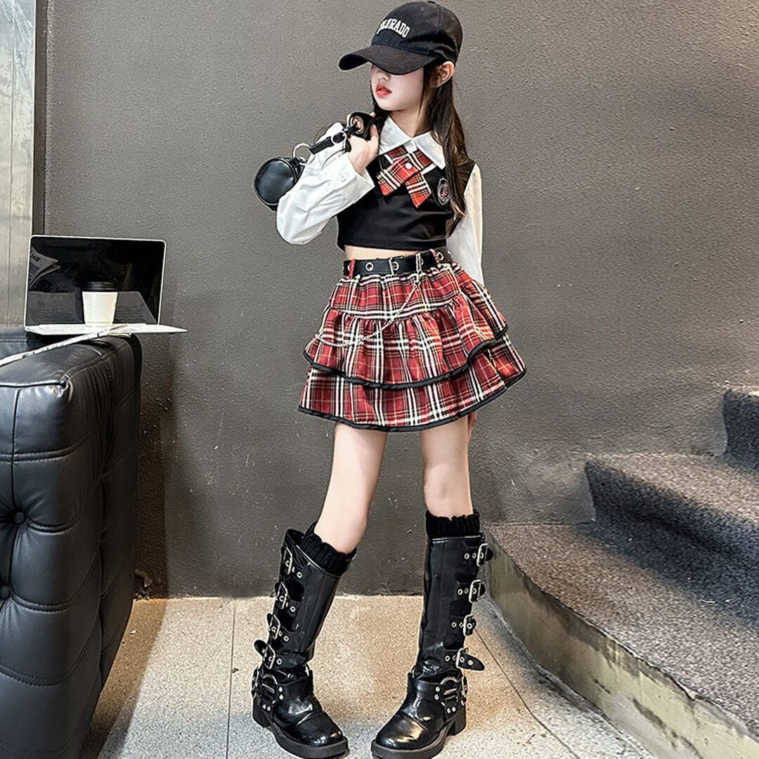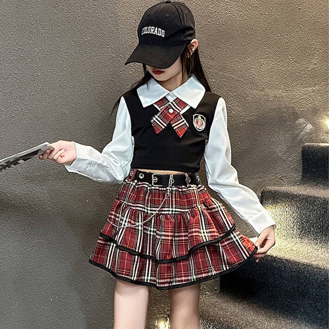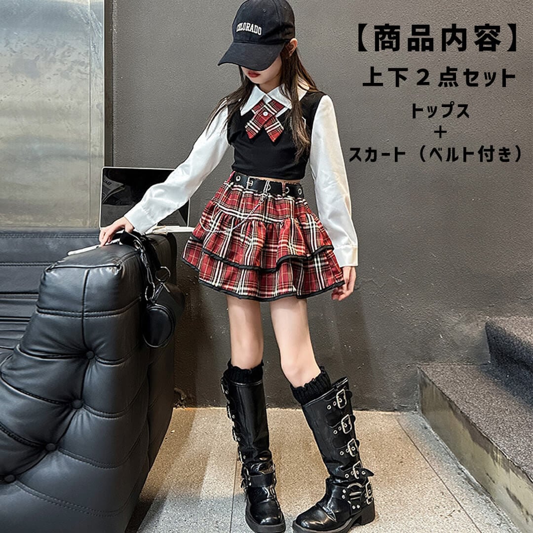 【即日配送】すぐ届く! ガールズ衣装 レッド チェック 制服 HIPHOP スカート 長袖 ベルト付き シャツ ティアードスカート 韓国 K-POP【dc-1881s】